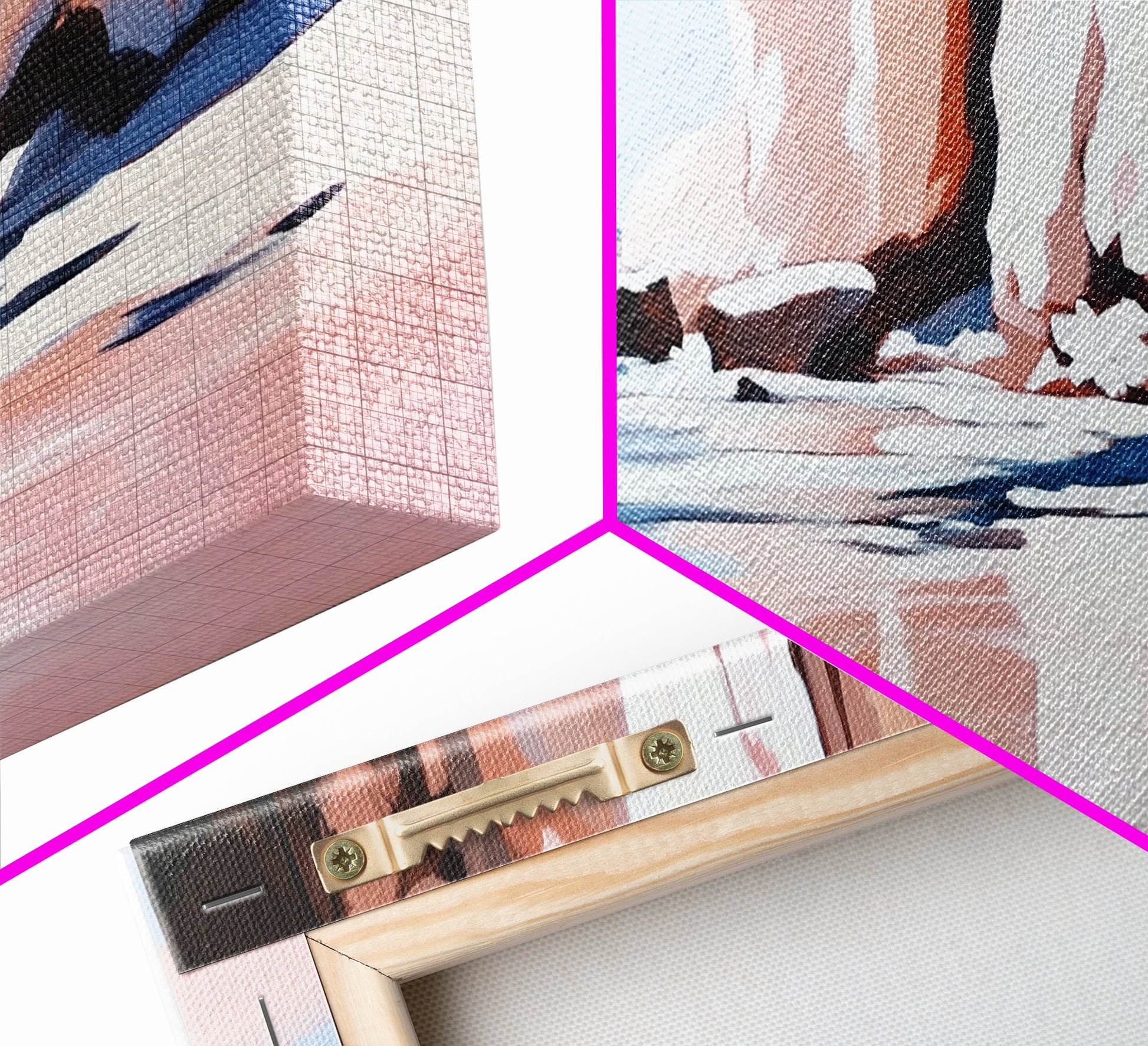 *VERSAND: Jede Leinwand wird sorgfältig in Luftpolsterfolie und Schaumstoffecken verpackt und fertig montiert und mit Zackenaufhängern in einem flachen Karton versendet. Sie benötigen lediglich einen Hammer!