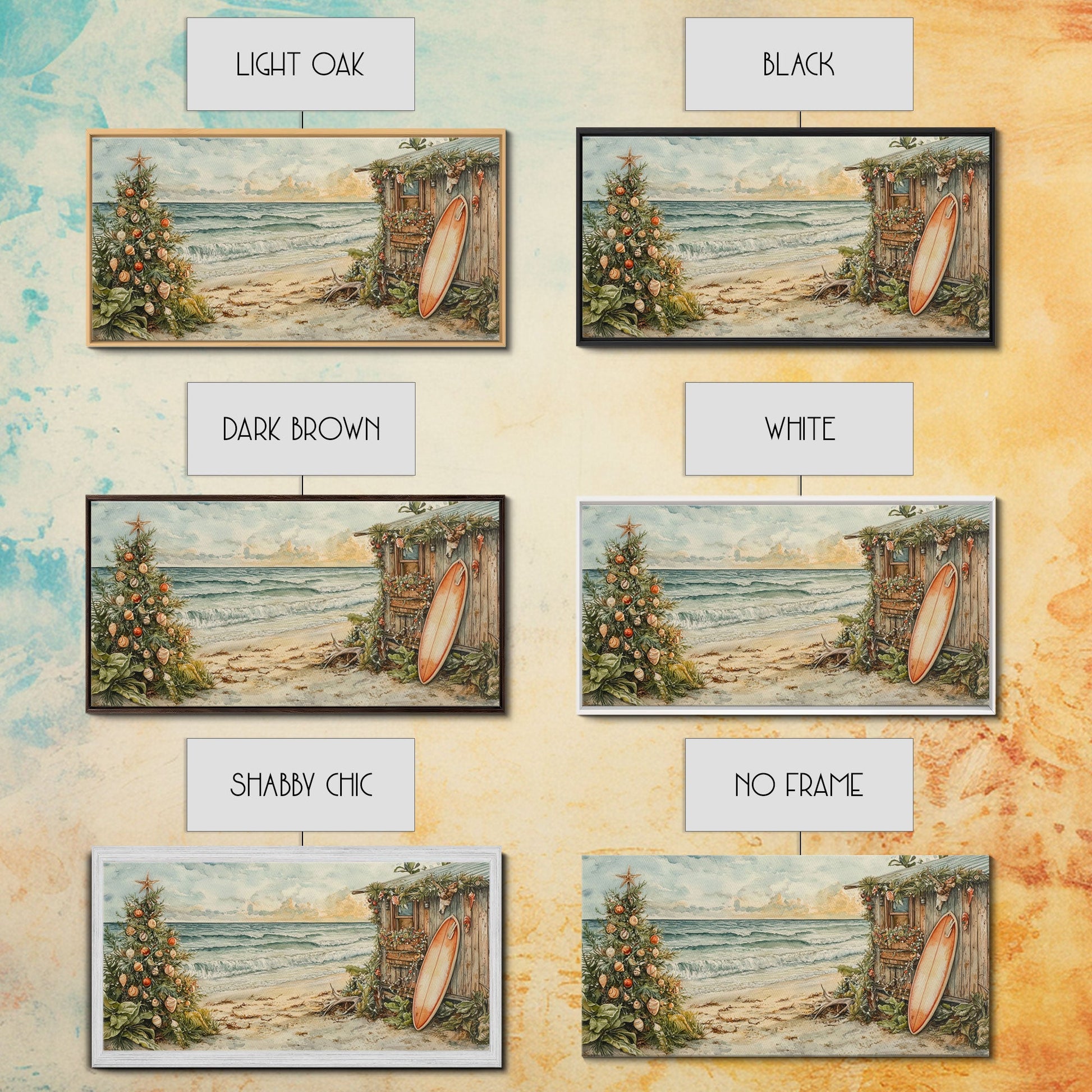 Weihnachtsbaum neben einem rustikalen Strandhaus – Küstenweihnachtsszene – gerahmter Leinwanddruck, weihnachtliche Wanddekoration für den Strand