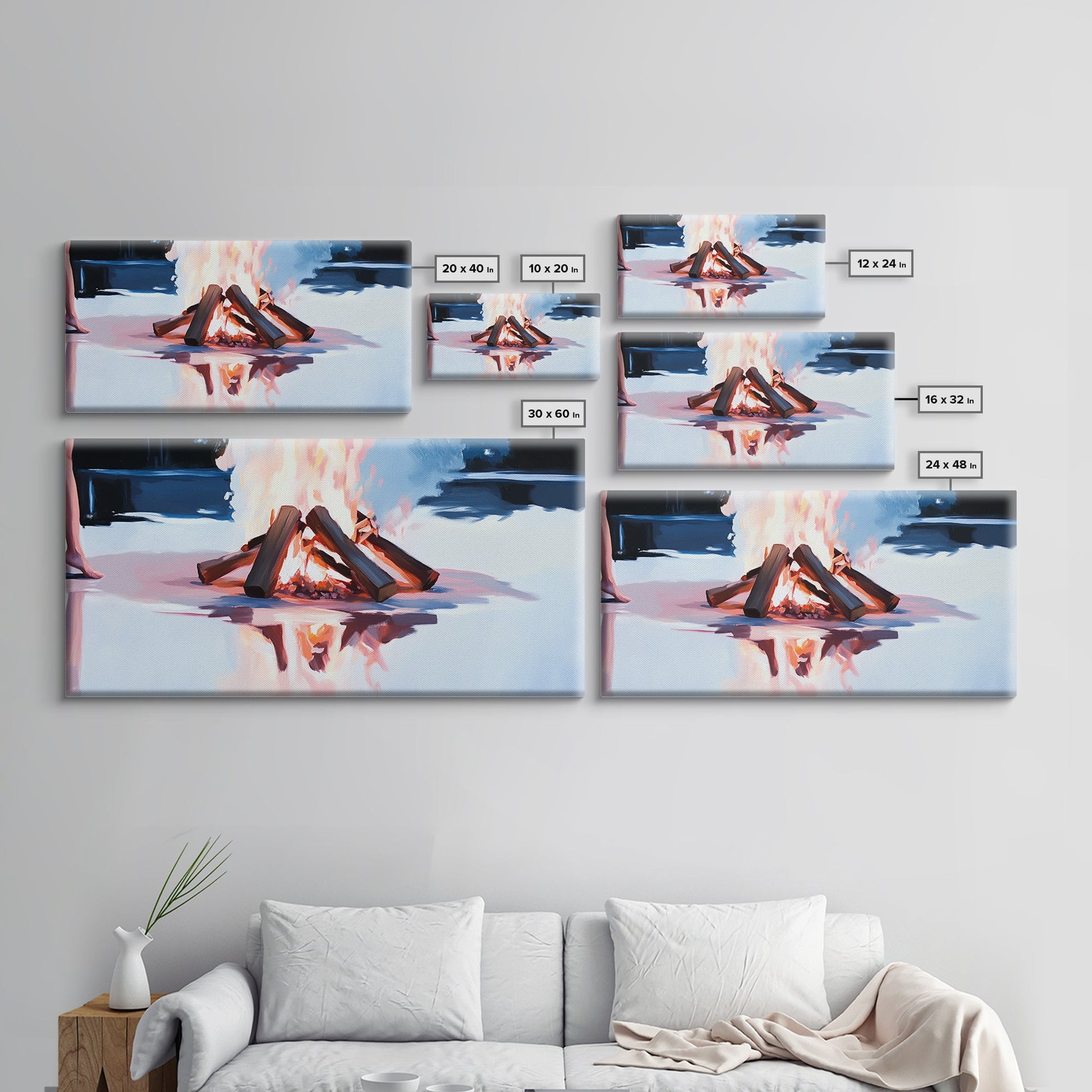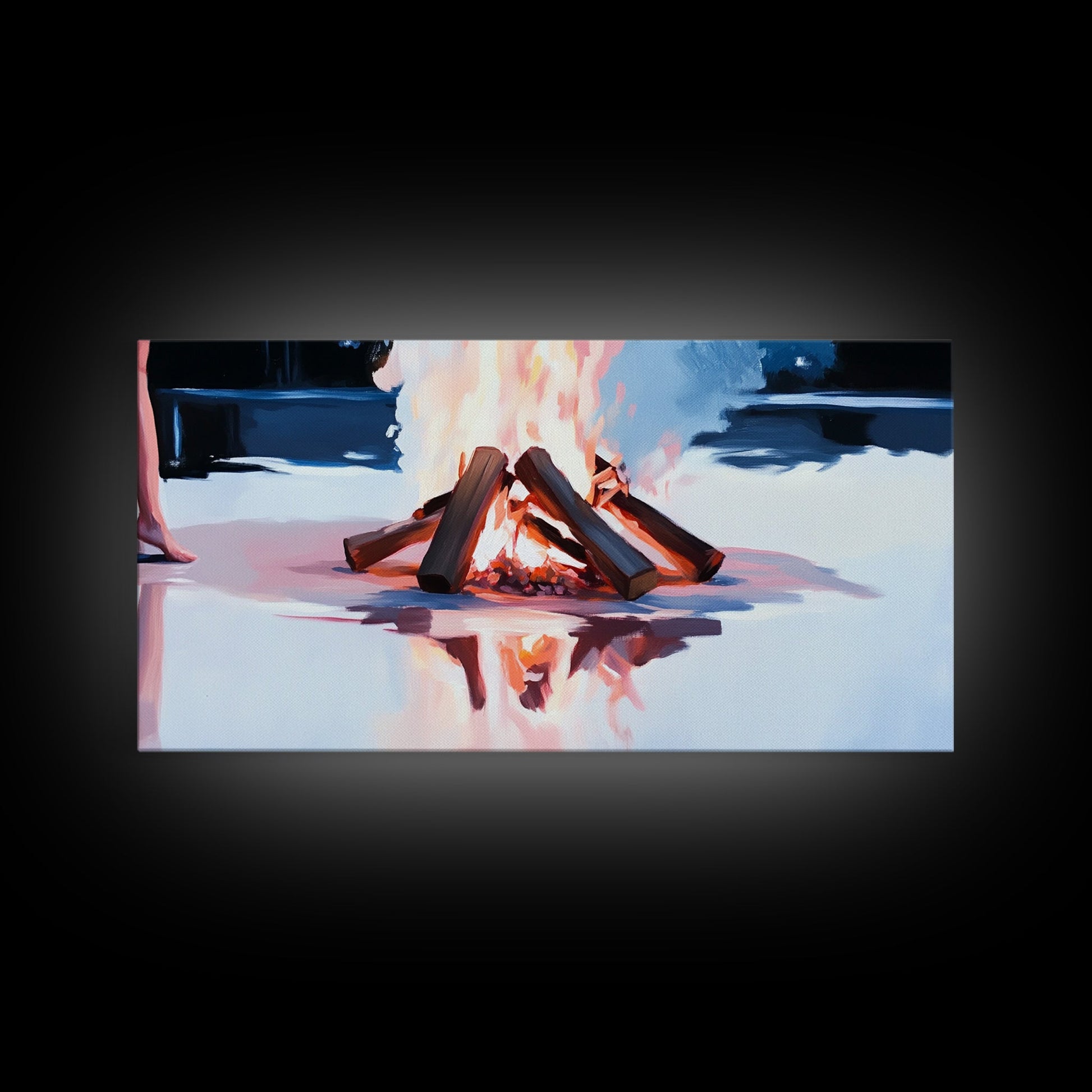Gemütliches Lagerfeuer, Feuerspiegelung, Lagerfeuerglühen, Herbstnacht, gerahmter Leinwanddruck, Wandbild für die Hütte, rustikale Dekoration, warme Atmosphäre, Herbstkunst