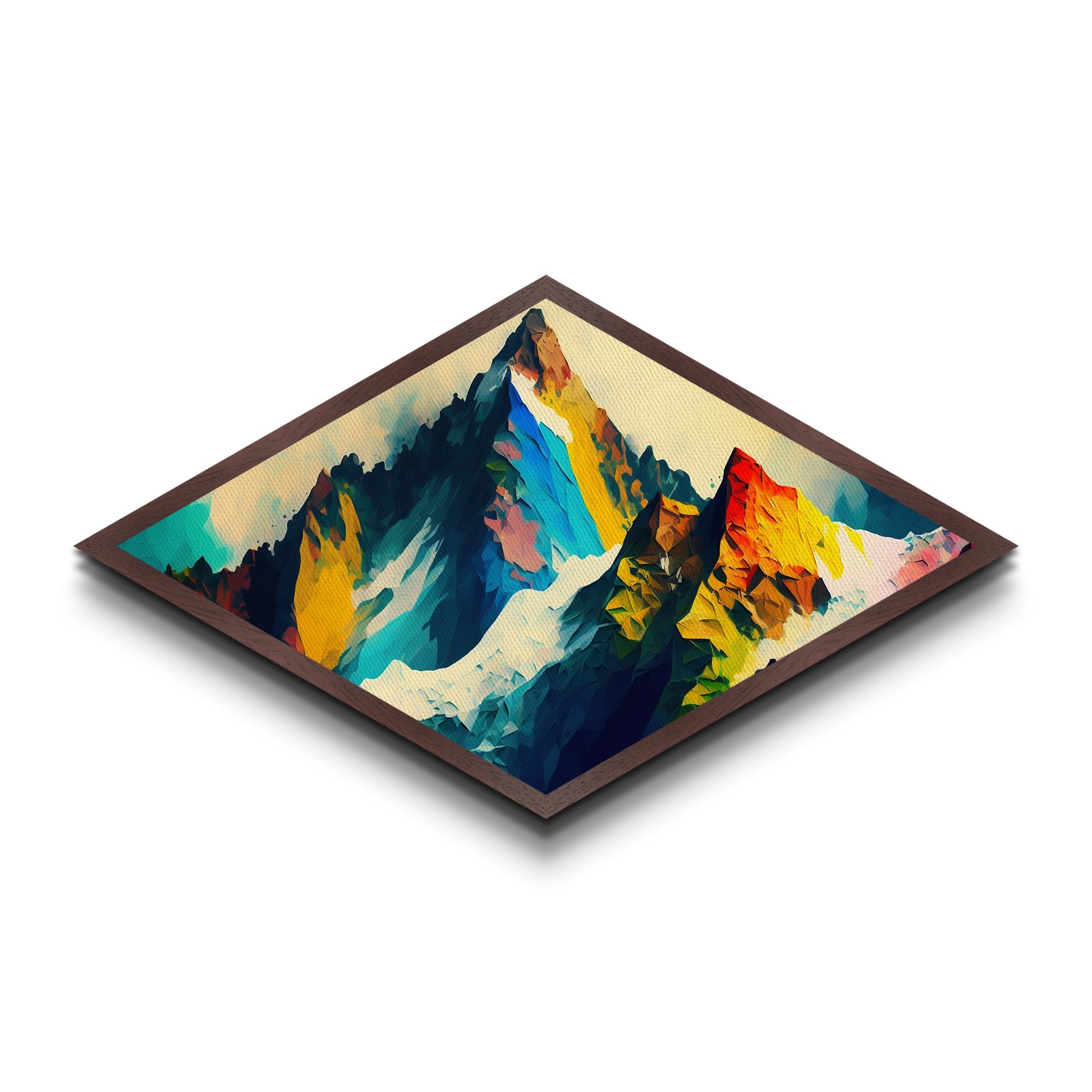 Kristalline Alpen – Rautenförmiger abstrakter Regenbogengipfel-Leinwanddruck mit polygonalem Bergpanorama und kräftigen geometrischen Strichen