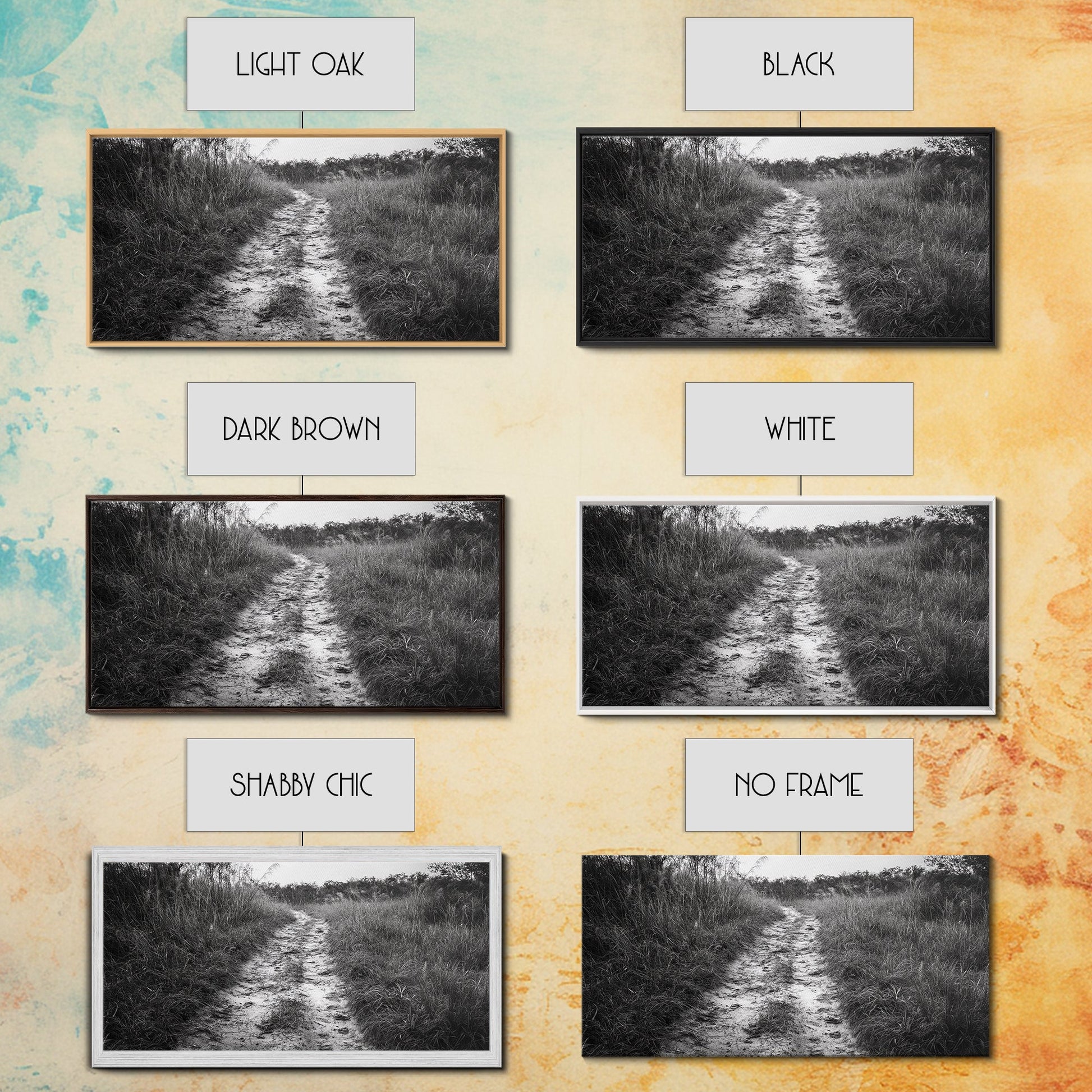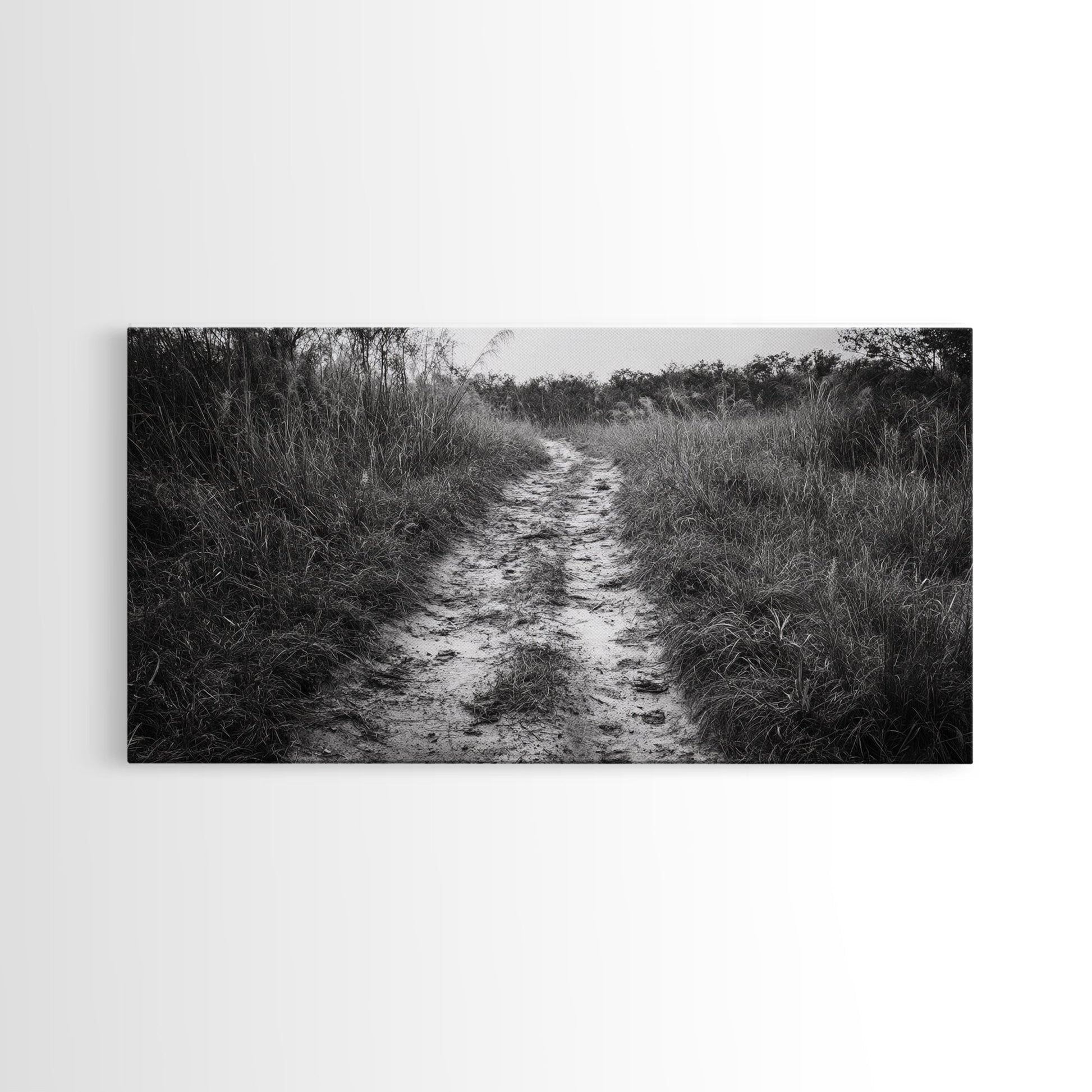 Naturpfad, minimalistische Naturfotografie, ländliche Landschaft, rustikale Herbst-Wandkunst, neutrale Wohndekoration, gerahmter Leinwanddruck