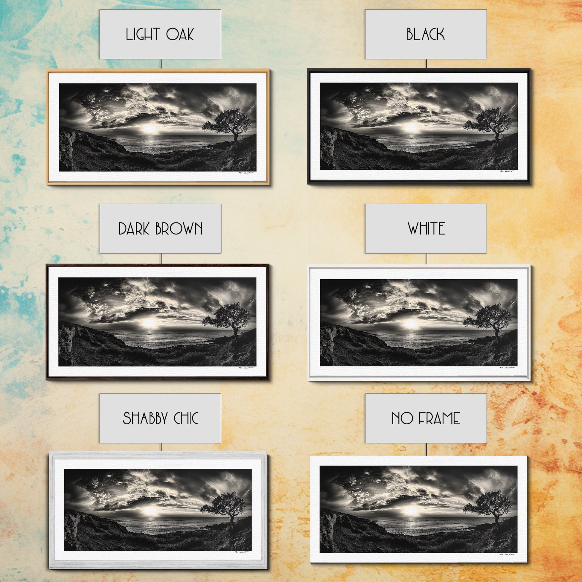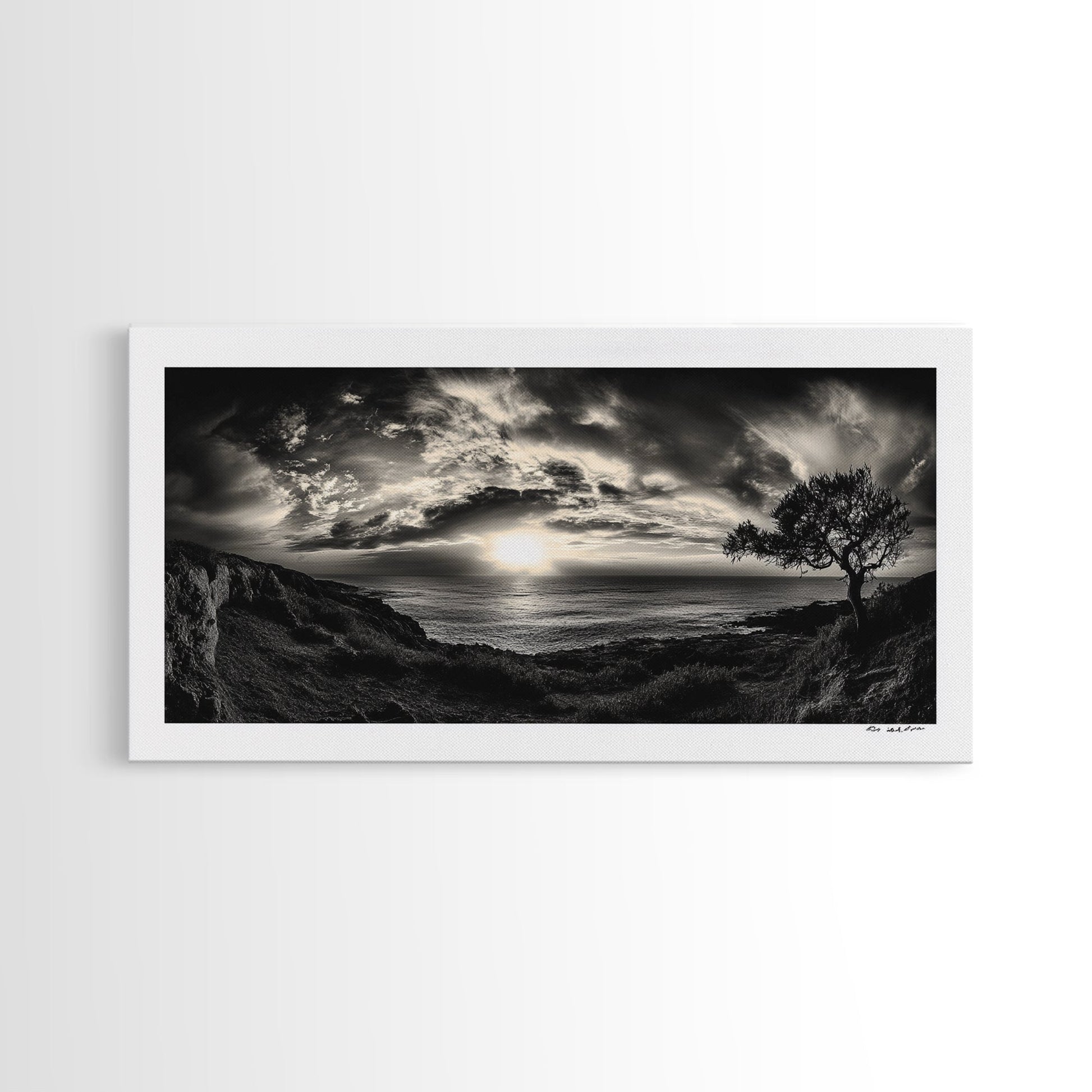 Dramatischer Sonnenuntergang über dem Meer, Küstenbaum, monochrome Landschaft, Leinwanddruck, Wandbild fürs Wohnzimmer, surreale Naturansicht, Meeresblick-Druck