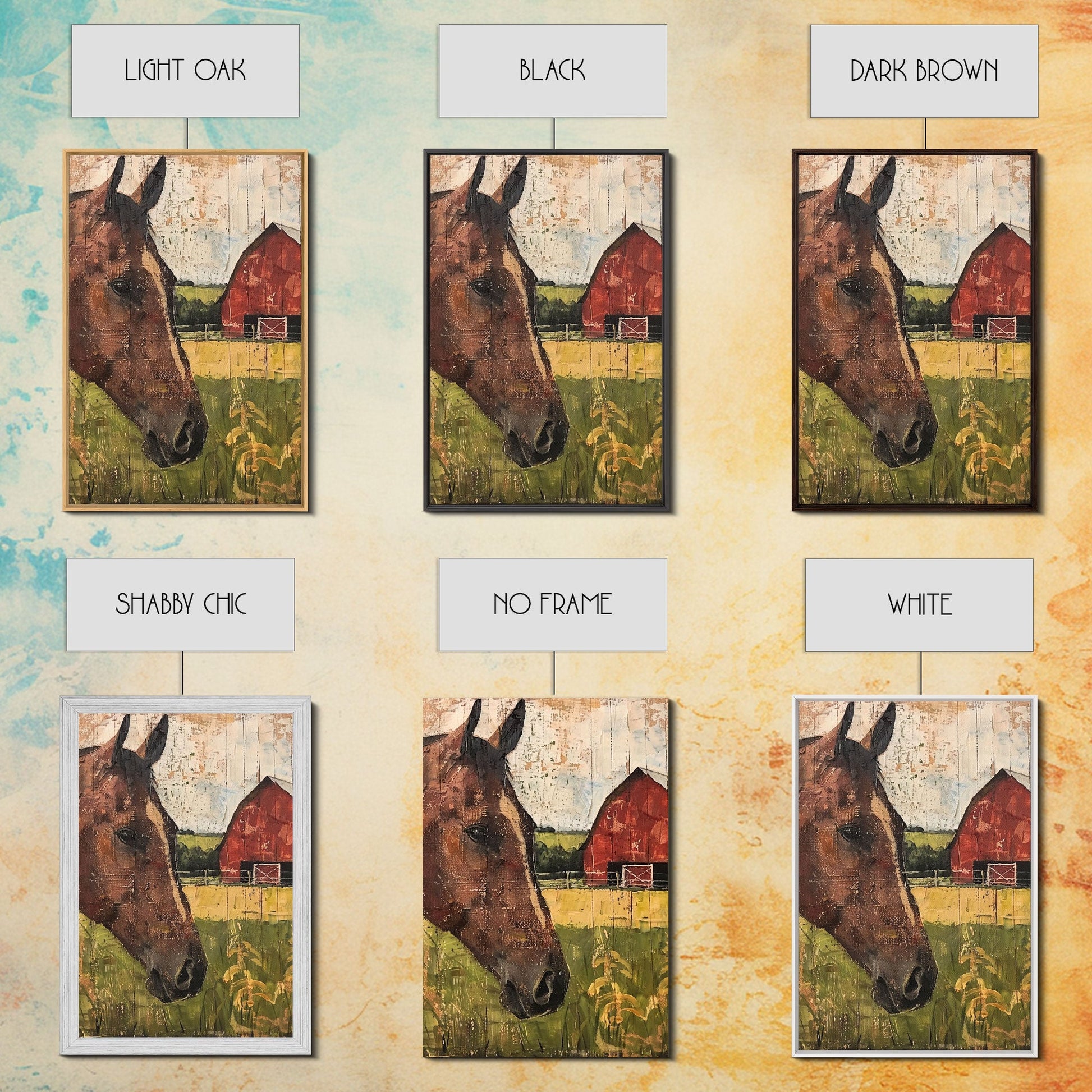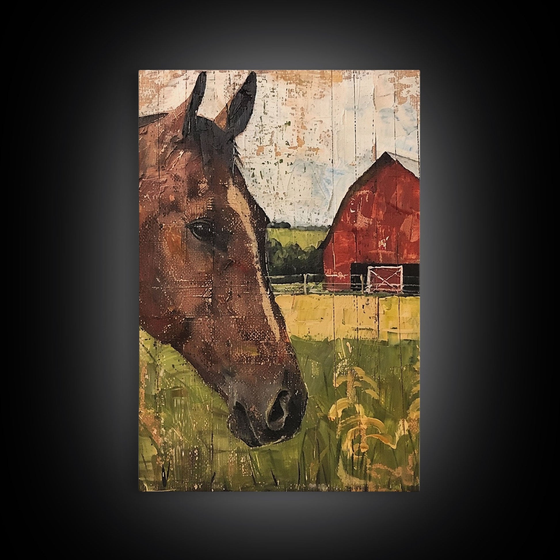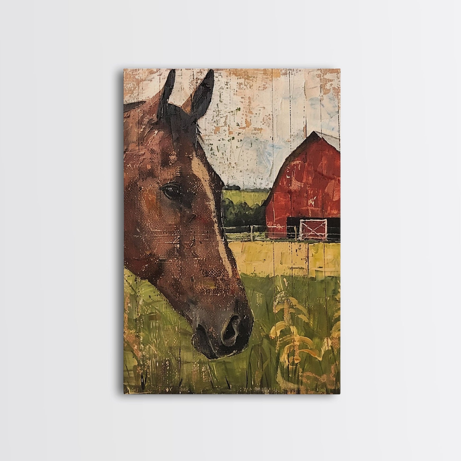 Rustikale Bauernhofkunst mit Pferd und Scheune – Gerahmter Leinwanddruck, Wohnzimmerdekoration im Landhausstil, Wandbild mit Pferden, rustikale Wohndekoration