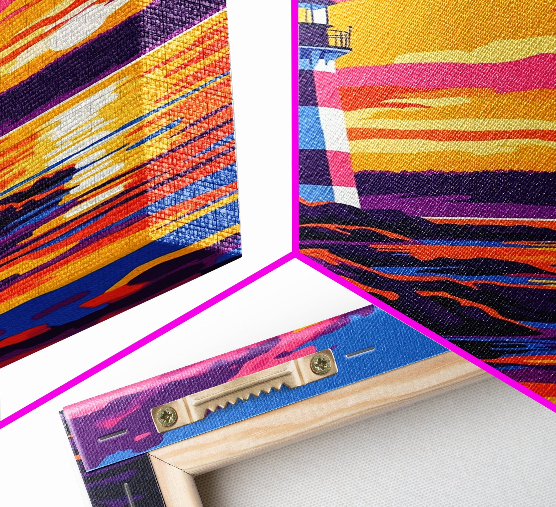 Leuchtturm, Sonnenuntergang, Küste, Meereslandschaft, gerahmter Leinwanddruck, nautische Dekoration, Wandbild fürs Strandhaus, lebendiges Ozeangemälde, Wohnzimmerkunst