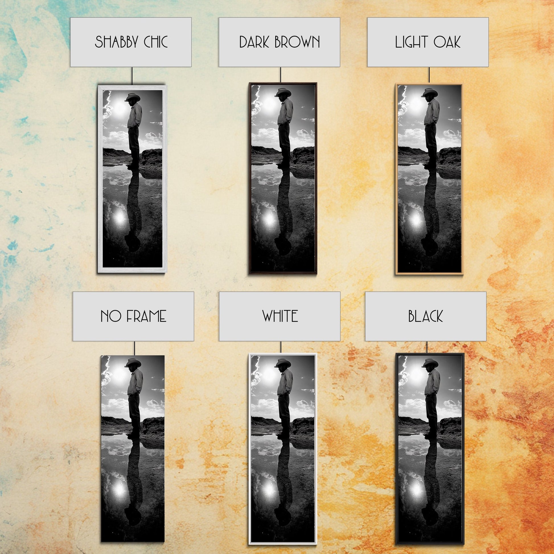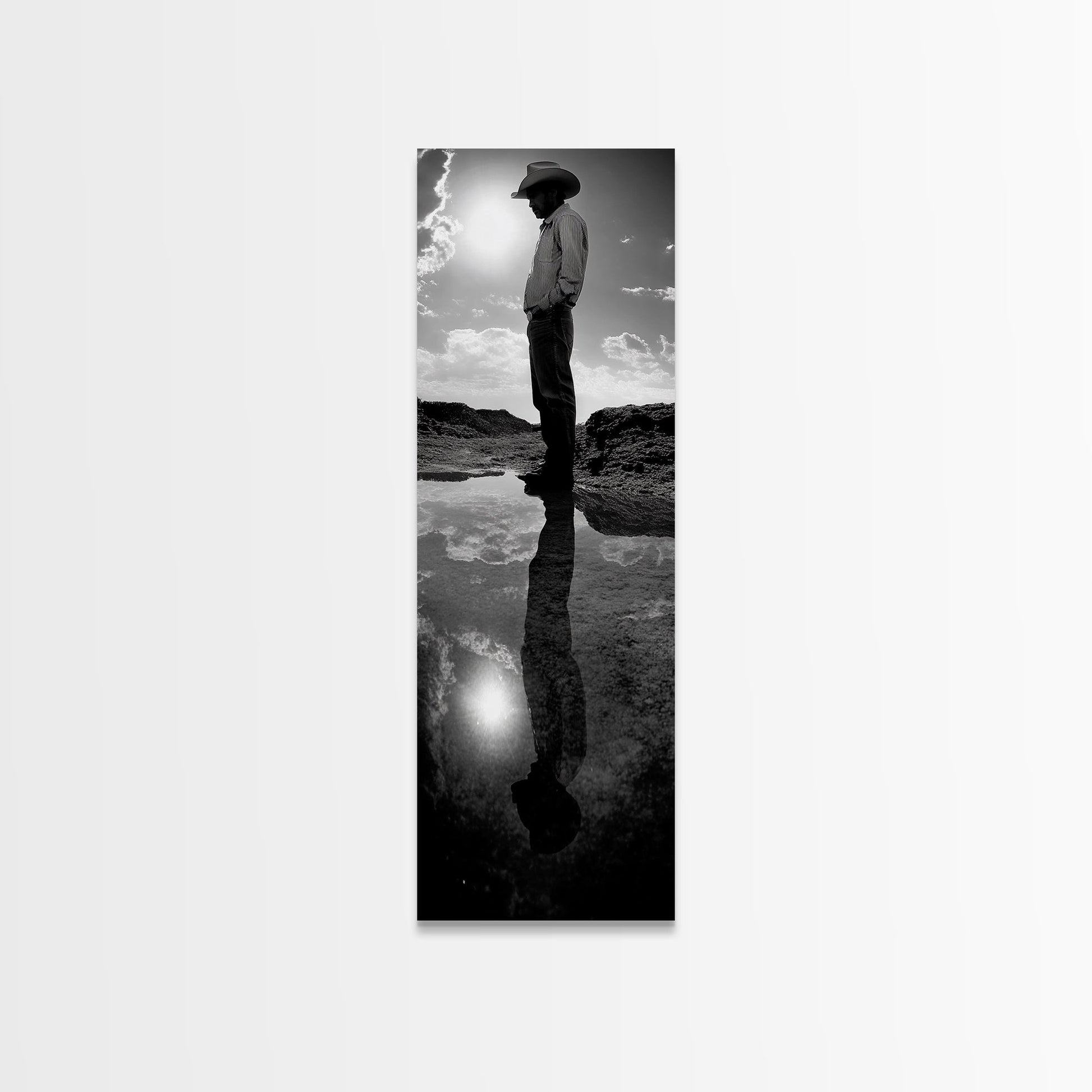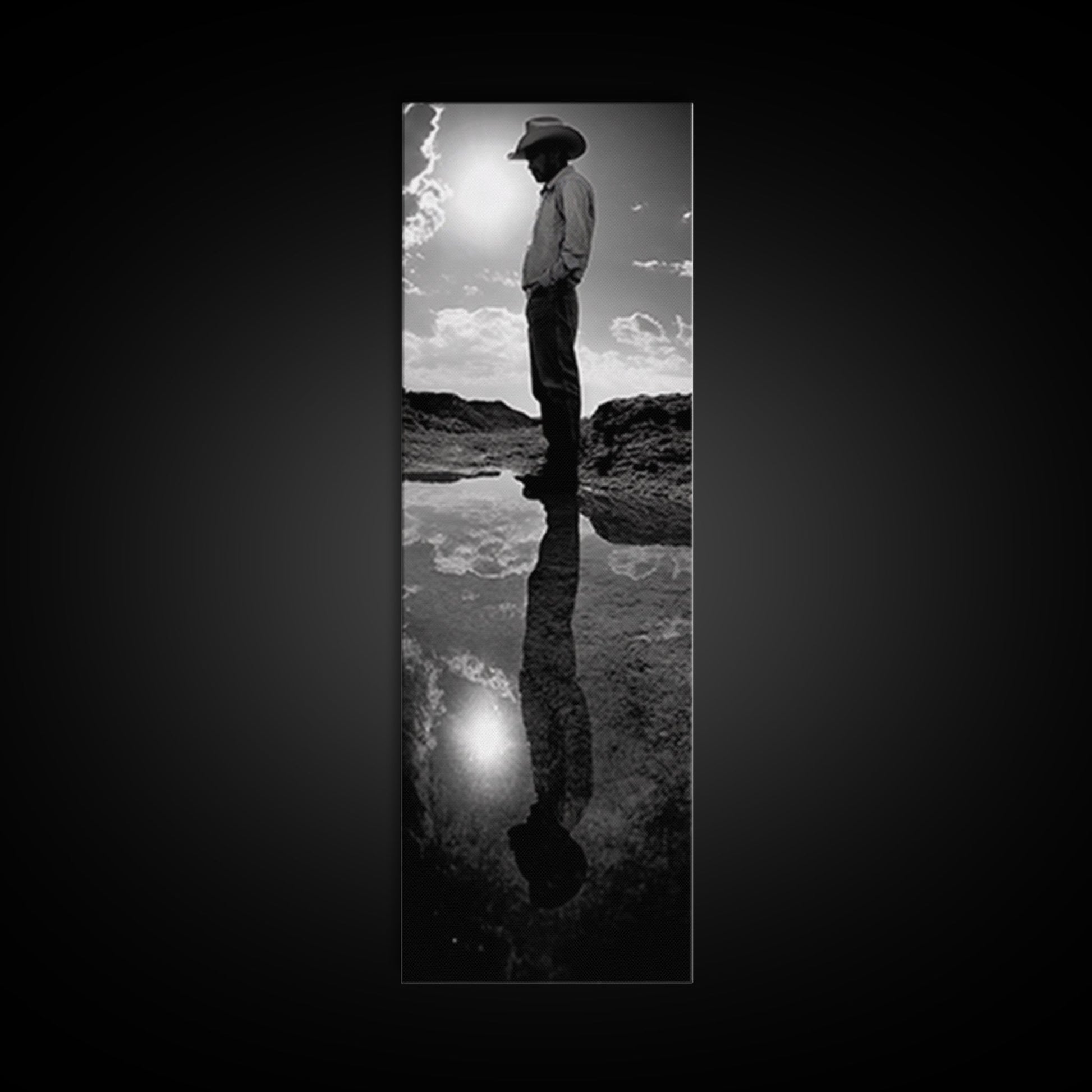 Lone Cowboy, Spiegelungsfotografie, gerahmter Leinwanddruck, rustikale Kunst, stimmungsvolle Wandkunst, extra breites Kunstwerk, Südwest-Wandkunst