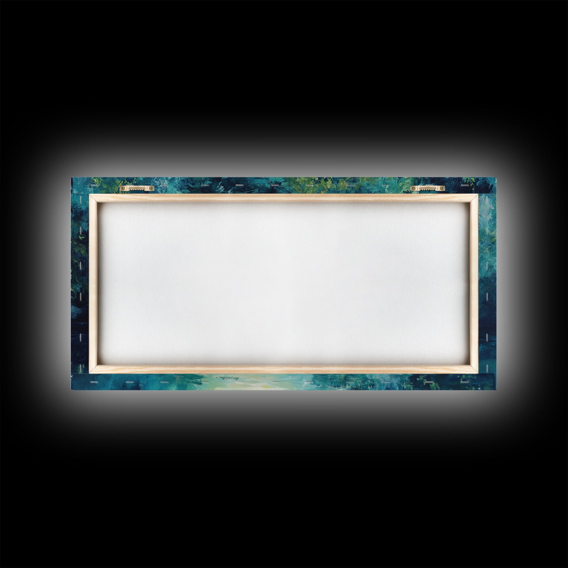 Mystischer Fluss, gerahmter Leinwanddruck, Landschaftsmalerei, stimmungsvolle Kunst, Wald in der Abenddämmerung, türkisfarbenes Wandbild, extra breites Bild