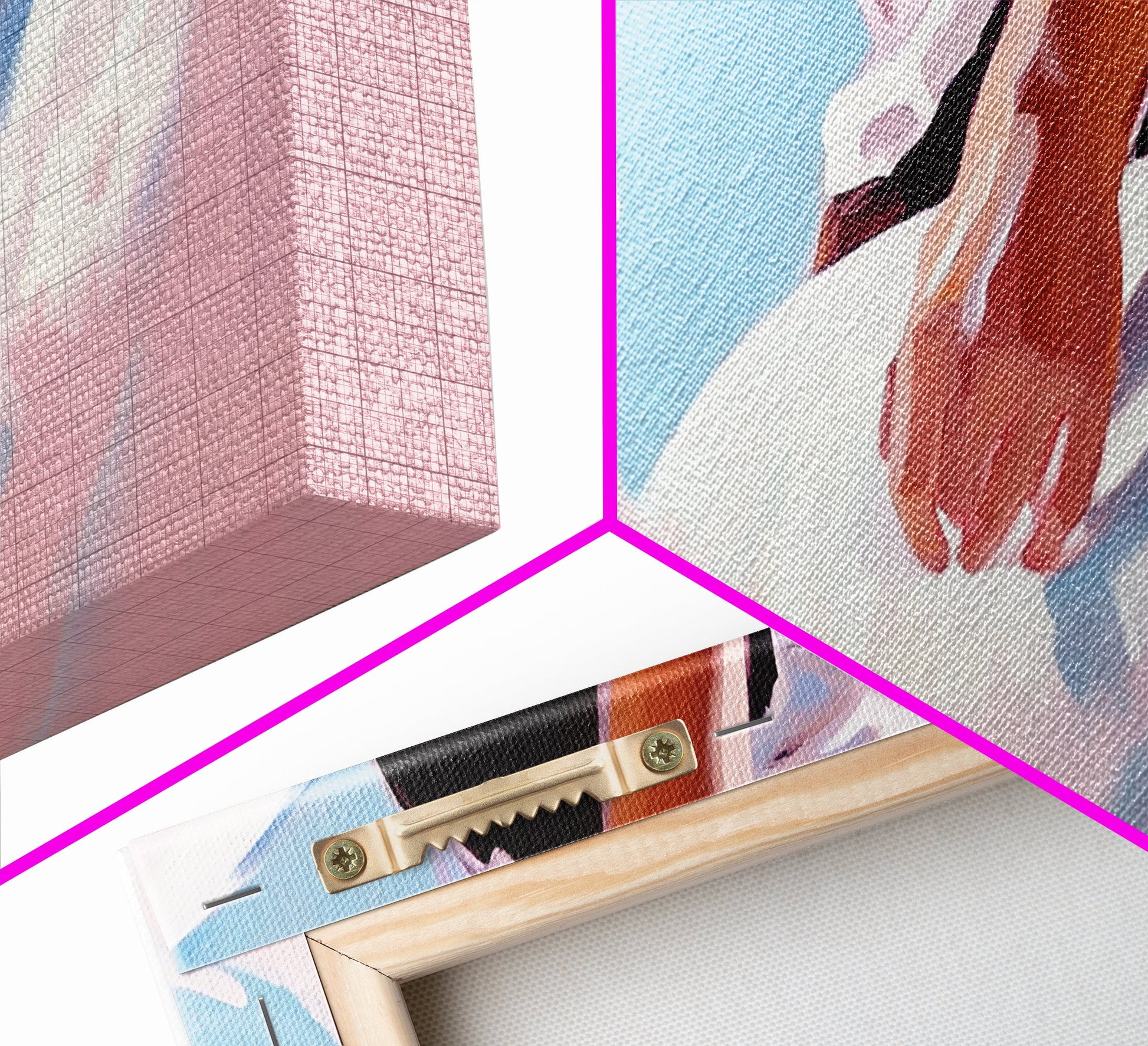 *VERSAND: Jede Leinwand wird sorgfältig in Luftpolsterfolie und Schaumstoffecken verpackt und fertig montiert und mit Zackenaufhängern in einem flachen Karton versendet. Sie benötigen lediglich einen Hammer!