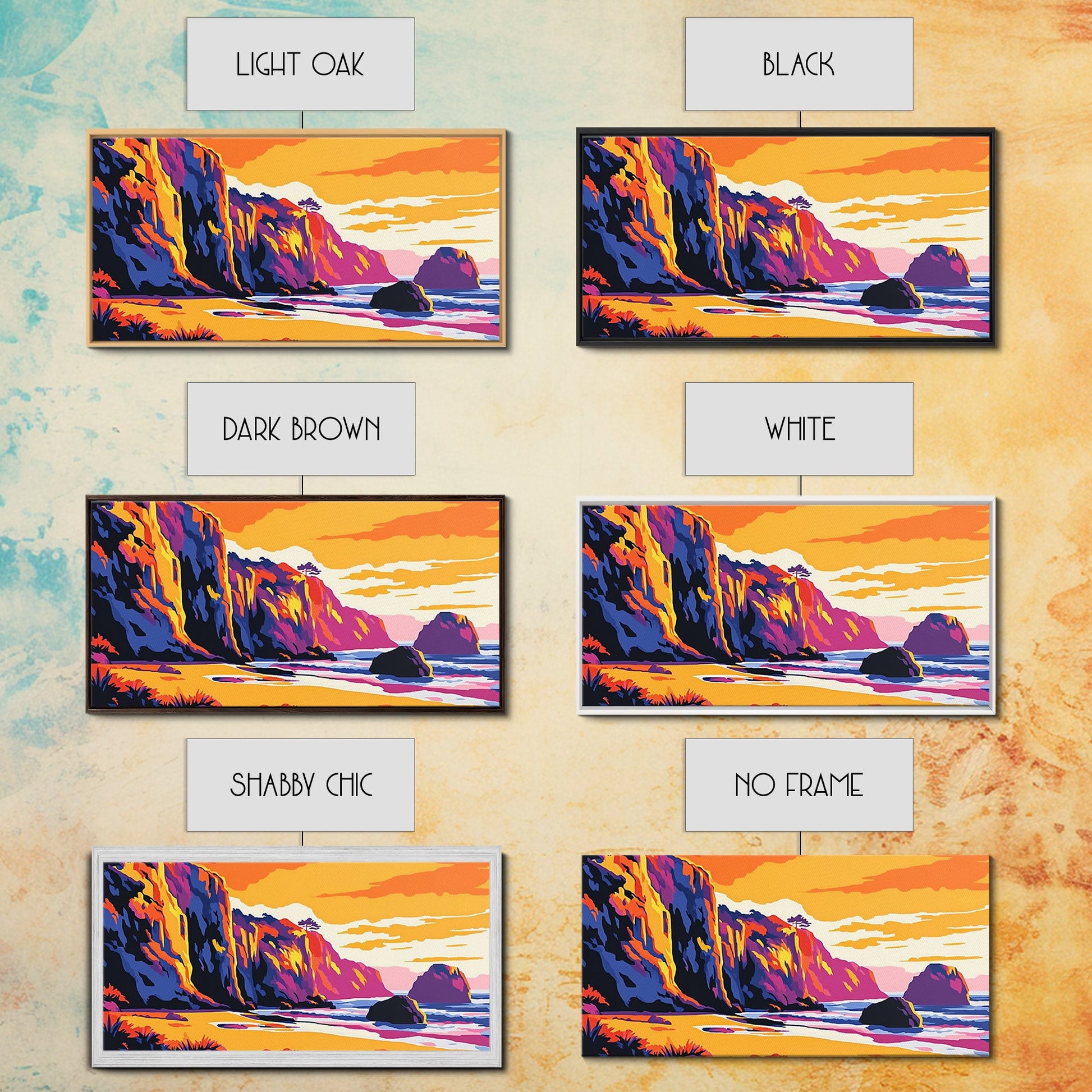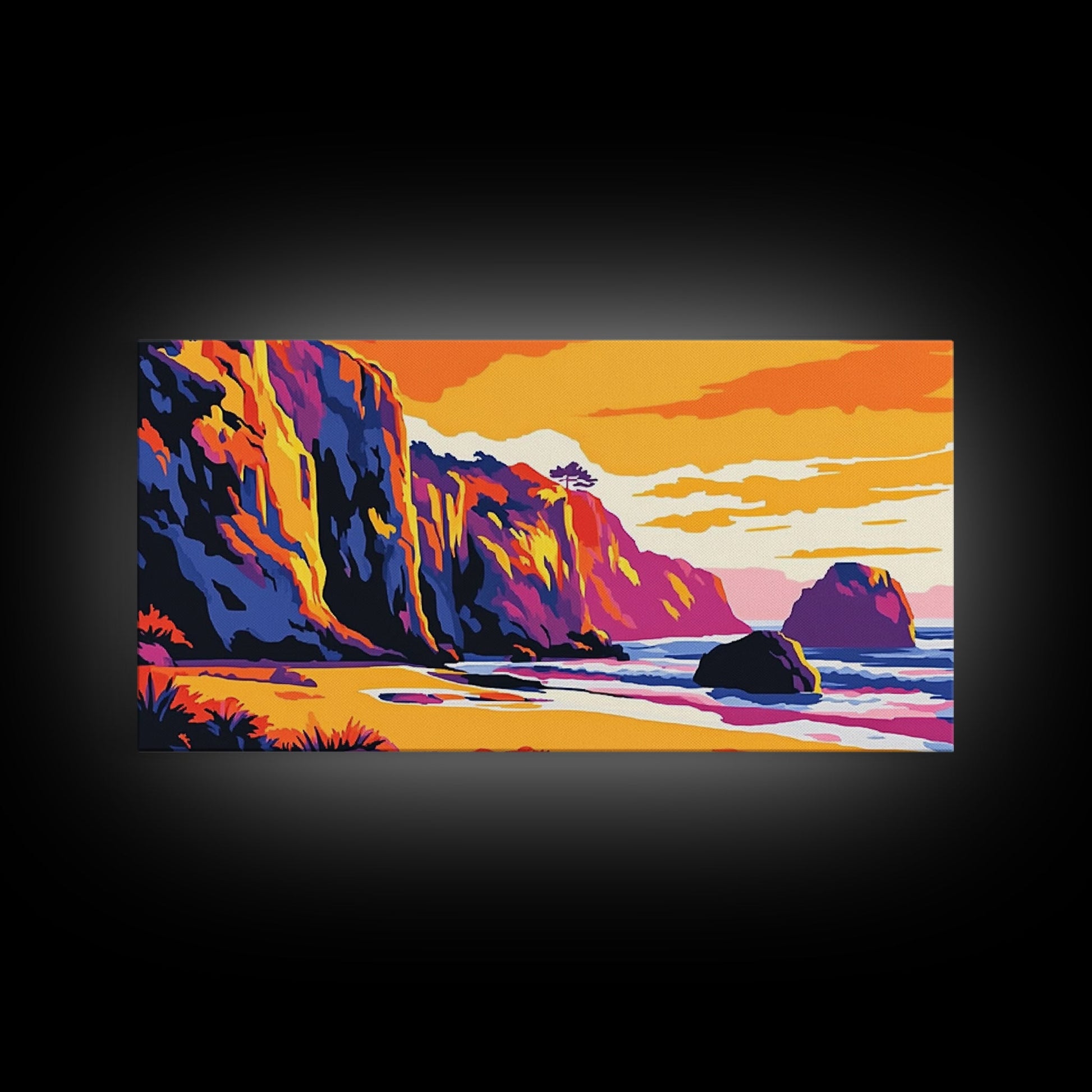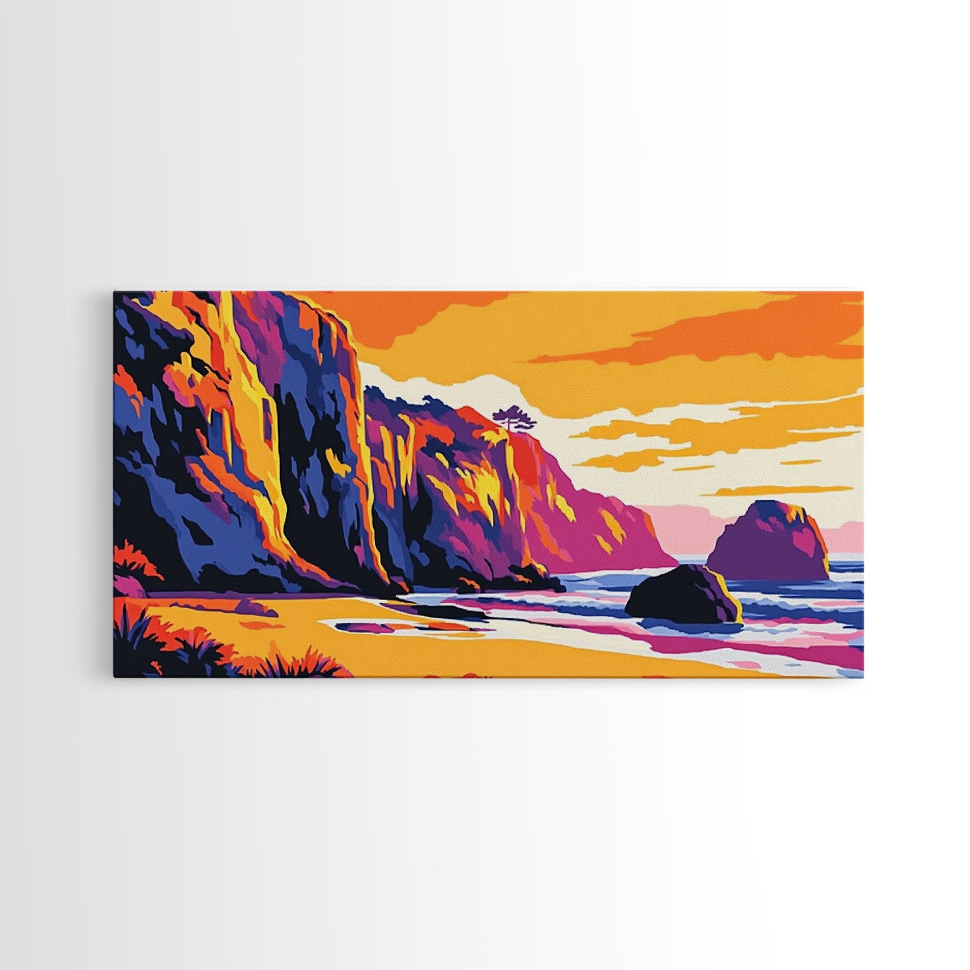 Meeresklippen, Küsten-Sonnenuntergangskunst, Lebendiges Meereslandschaftsgemälde, Strandwanddekoration, Gerahmter Leinwanddruck, Maritime Wohngestaltung, Bürokunst