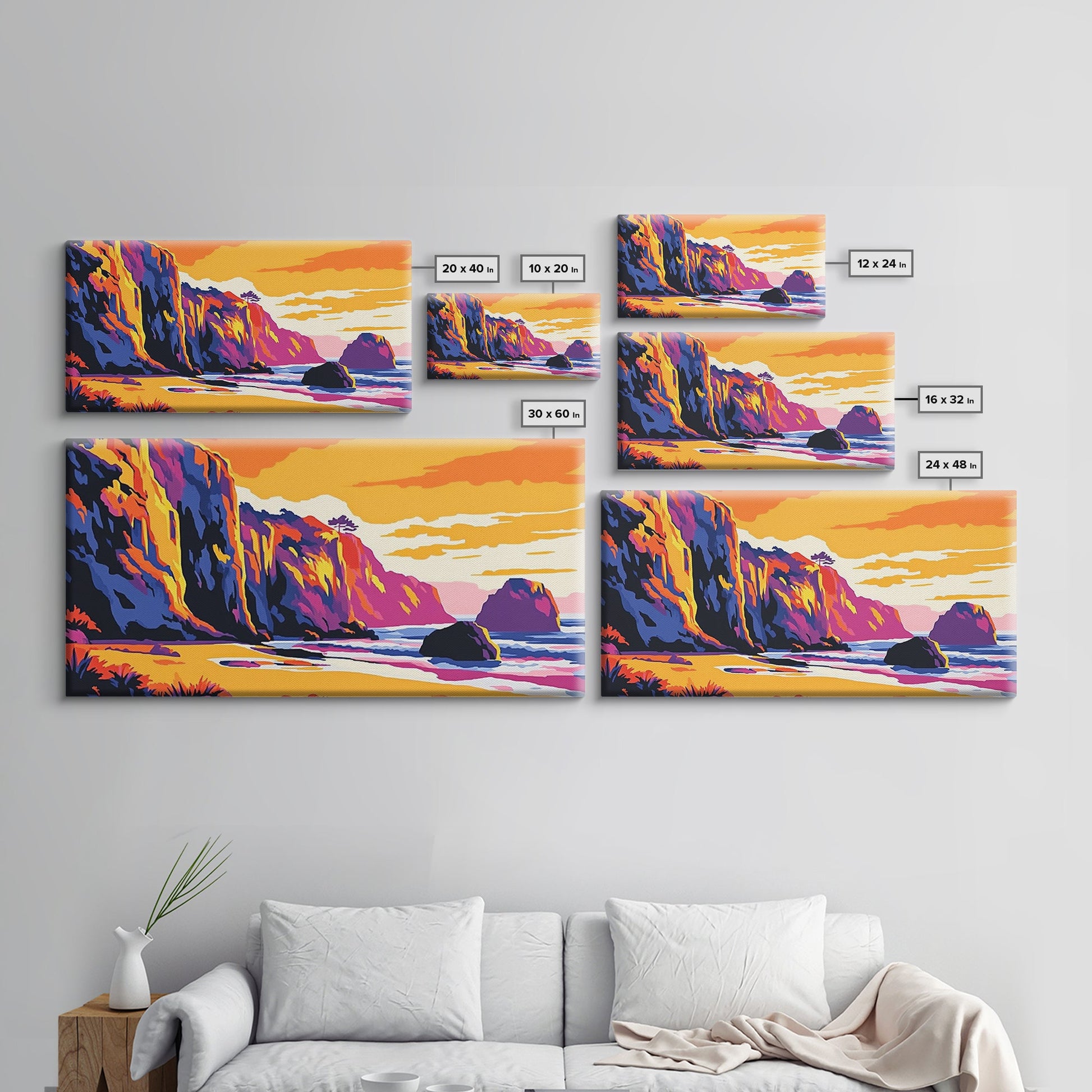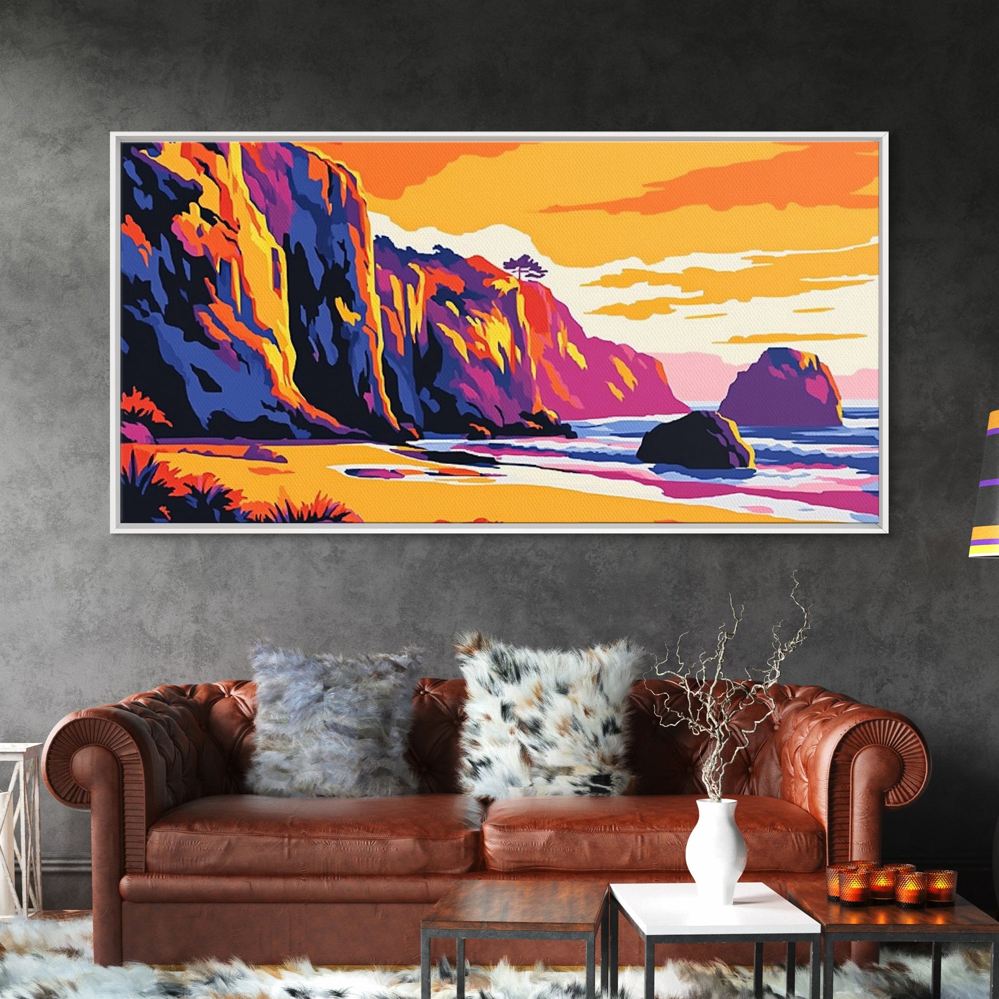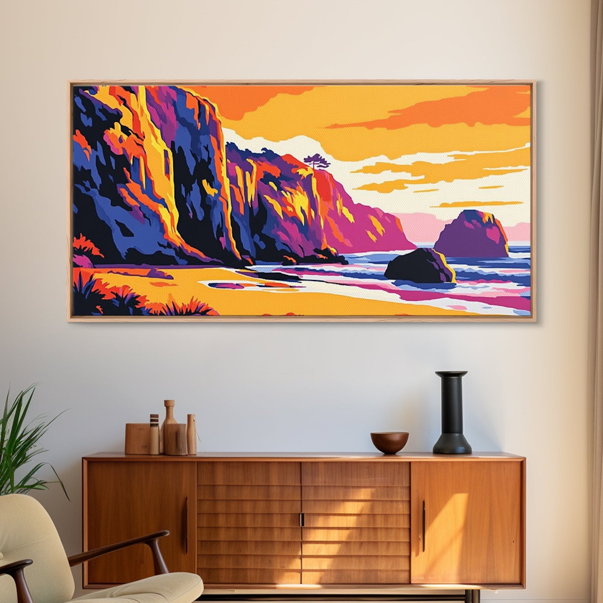 Meeresklippen, Küsten-Sonnenuntergangskunst, Lebendiges Meereslandschaftsgemälde, Strandwanddekoration, Gerahmter Leinwanddruck, Maritime Wohngestaltung, Bürokunst