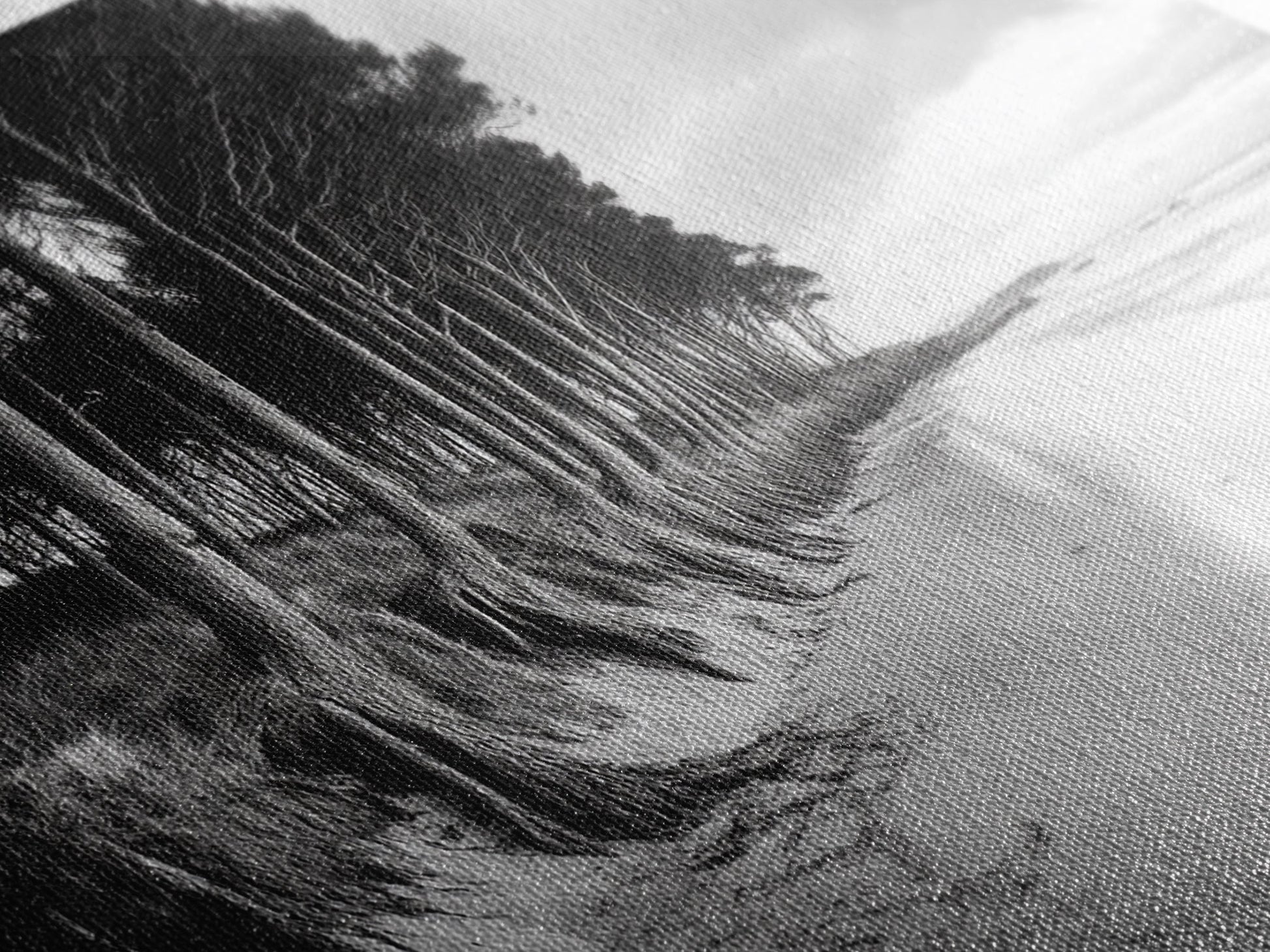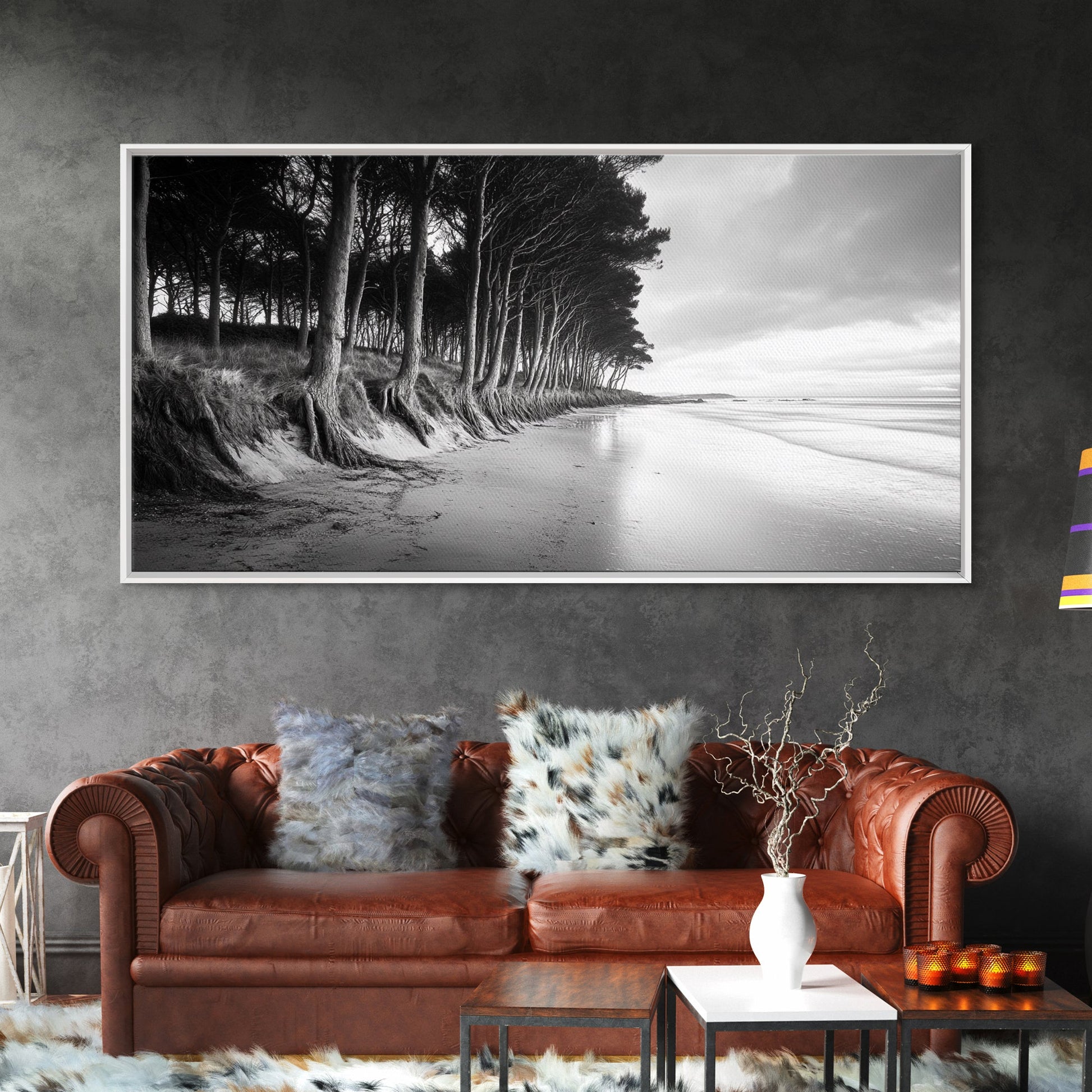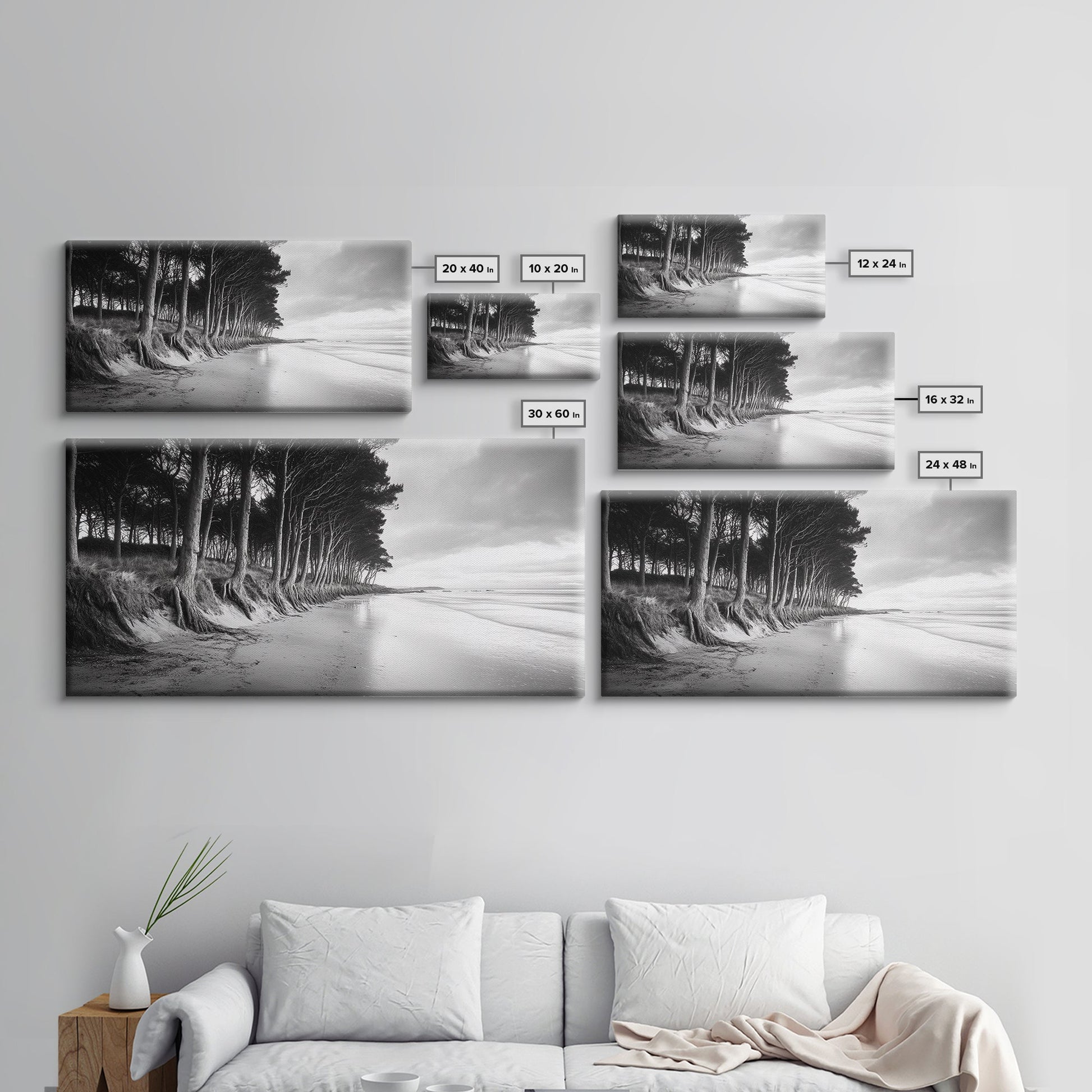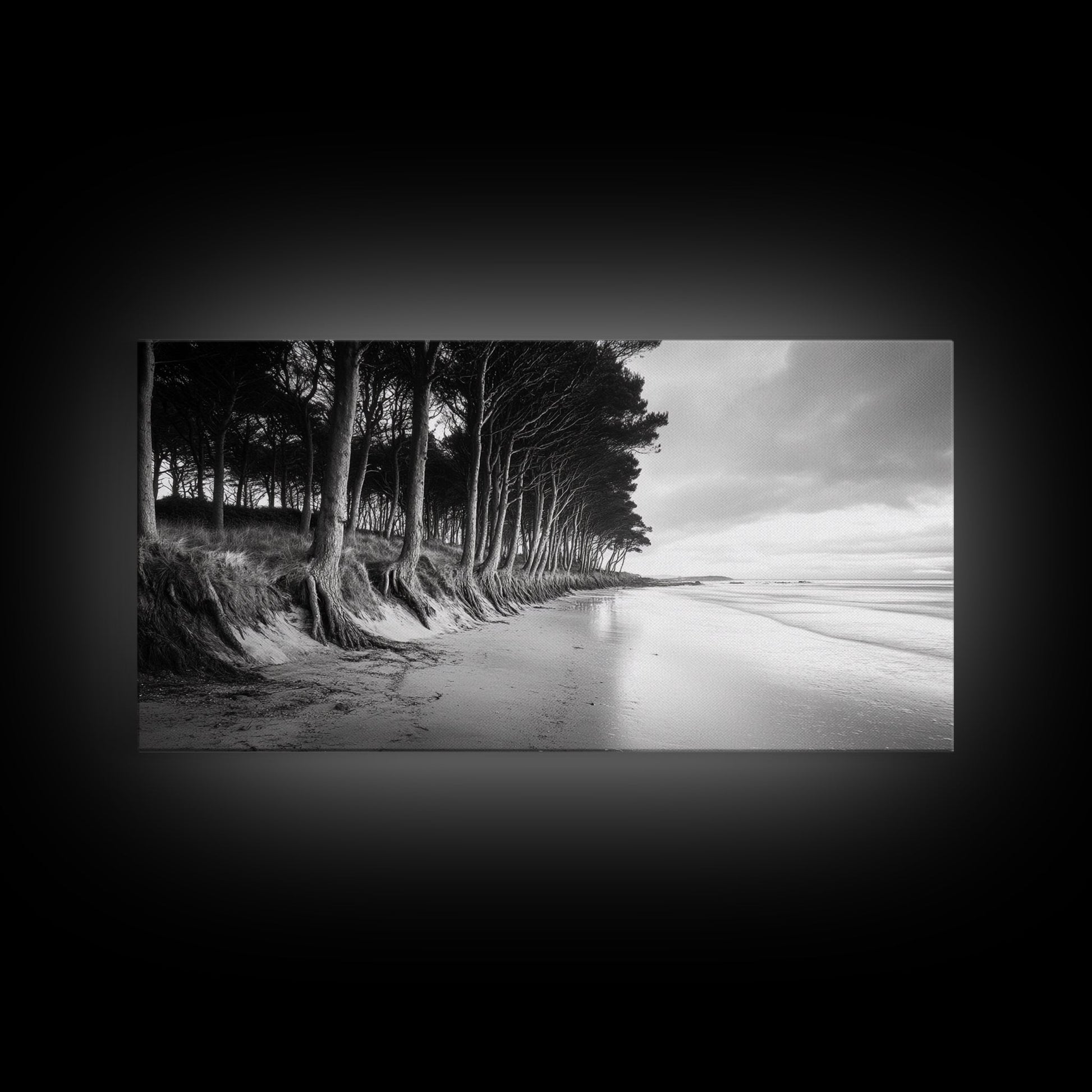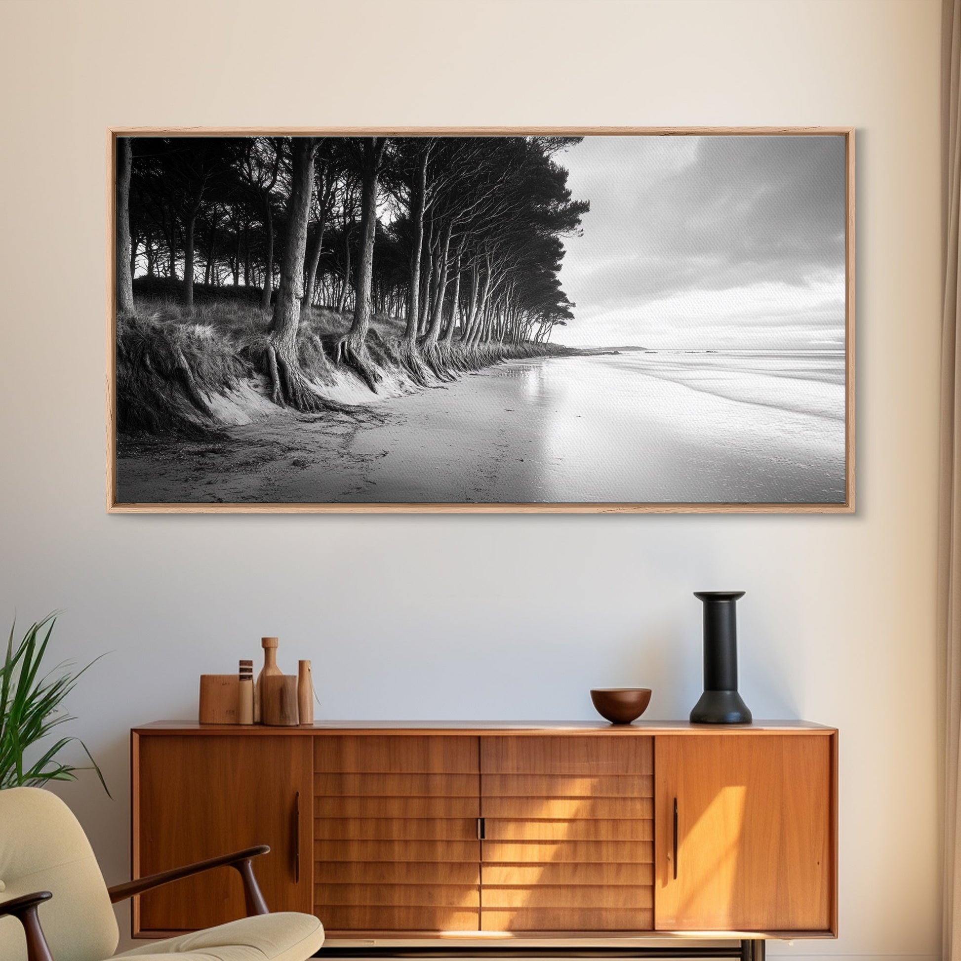 Kiefern, Sandstrand, Küstenidylle, Treibholzstrand, gerahmter Leinwanddruck, neutrale Wandkunst, rustikaler Küstenstil, Eingangsbereich-Landschaft