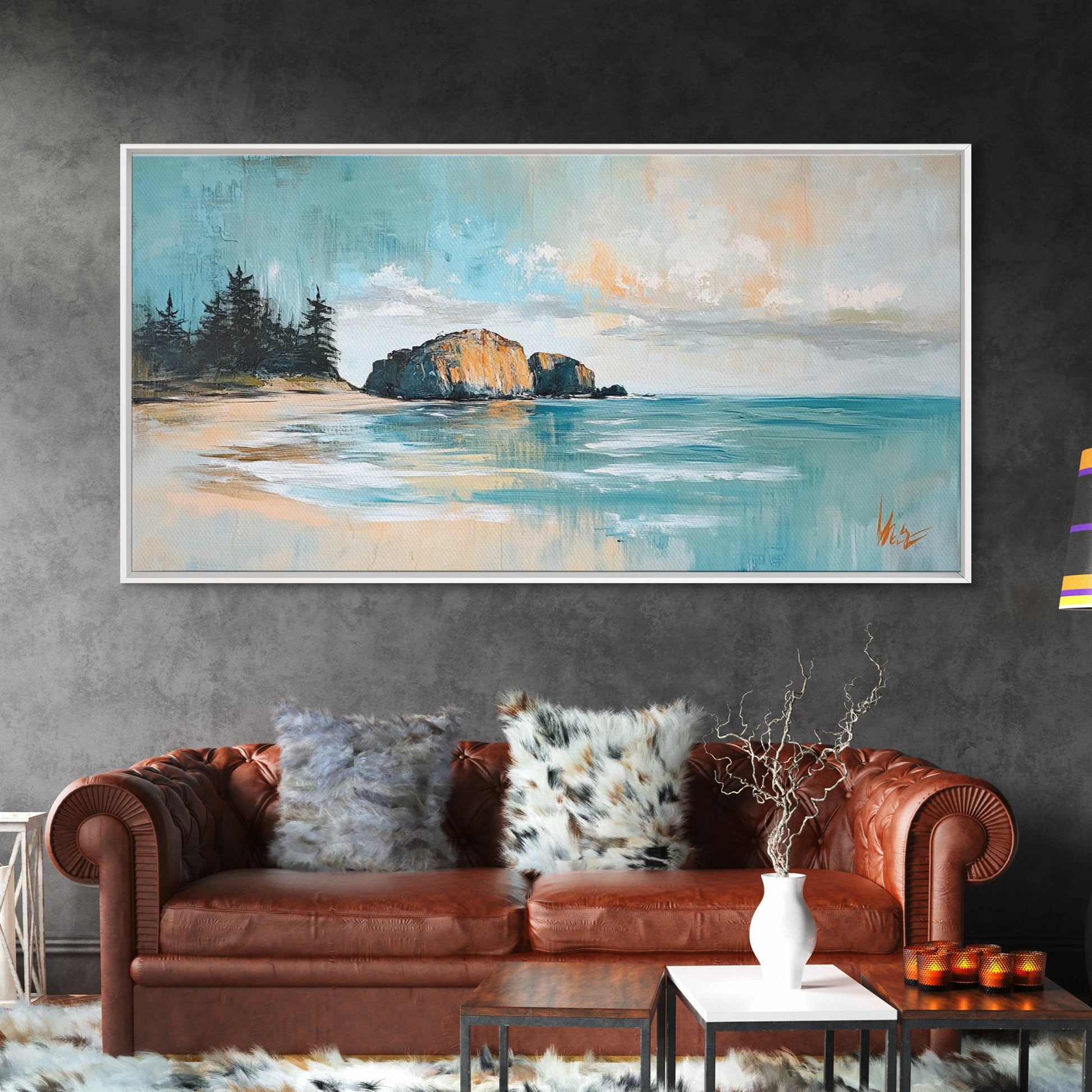 Ruhige Strandlandschaft, gerahmter Leinwanddruck, Küstenmalerei, Seestück, extra breites Kunstwerk, maritime Wandkunst, Schlafzimmerkunst