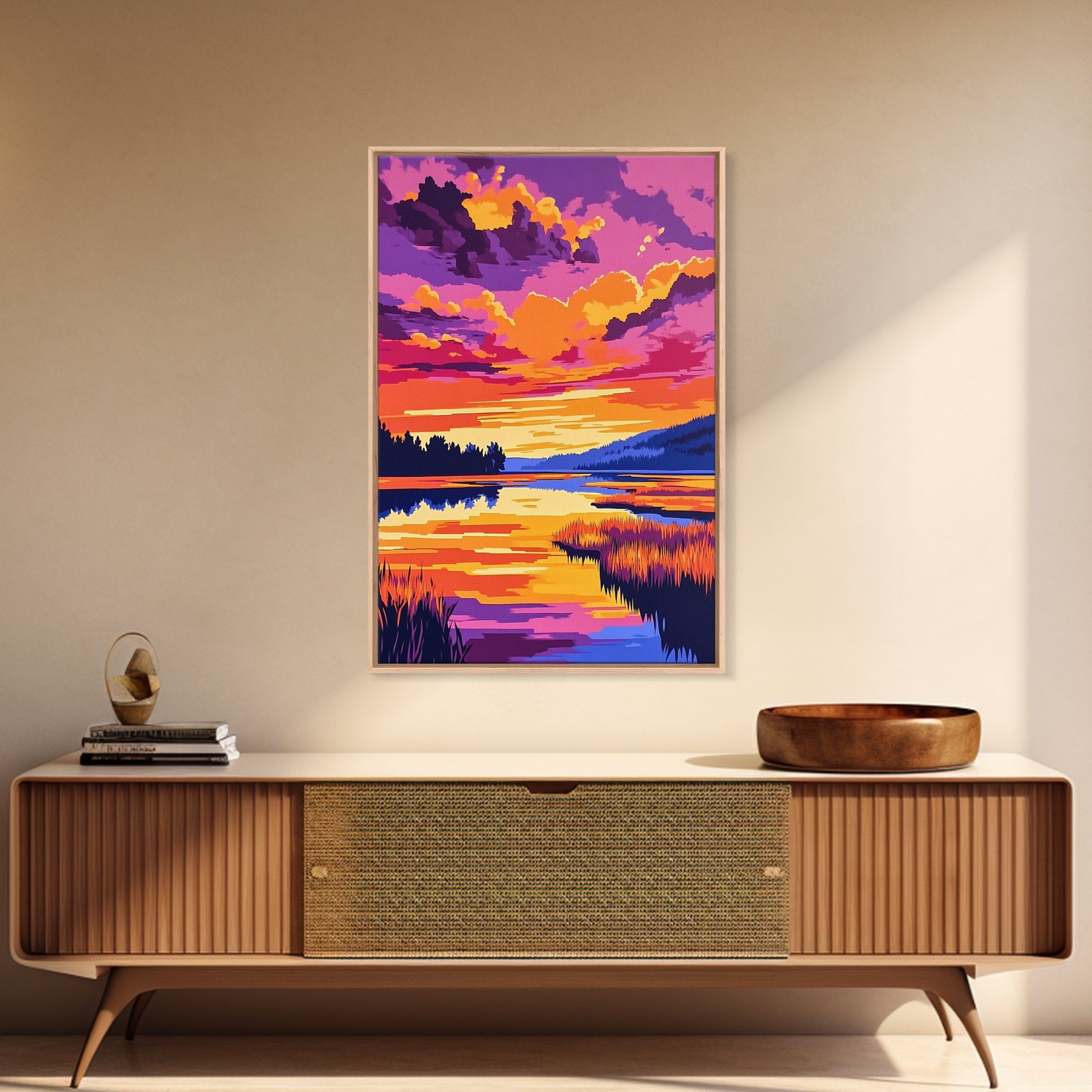 Sonnenuntergangsspiegelung, lebendige Naturkunst, Herbstlandschaft, malerische Wanddekoration, gerahmter Leinwanddruck, Wandbild fürs Wohnzimmer, Boho-Kunst
