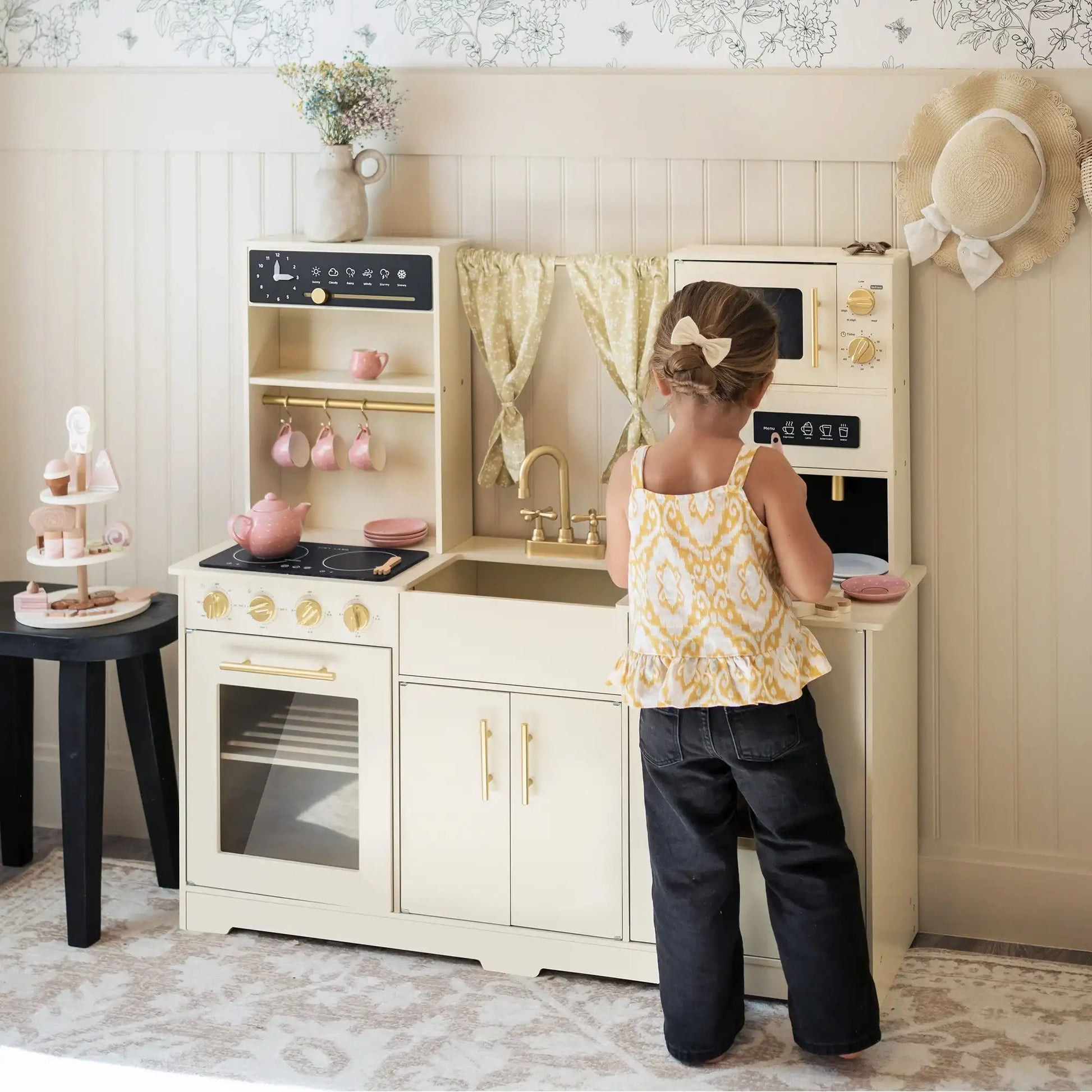 Charming Little Details : From those cute-as-a-button curtains to a handy rack for dangling those precious utensils, we've got charmed in every corner! And guess what? There's an array of tie-in products waiting to join the fun! Just pop into our pretend play collection, and take your pick. 🎁