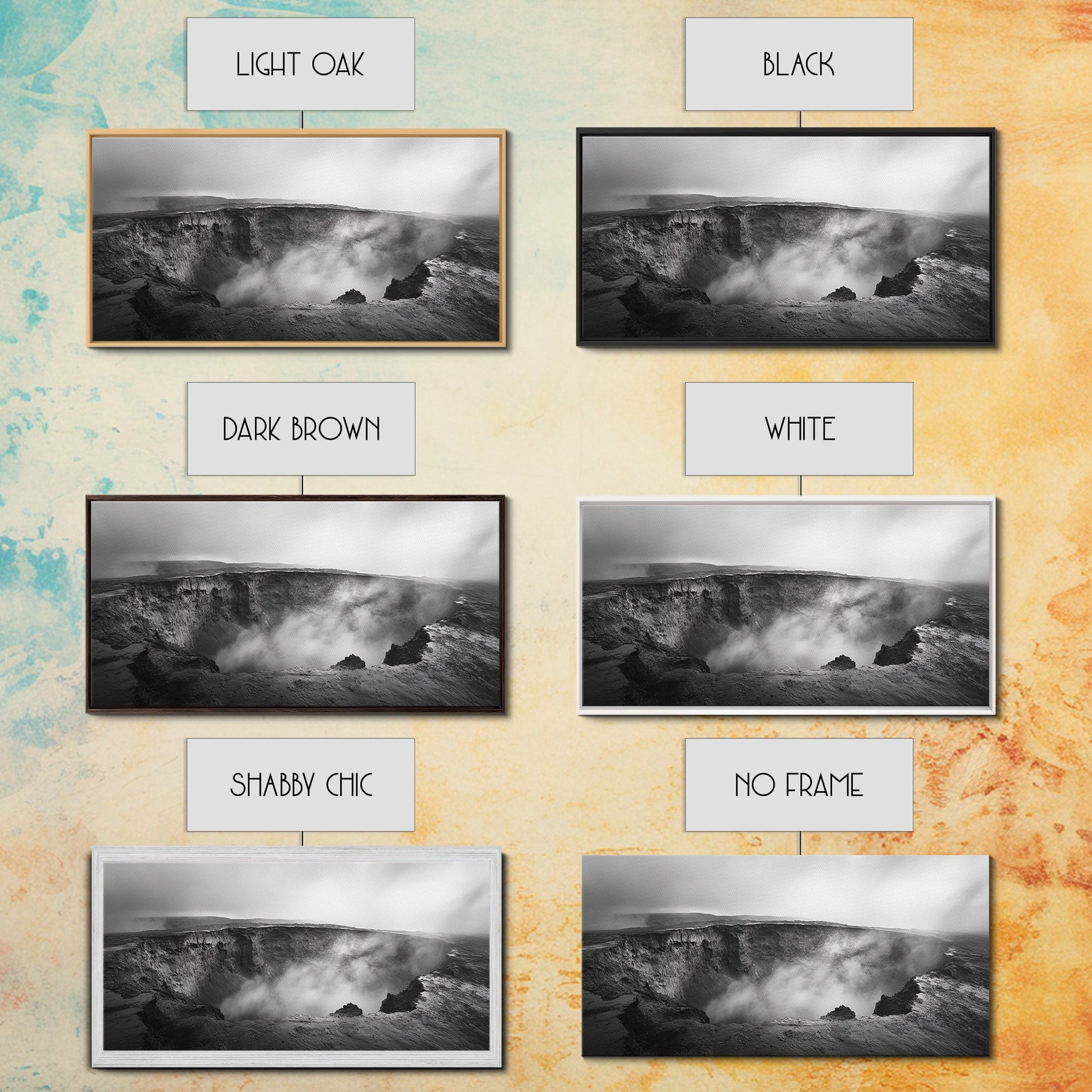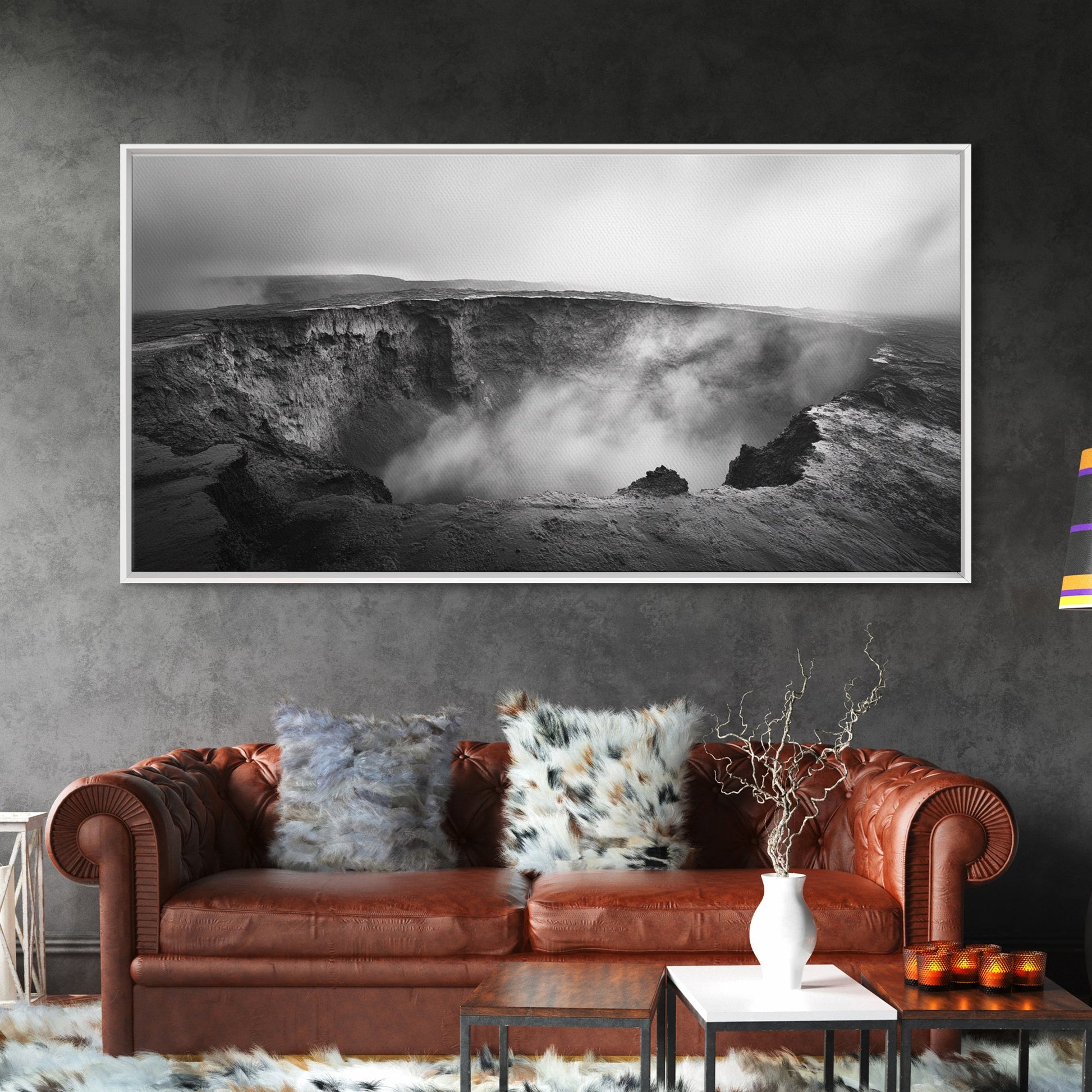 Vulkankrater, rauchige Erde, epische Landschaft, gerahmter Leinwanddruck, ausdrucksstarke Naturkunst, Dekoration fürs Arbeitszimmer, stimmungsvolle Schwarzweißfotografie
