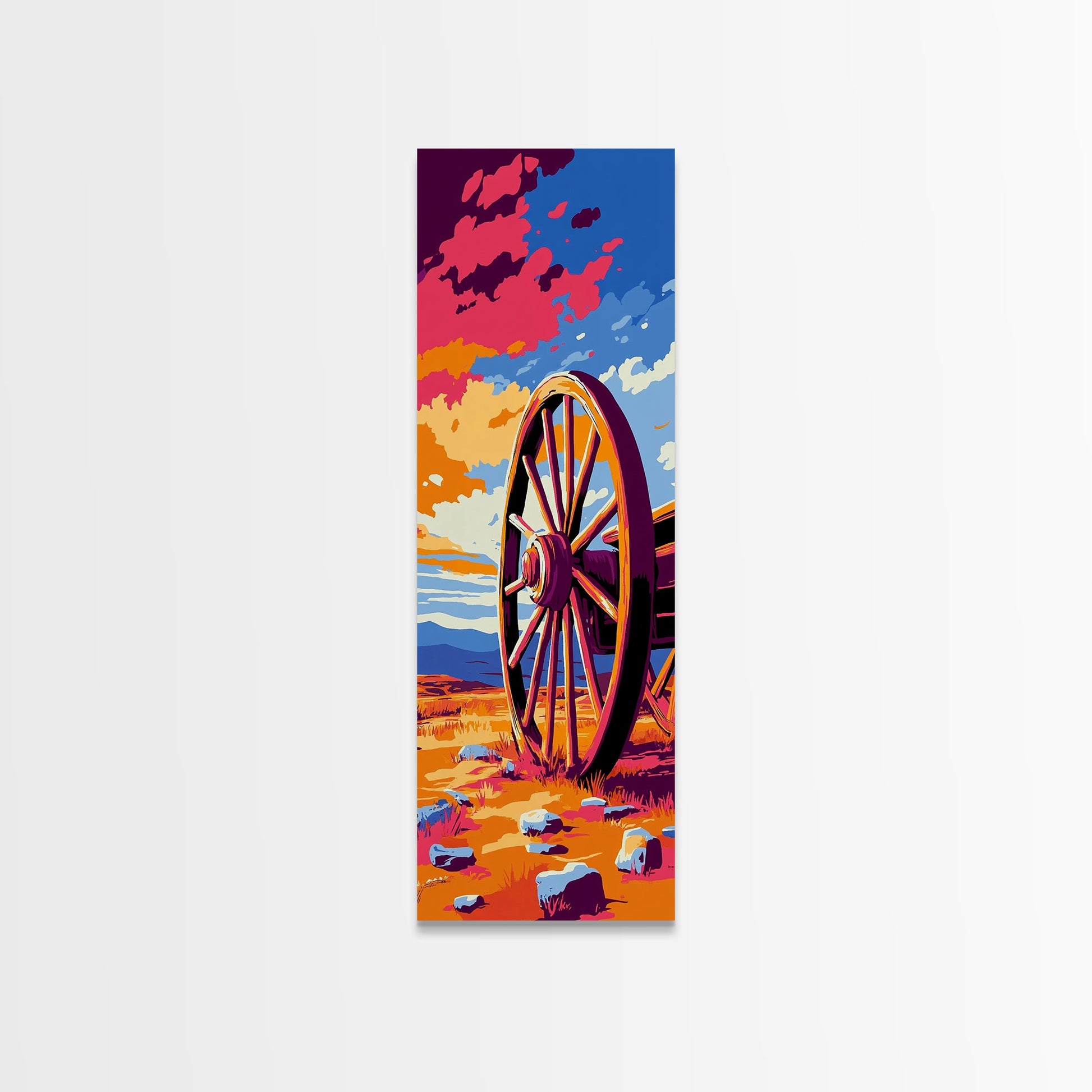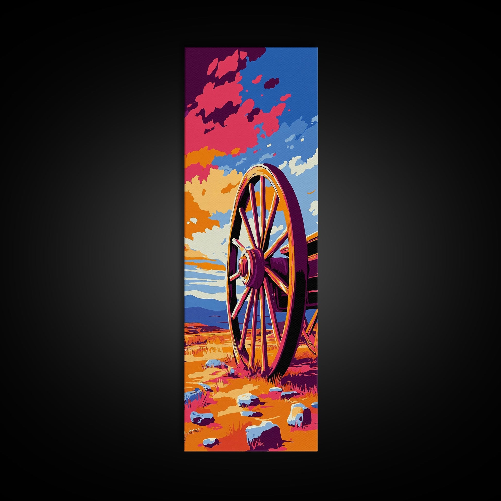 Wagenrad, rustikale Westernkunst, Bauernhausdeko, Ästhetik des Alten Westens, Wanddeko für Zuhause, Kunst fürs Wohnzimmer im Landhausstil, gerahmter Leinwanddruck