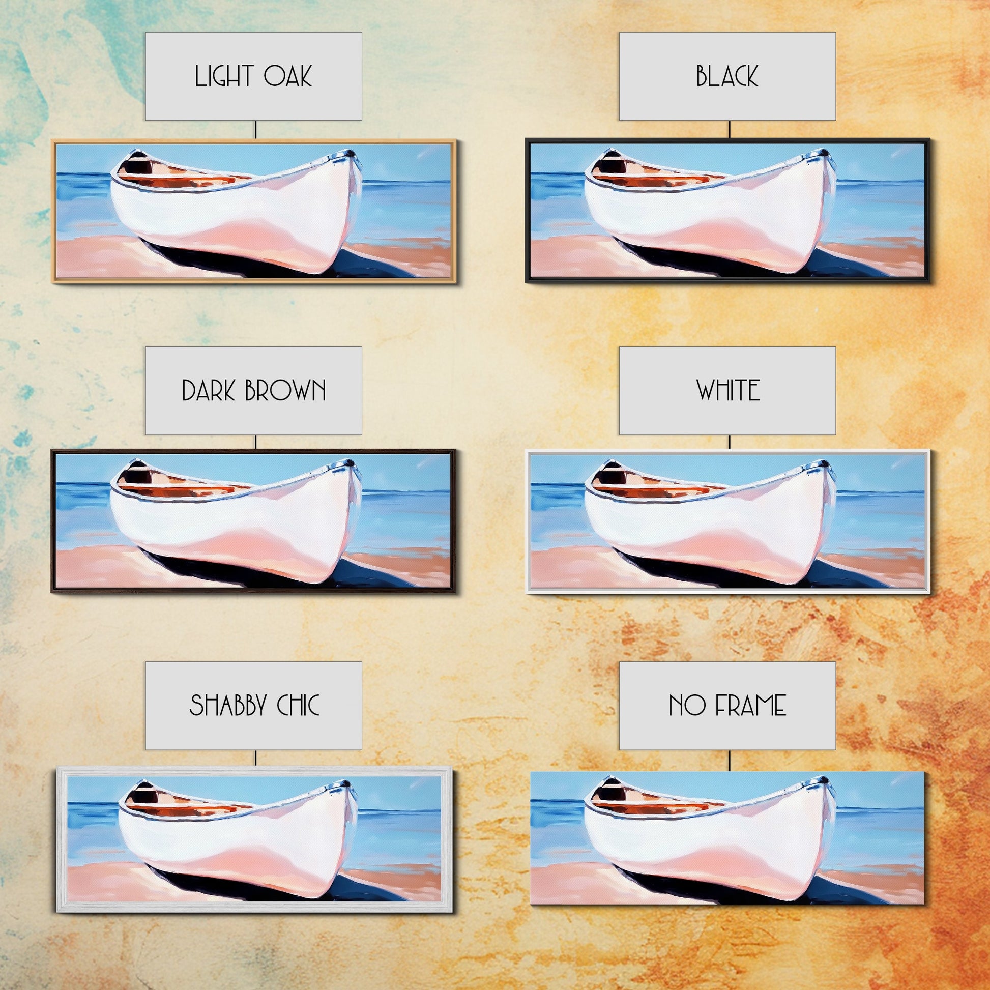 Weißes Kanu, Küstenwandbild, maritime Ästhetik, gerahmter Leinwanddruck, minimalistisches Bootsbild, maritime Kunst für Strandhäuser, Meeresdeko