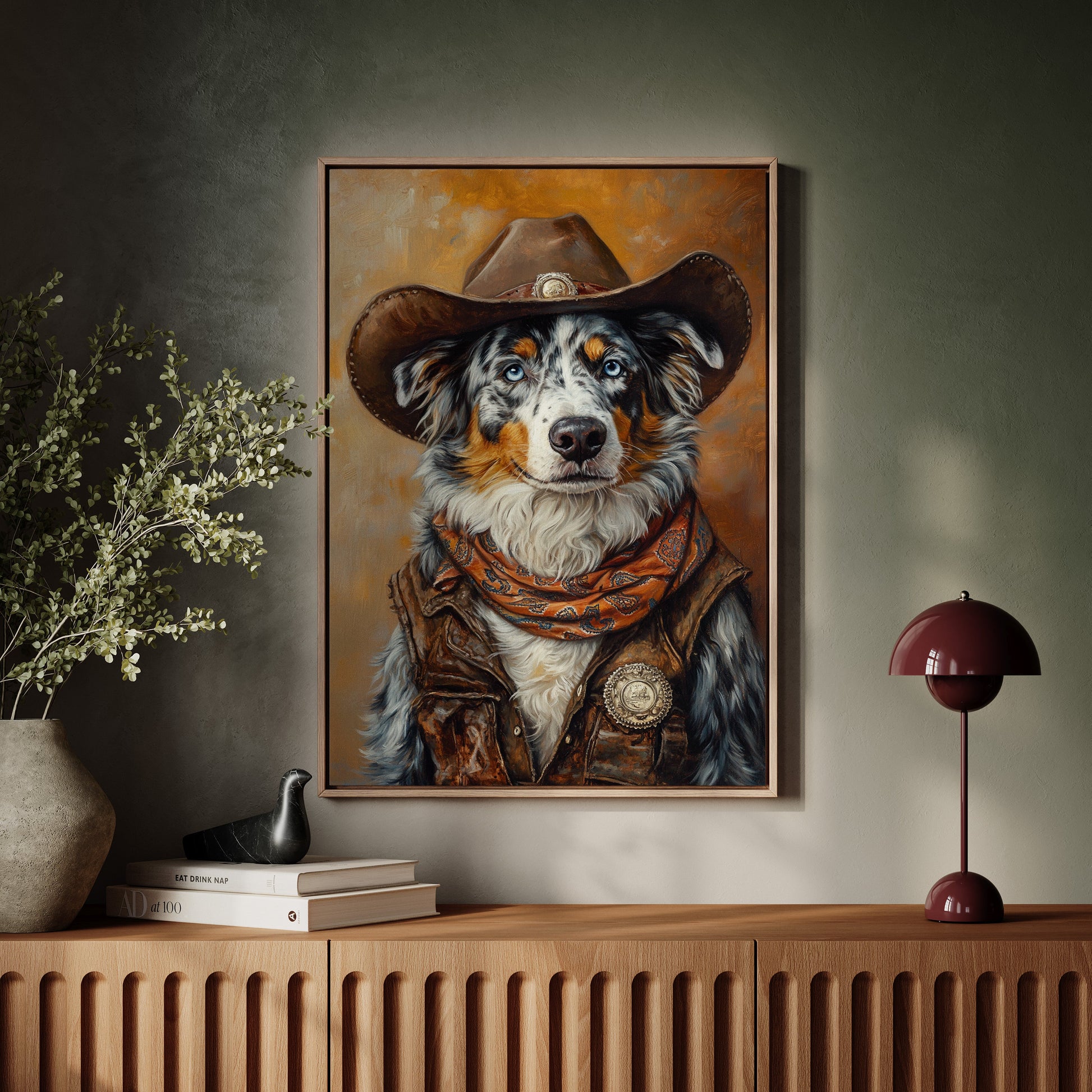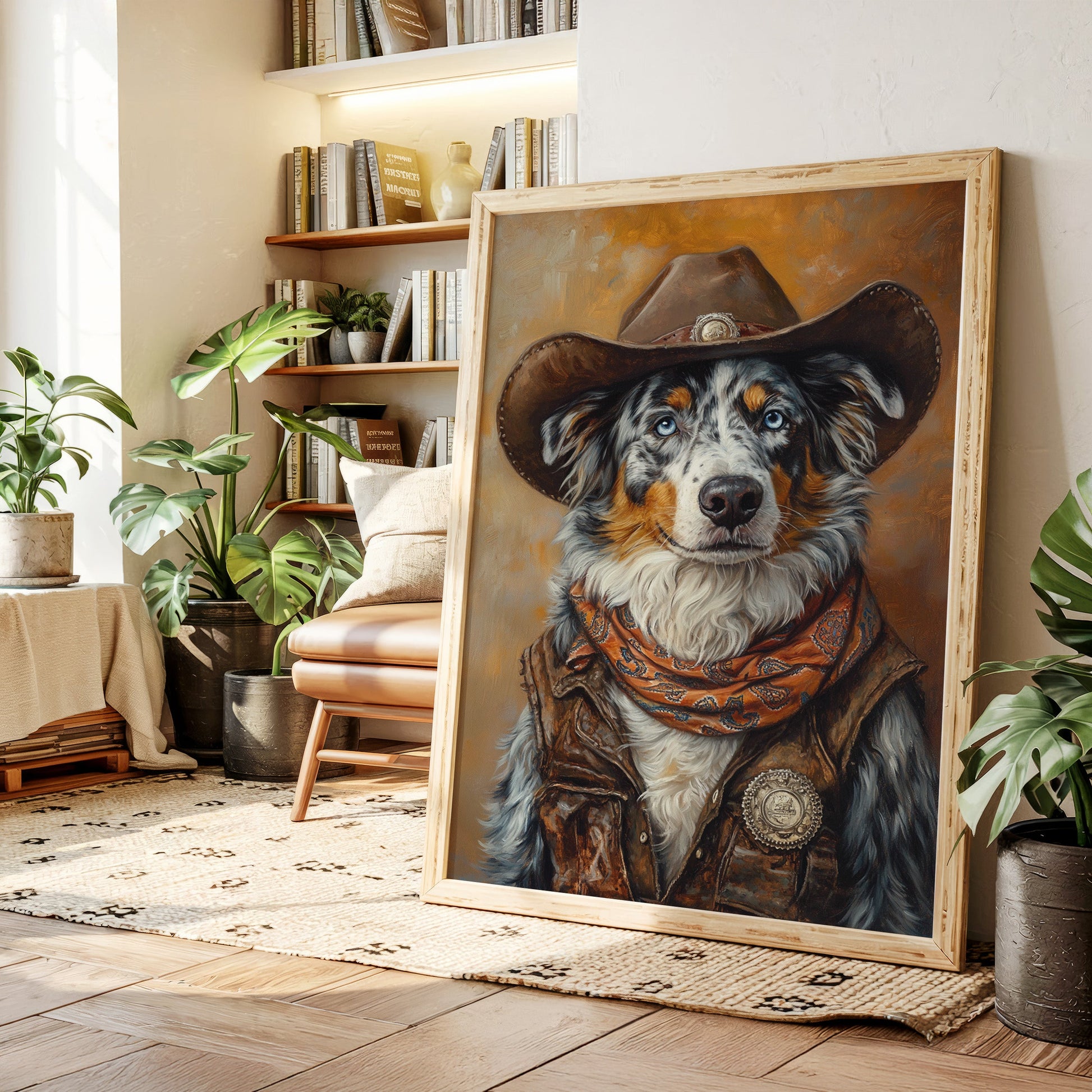 With a steady gaze and coat like storm-swept skies, this Australian Shepherd commands respect on the frontier—noble, wild, and watchful.