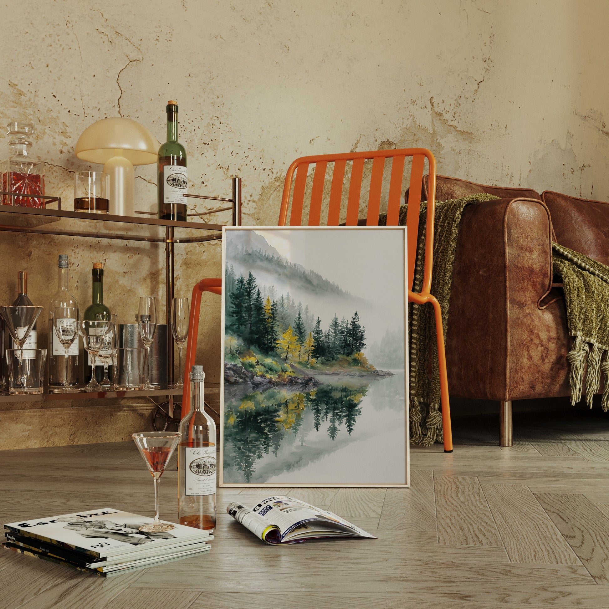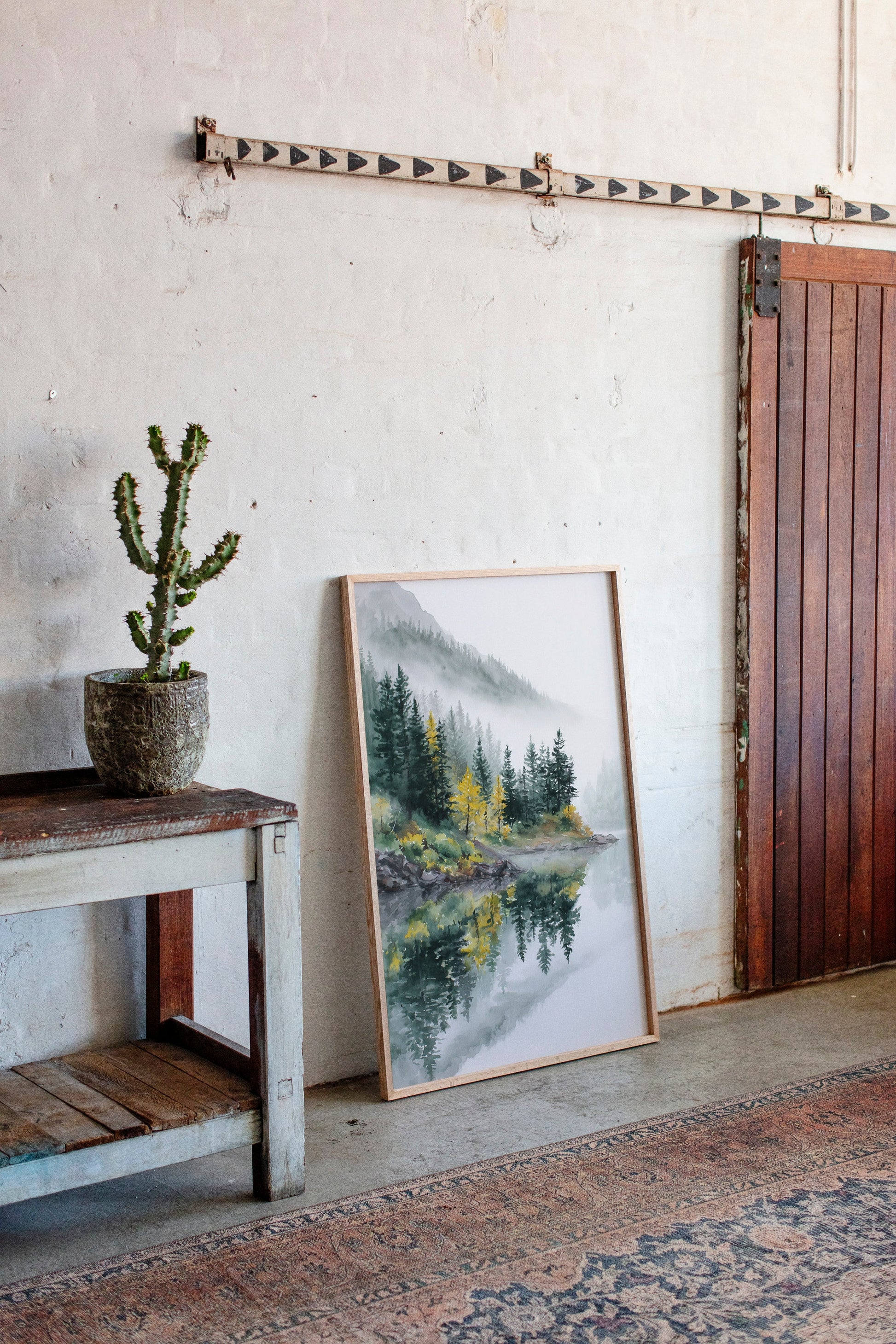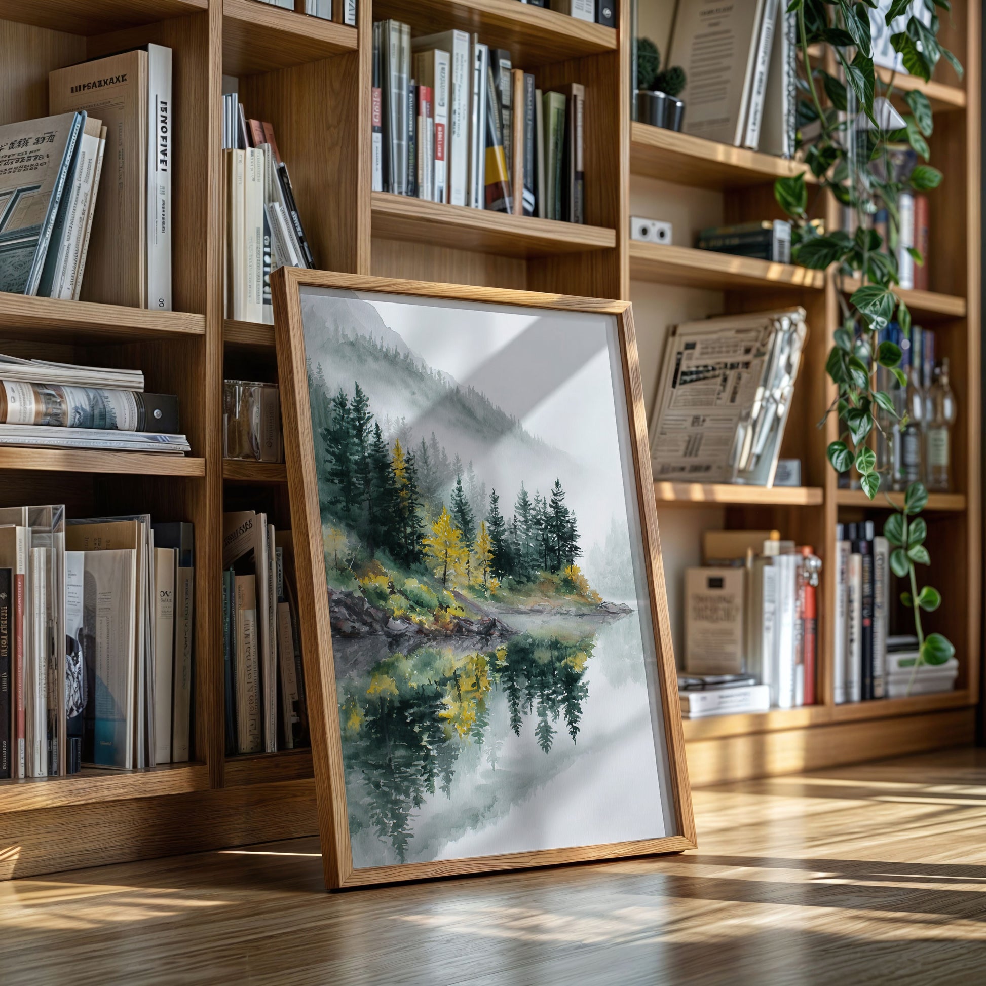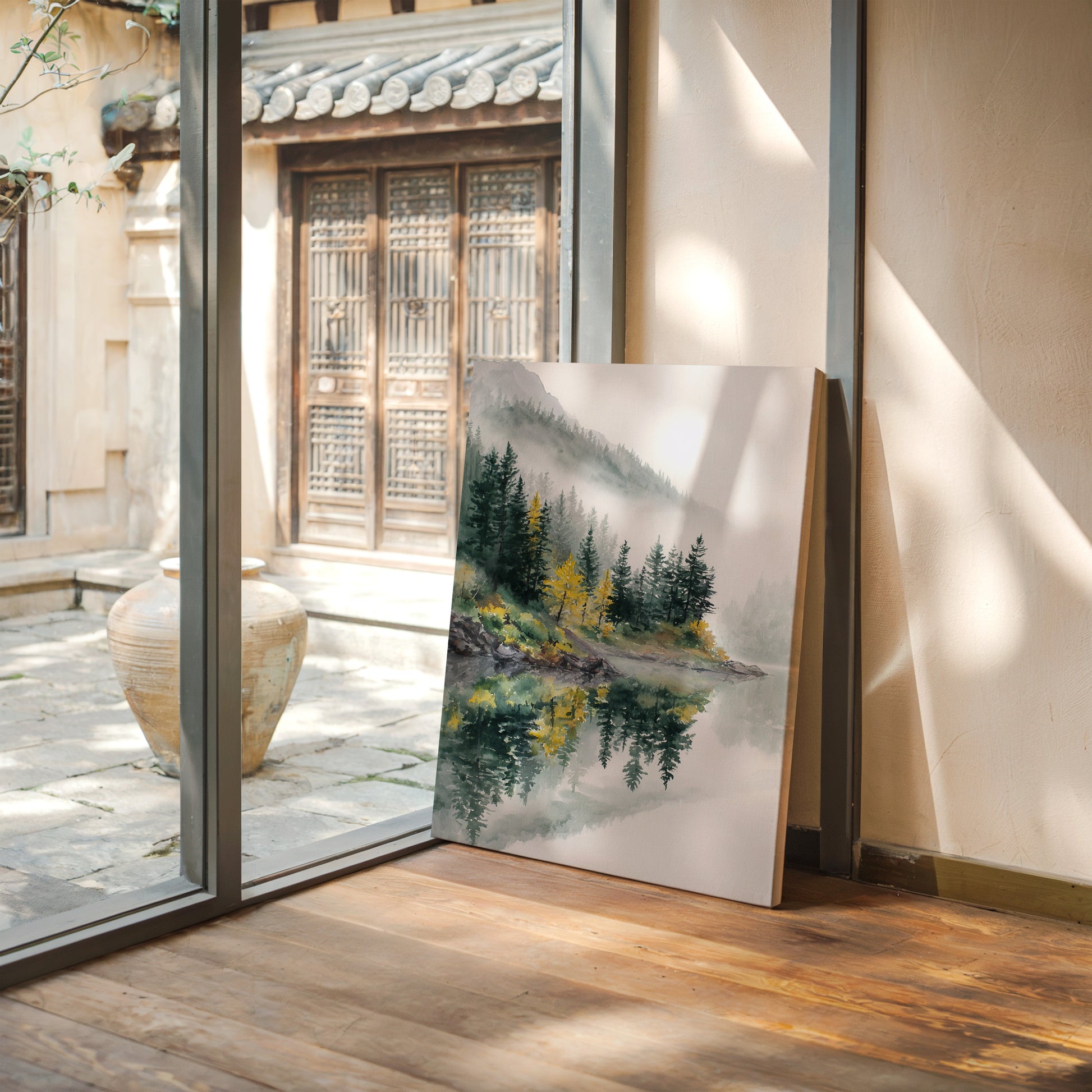 The soft greens and earthy tones blend seamlessly, inviting your senses to savor the cool mist and the fresh, pine-scented air. Perfect for spaces designed to inspire relaxation, such as living rooms, bedrooms, or meditation areas, this artwork harmonizes with both modern and rustic aesthetics.