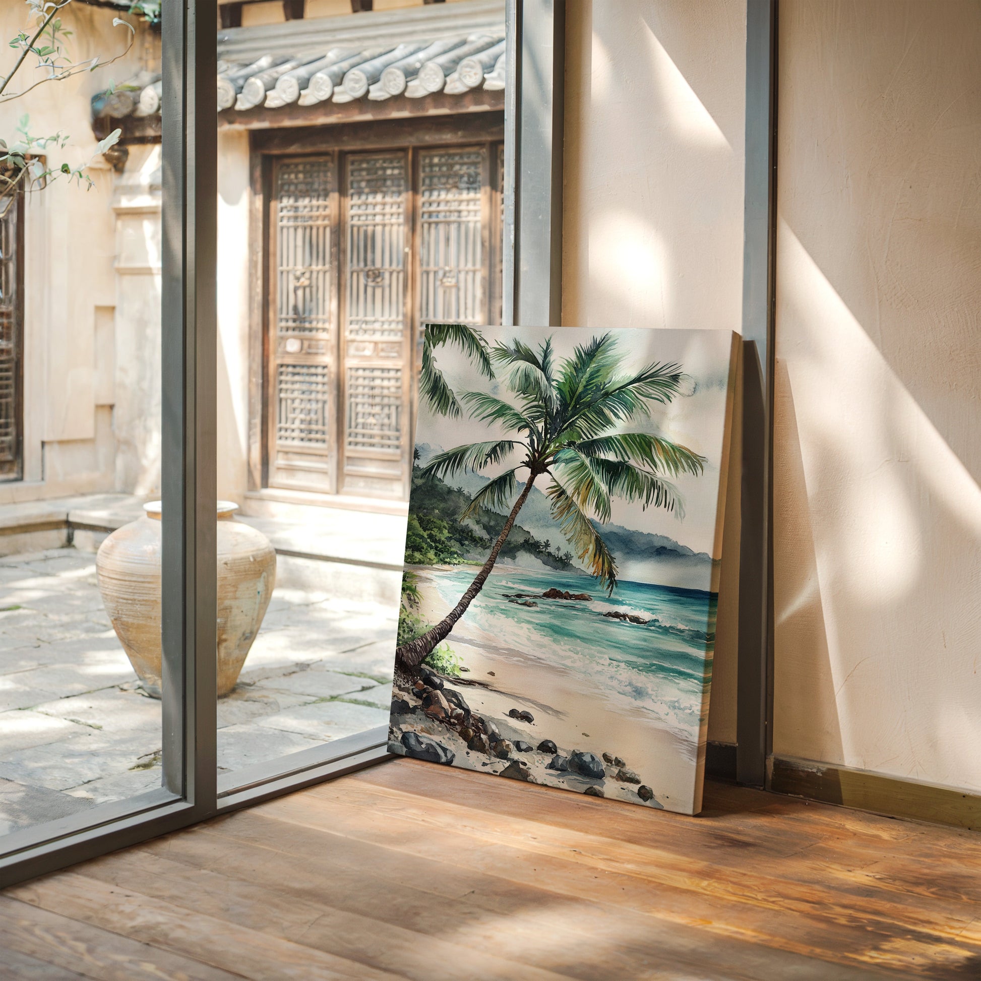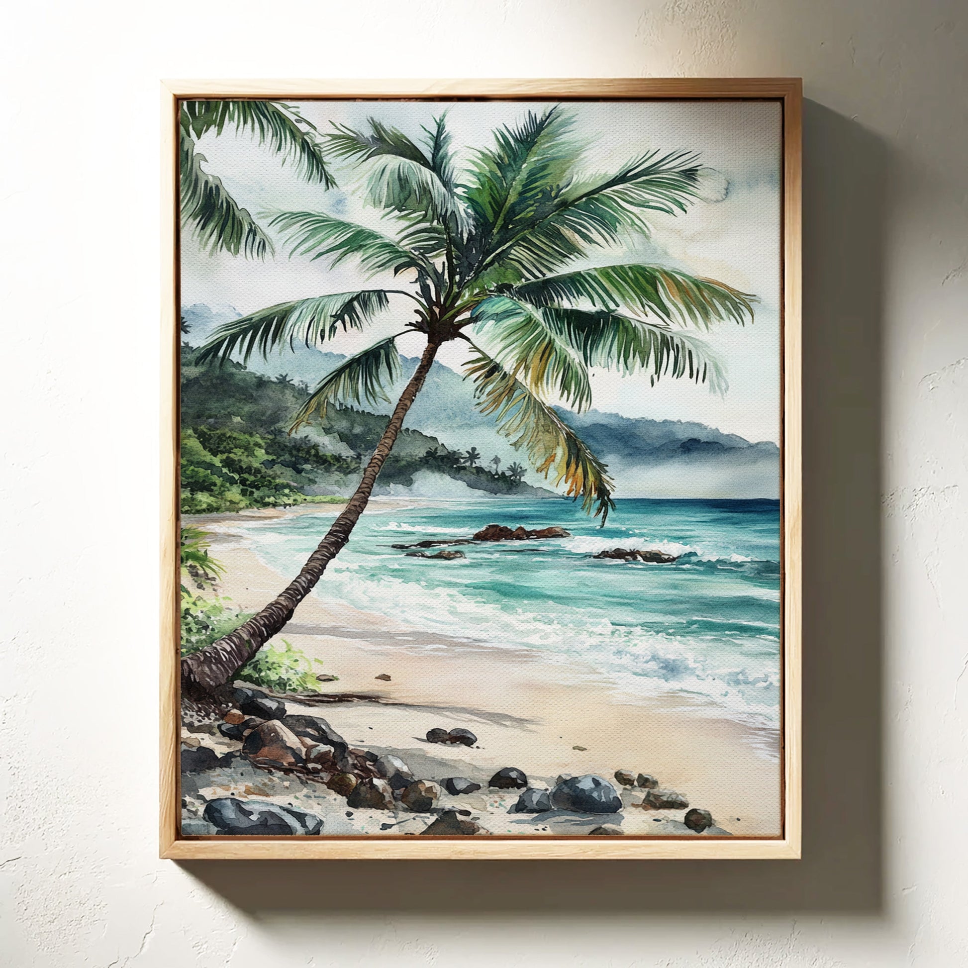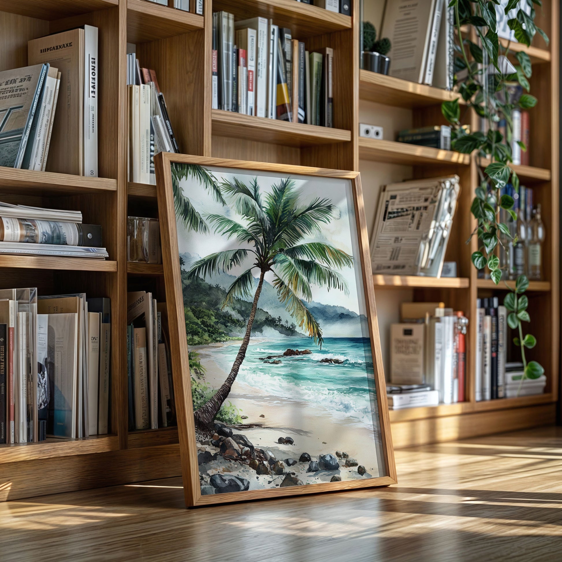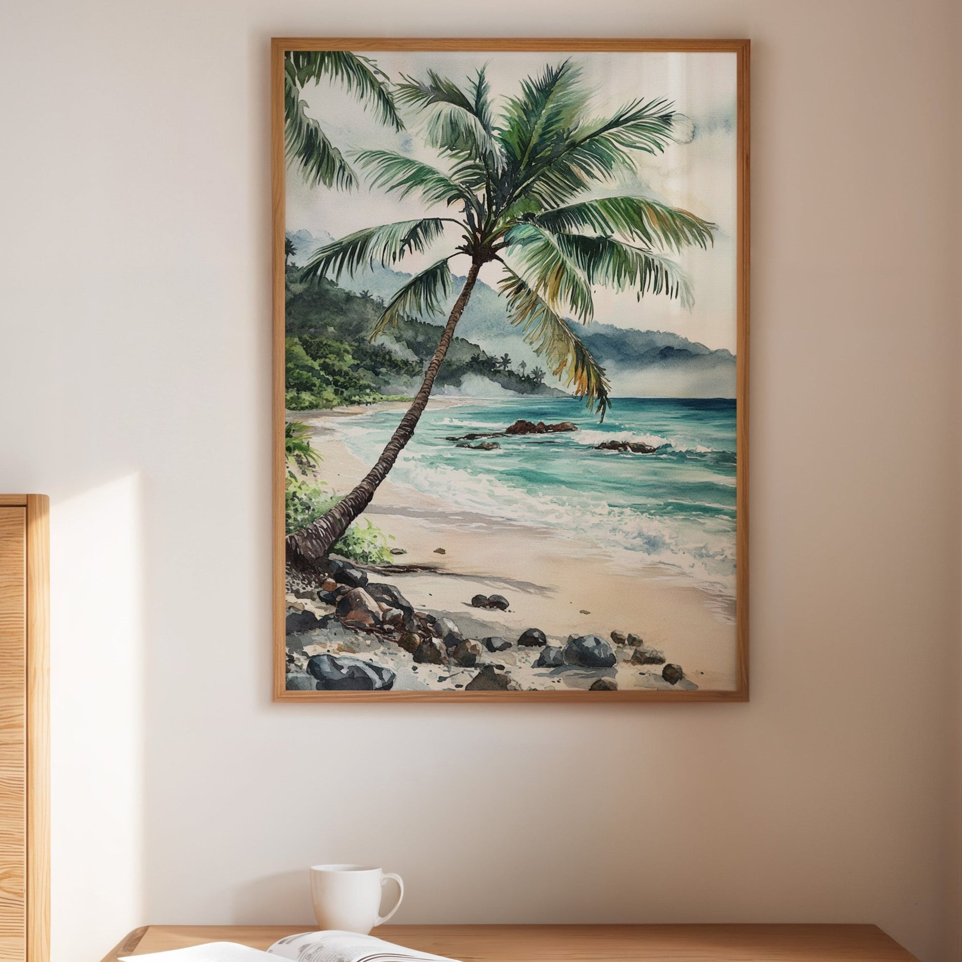 Immerse yourself in the tranquil beauty of 'Ocean Reverie,' where the serene hues of azure waves and the gentle sway of palm fronds transport you to a sunlit tropical escape. This captivating piece captures the essence of a peaceful beachside retreat, inviting a breath of fresh coastal air into your living space. Perfect for those who yearn for the calming embrace of the sea, this artwork harmonizes effortlessly with natural wood tones and minimalist decor, evoking a sense of relaxation and wanderlust.