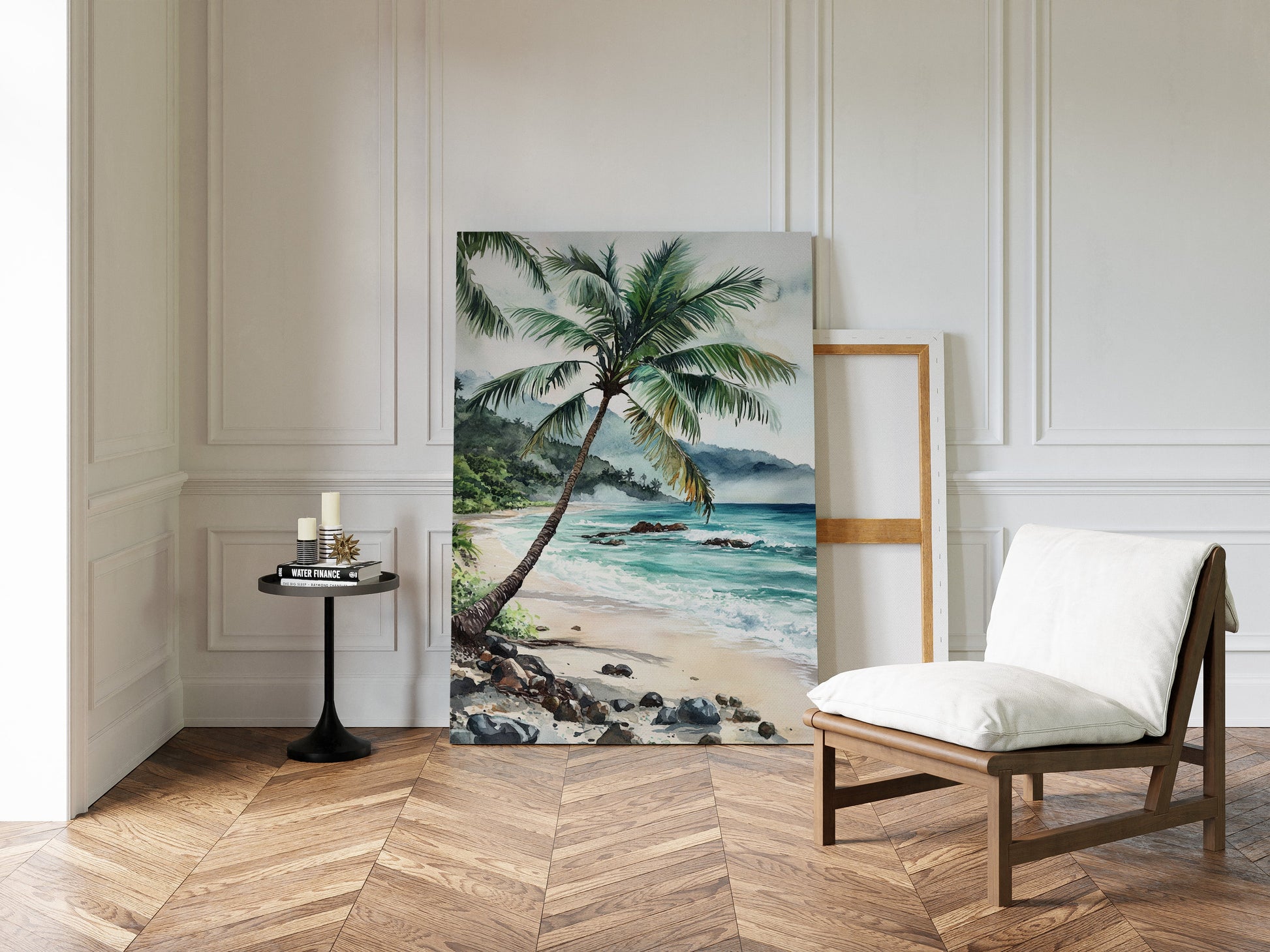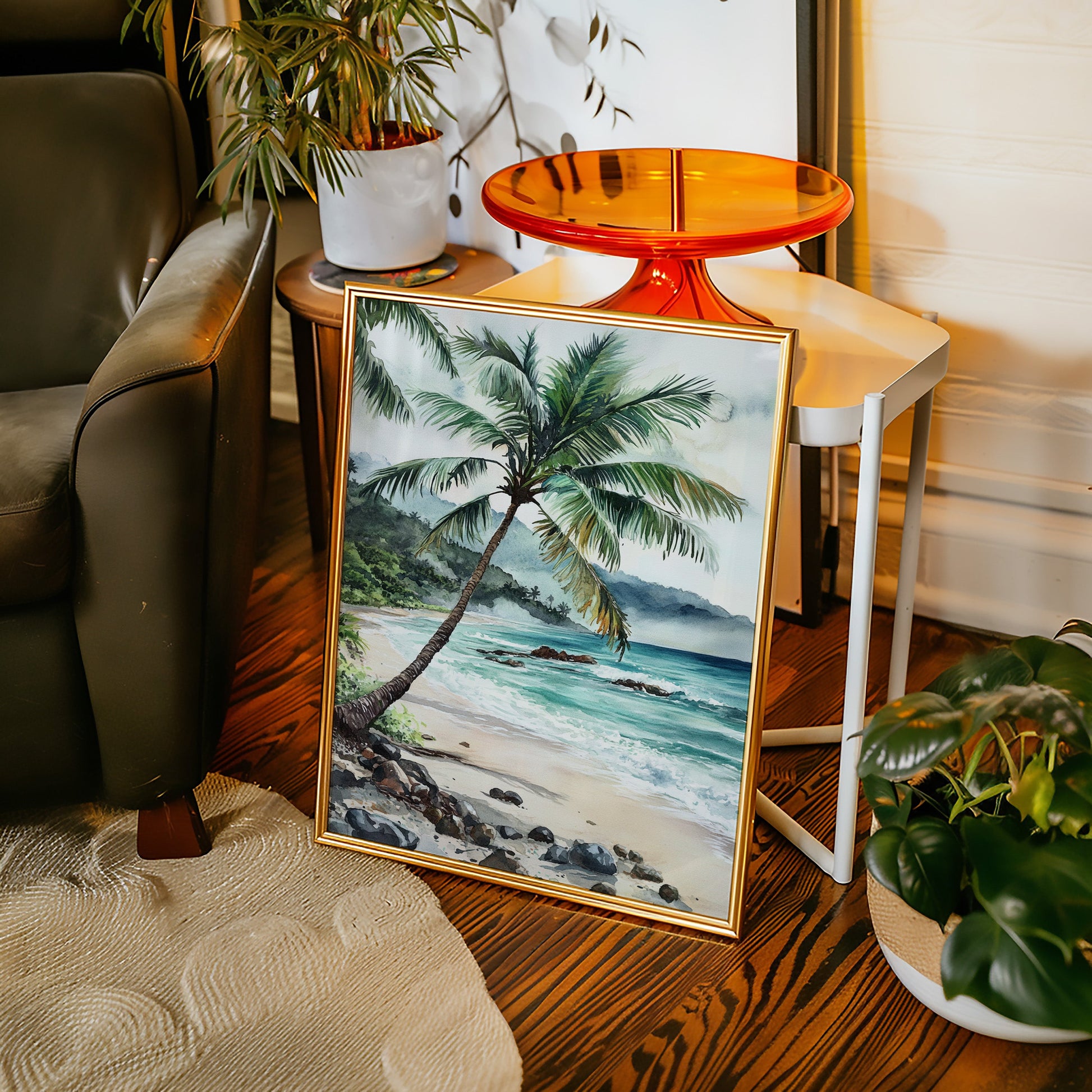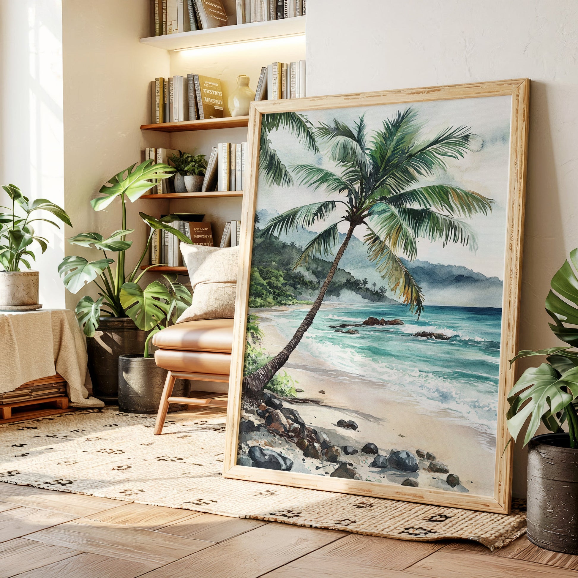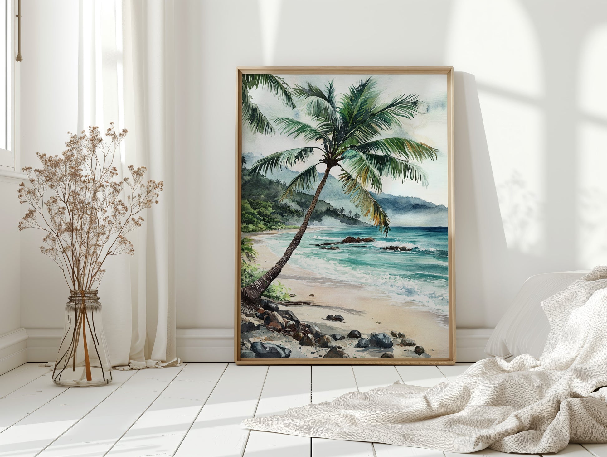 Immerse yourself in the tranquil beauty of 'Ocean Reverie,' where the serene hues of azure waves and the gentle sway of palm fronds transport you to a sunlit tropical escape. This captivating piece captures the essence of a peaceful beachside retreat, inviting a breath of fresh coastal air into your living space. Perfect for those who yearn for the calming embrace of the sea, this artwork harmonizes effortlessly with natural wood tones and minimalist decor, evoking a sense of relaxation and wanderlust.