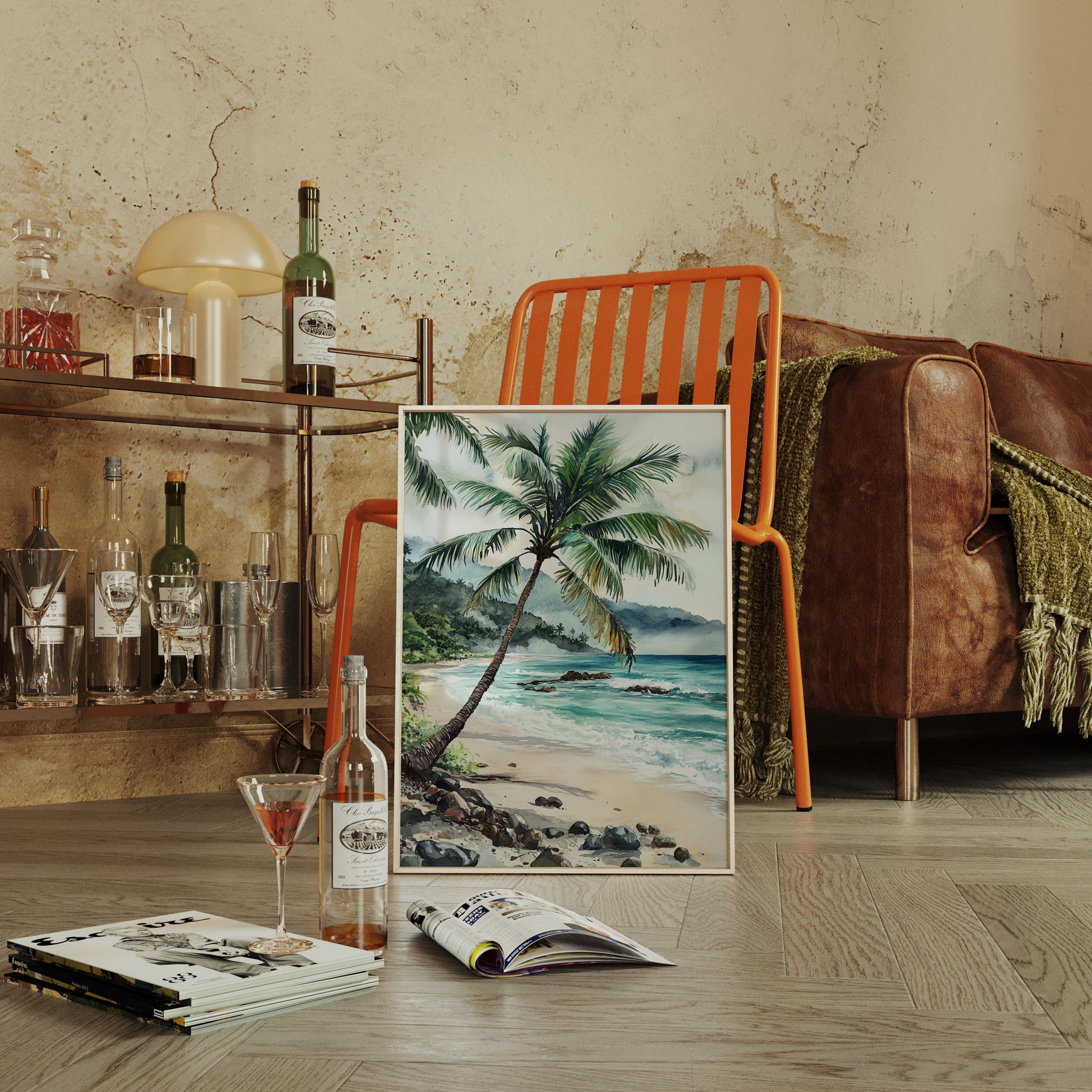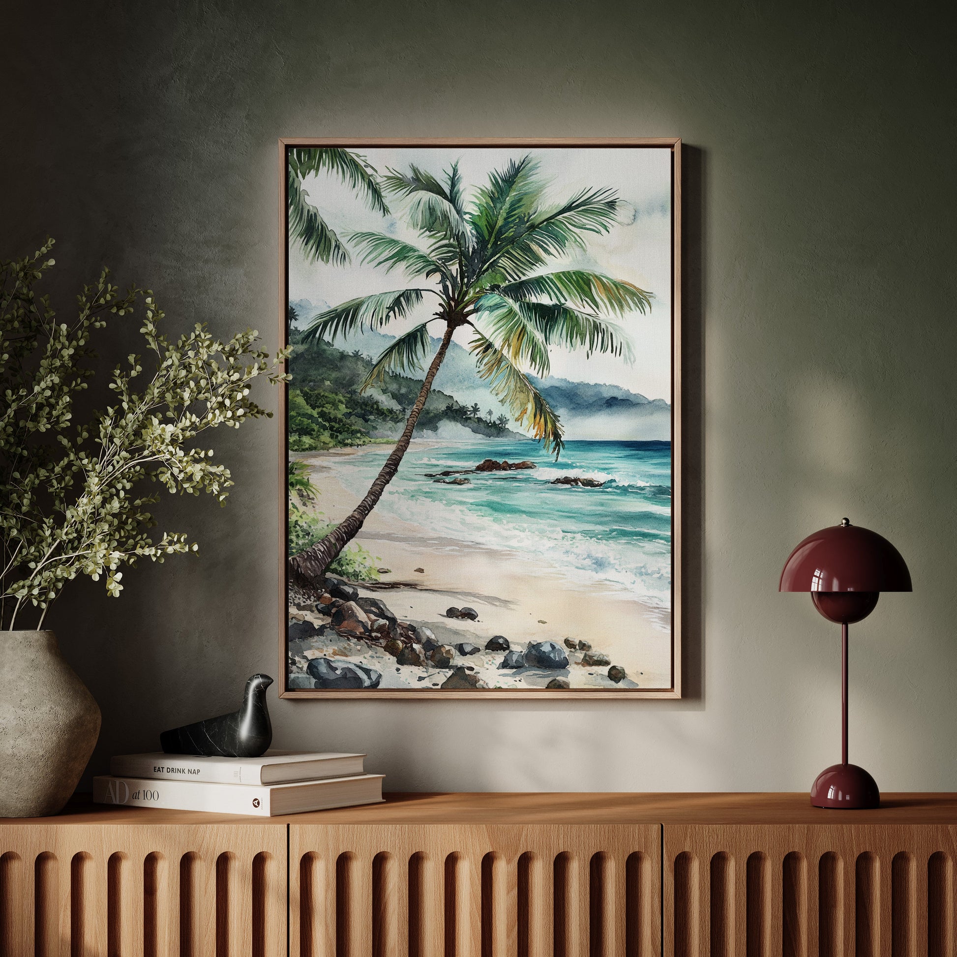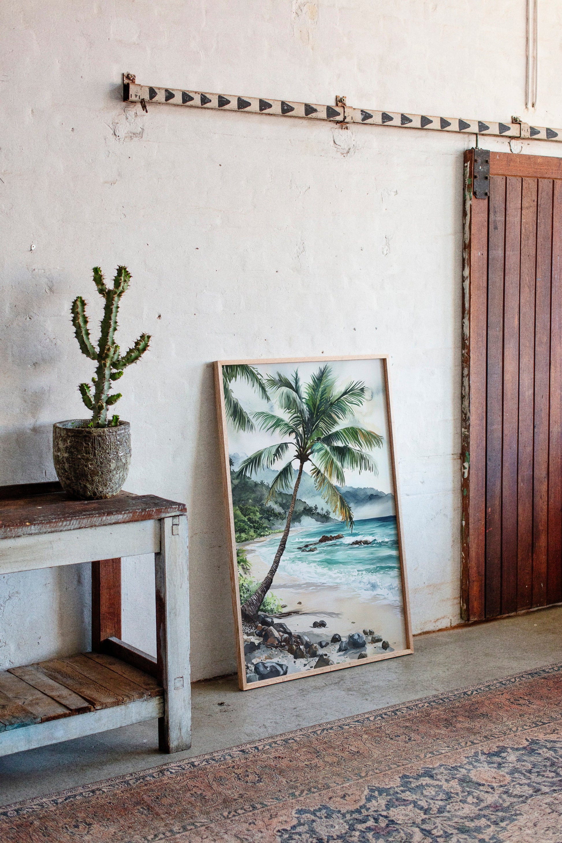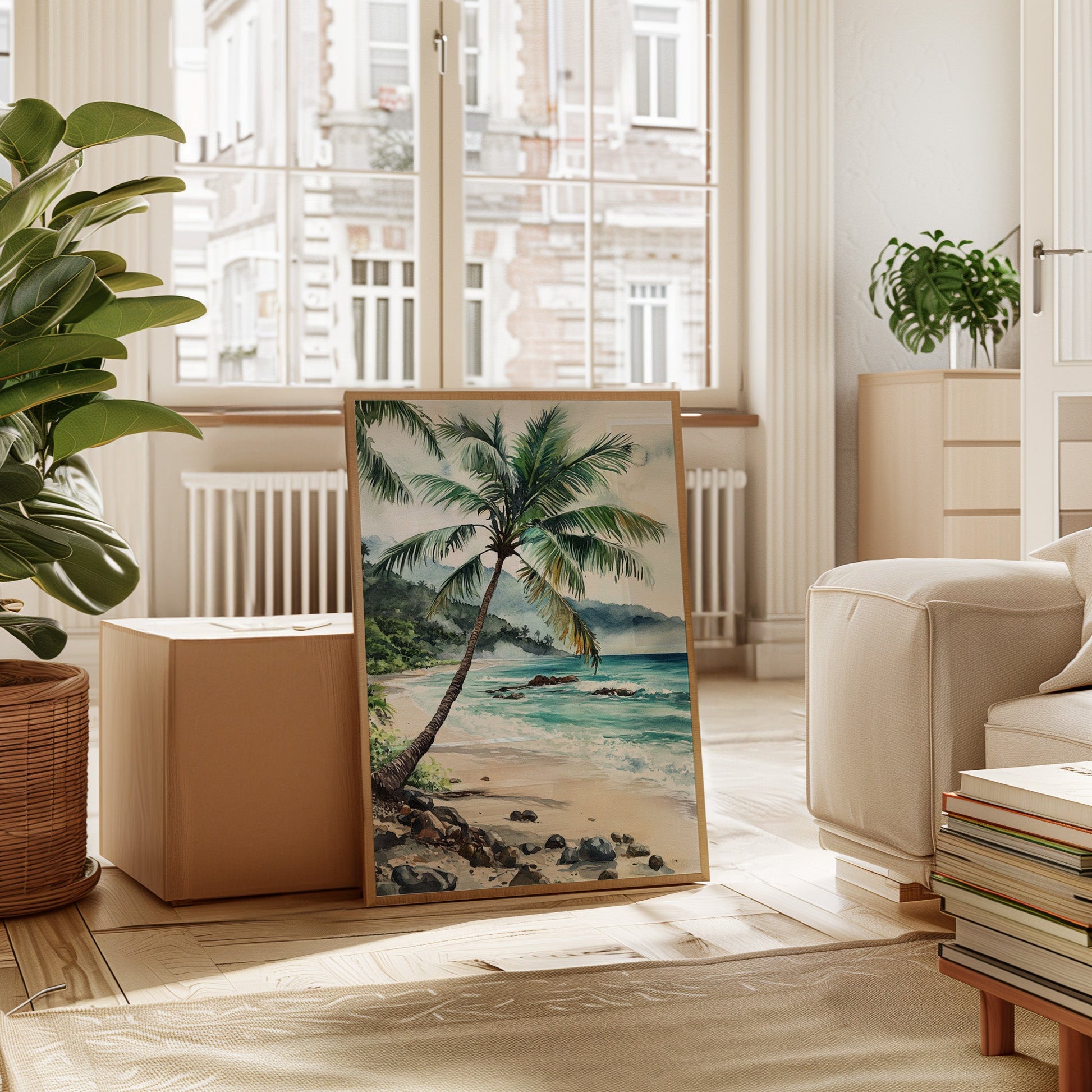 Immerse yourself in the tranquil beauty of 'Ocean Reverie,' where the serene hues of azure waves and the gentle sway of palm fronds transport you to a sunlit tropical escape. This captivating piece captures the essence of a peaceful beachside retreat, inviting a breath of fresh coastal air into your living space. Perfect for those who yearn for the calming embrace of the sea, this artwork harmonizes effortlessly with natural wood tones and minimalist decor, evoking a sense of relaxation and wanderlust.