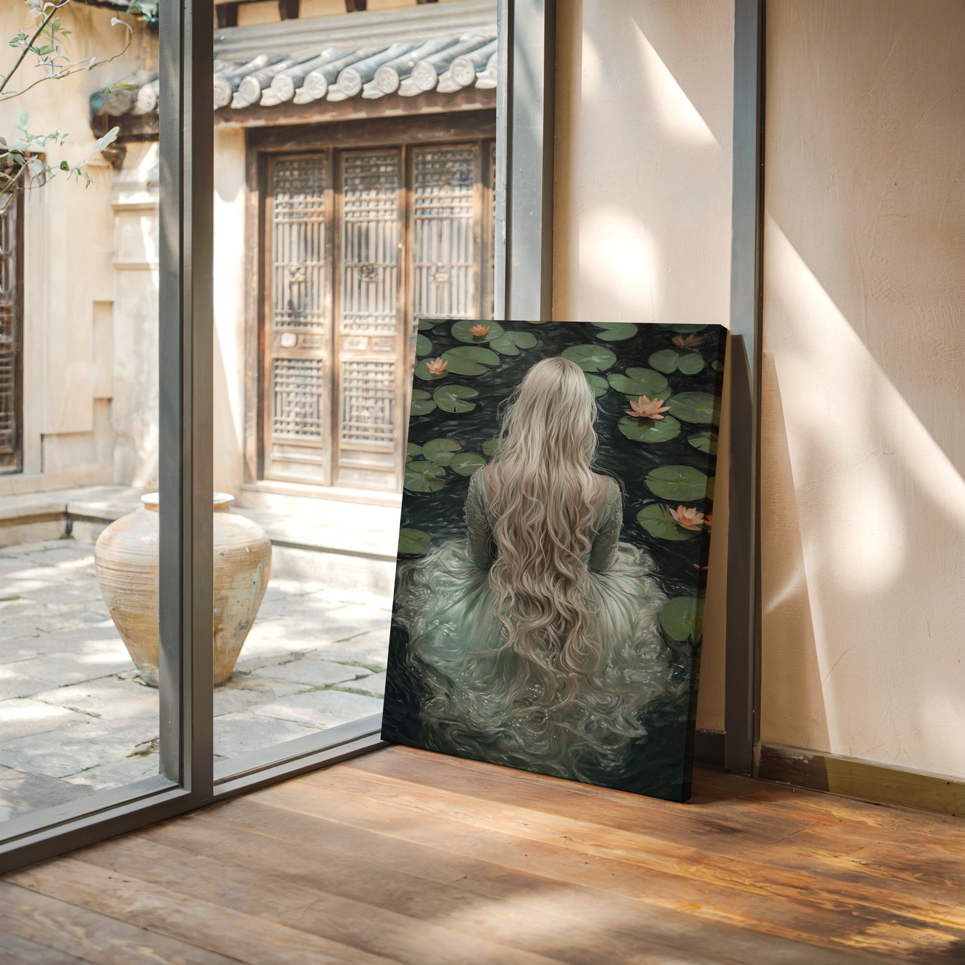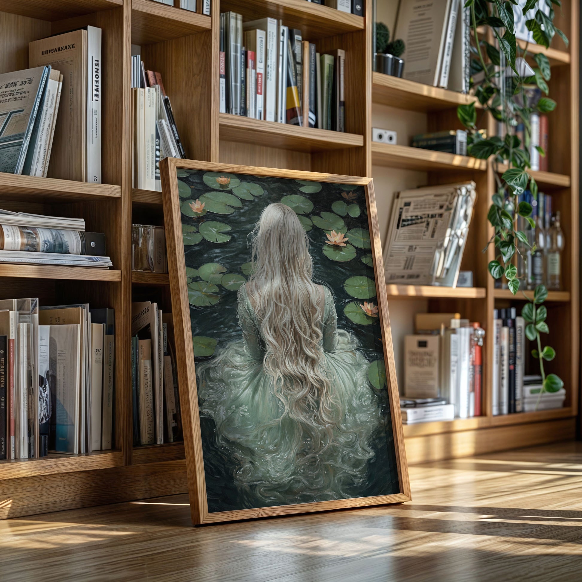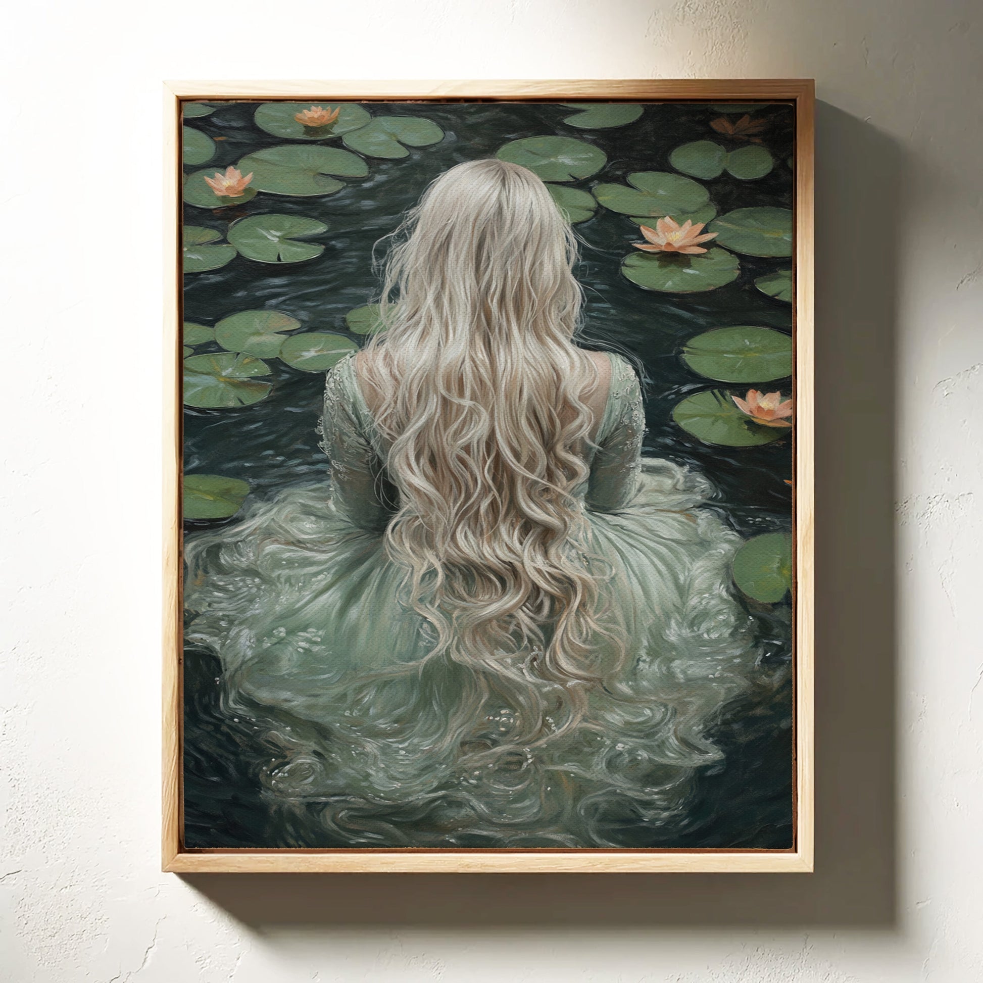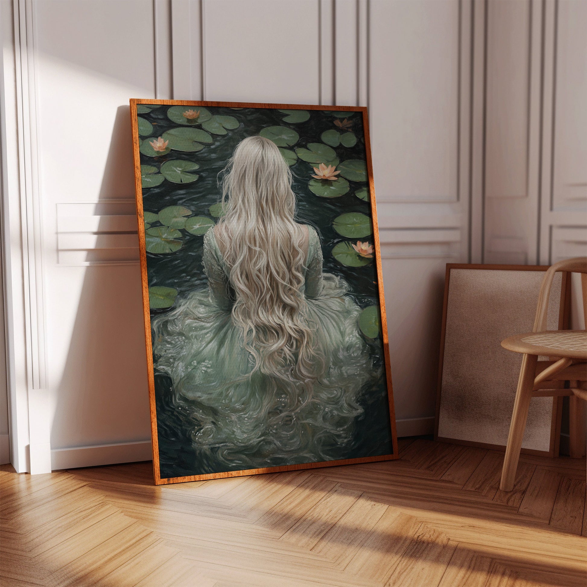 Immerse yourself in the ethereal tranquility of 'Serenity in Jade Waters.' This evocative piece captures the mystique of a lone figure surrounded by serene lily pads, her flowing locks cascading like whispers of dreams. The hues of jade and muted earth tones invite a sense of calm and introspection, making it a perfect addition to spaces yearning for a touch of the mystical. Let the gentle embrace of this artwork transform your room into a sanctuary of peace and wonder.