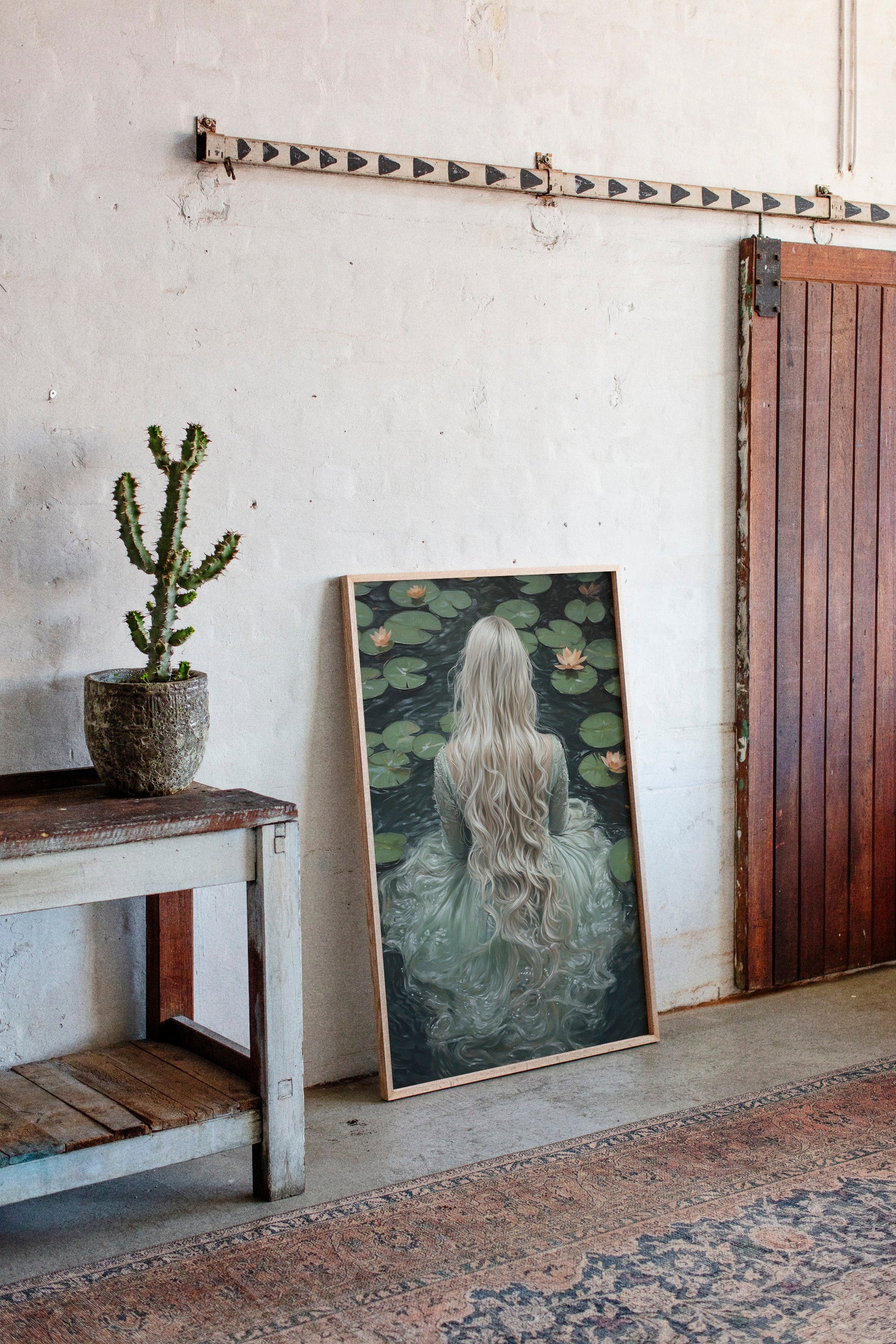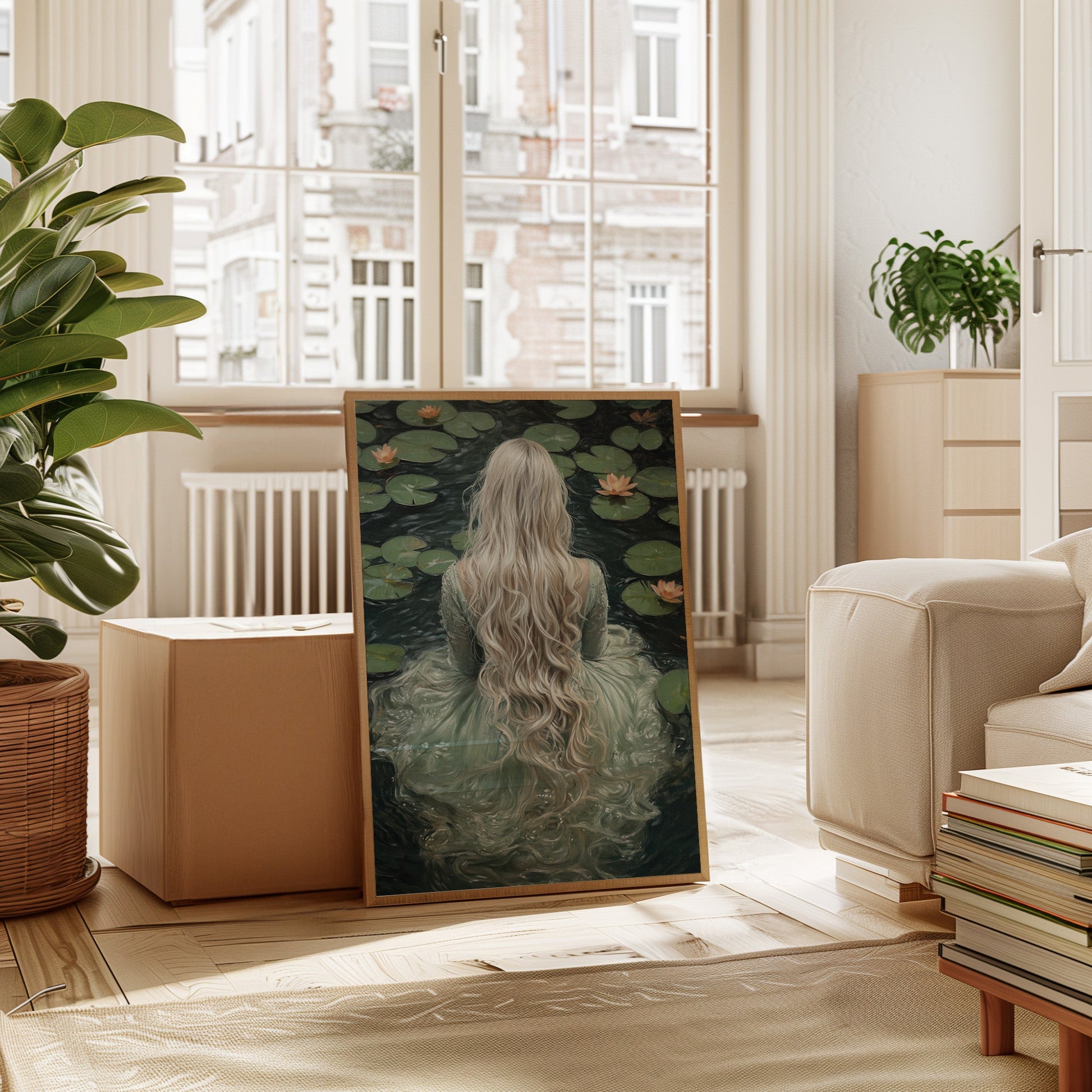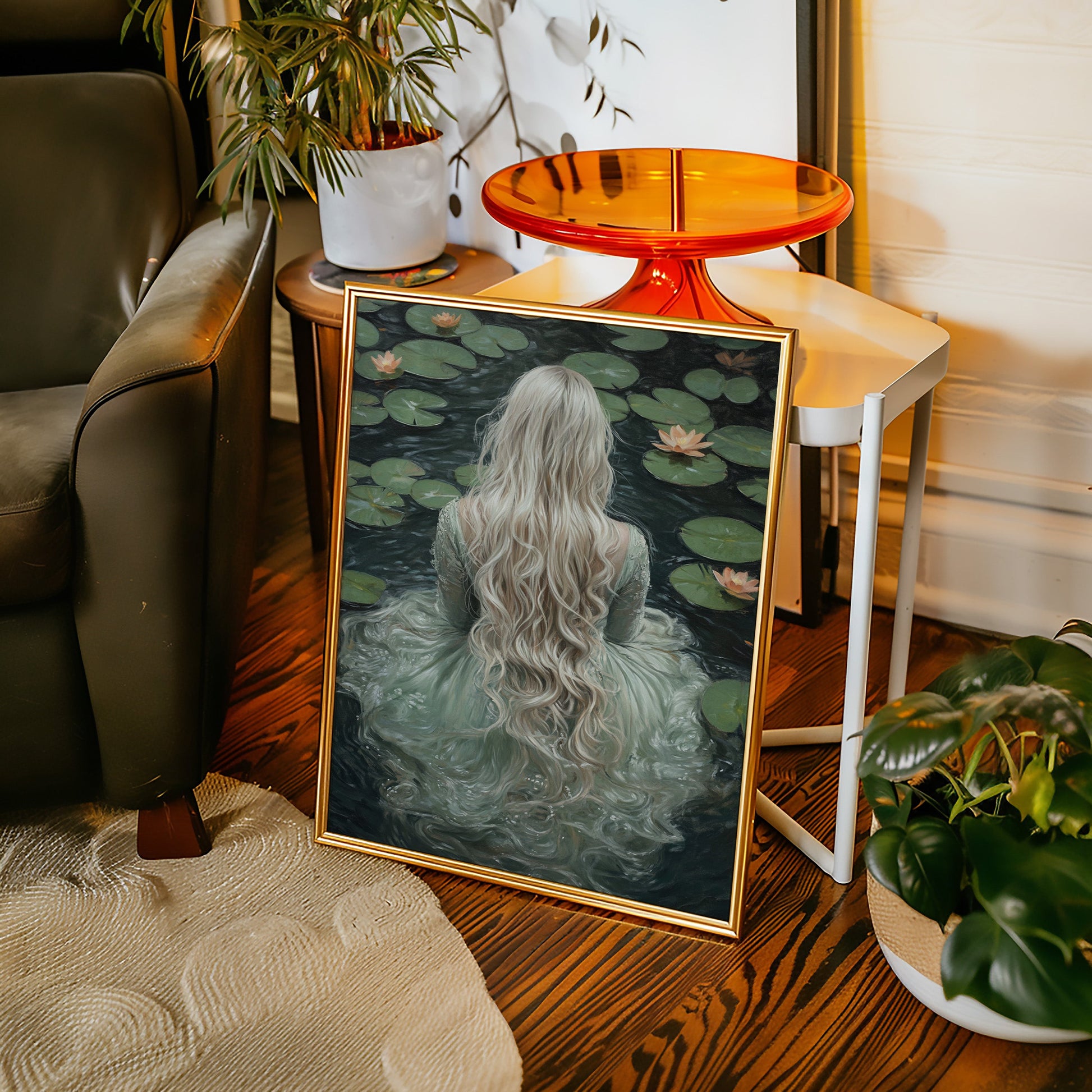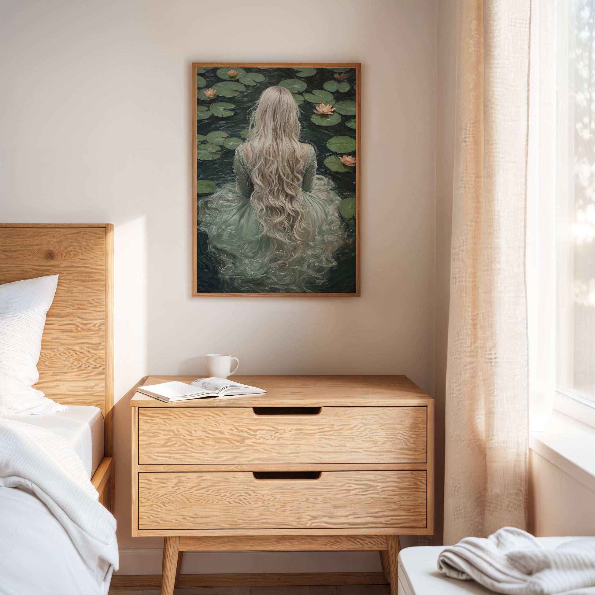 Immerse yourself in the ethereal tranquility of 'Serenity in Jade Waters.' This evocative piece captures the mystique of a lone figure surrounded by serene lily pads, her flowing locks cascading like whispers of dreams. The hues of jade and muted earth tones invite a sense of calm and introspection, making it a perfect addition to spaces yearning for a touch of the mystical. Let the gentle embrace of this artwork transform your room into a sanctuary of peace and wonder.
