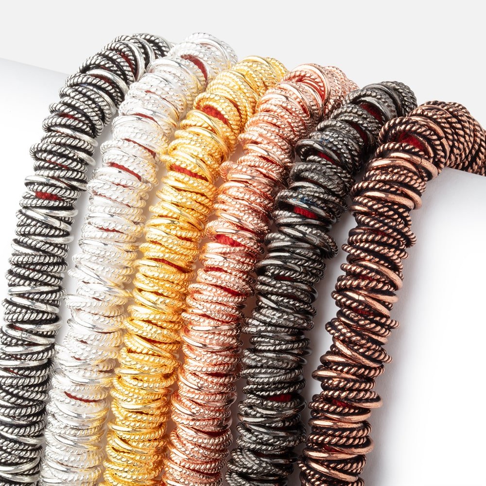 10mm Mobius Spacers with two twisted rings and one plain ring have a large hole measuring 5mm inside and are plated over copper. This 8 inch strand with approximately 82 beads is available in 22kt Gold, Silver, Antiqued Silver, Rose Gold, Black Gold, and Antiqued Solid Copper.