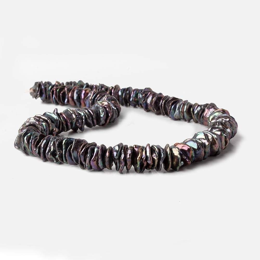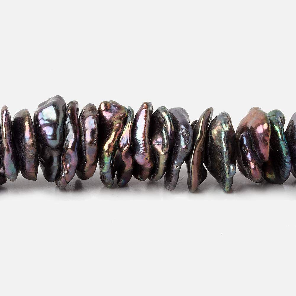 Peacock Keshi Freshwater Pearls have been center drilled for varied usage with a cornflake-like Keshi shape and multi-color iridescent orient on these peacock pearls which are well matched on the strand for size, treated color, quality, luster, and shape.