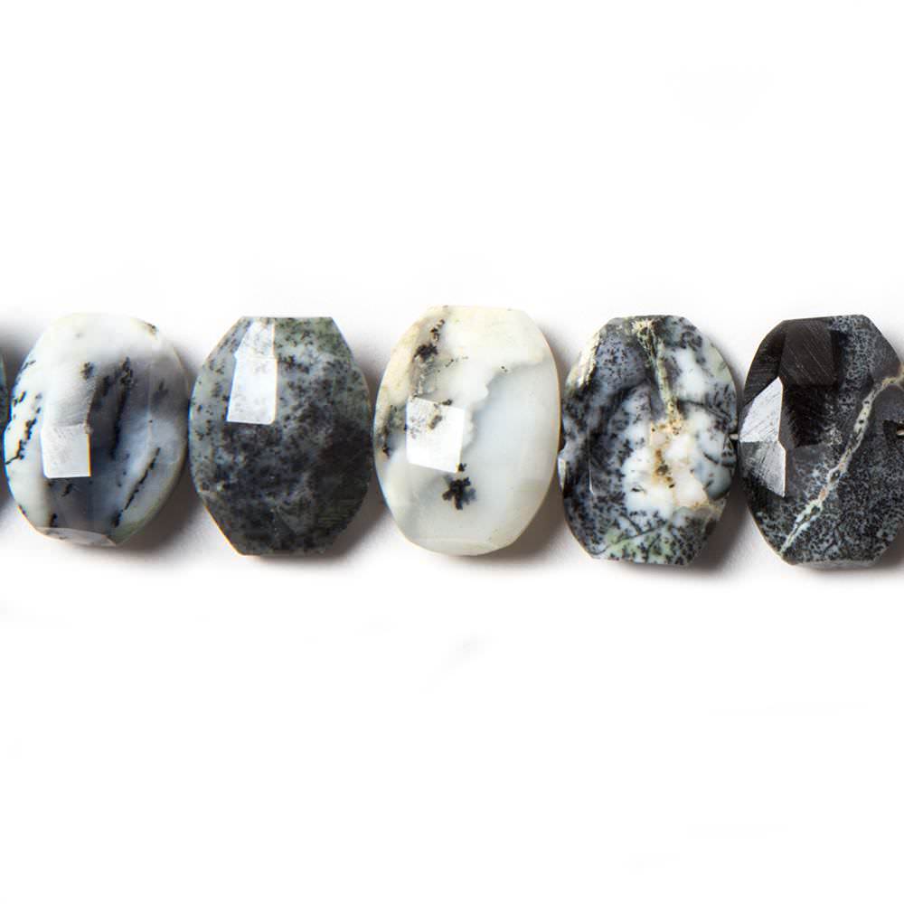 Dendritic Opal side drilled Faceted Cushion Beads have excellent polish and a symmetrical shape, are well matched on strand with an opaque quality, body color is a light milky white hue showing black dendrites, and these are nicely made Brazilian Dendritic Opals.