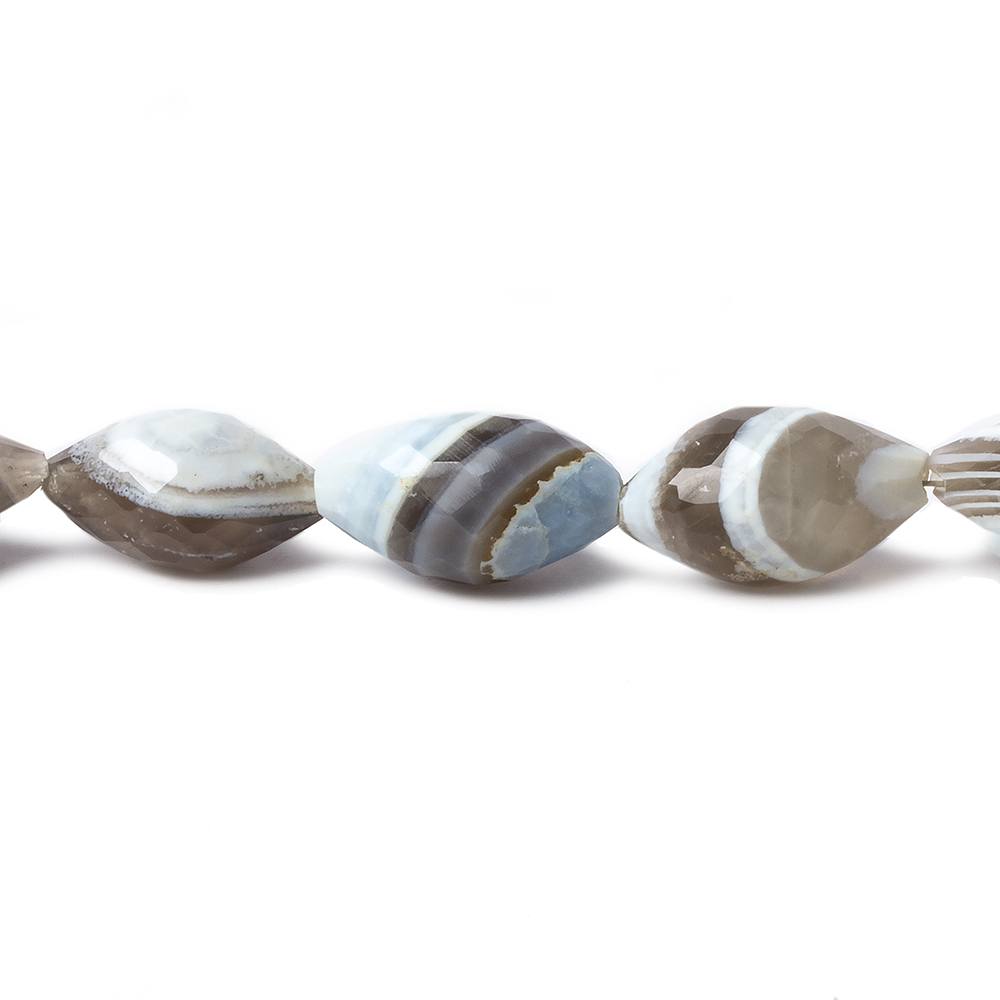 Denim Blue Opal and Banded Agate Marquise Beads have a vitreous luster to chalky luster exhibit excellent faceting and show striated coloring of a champagne hue, a denim blue hue and a light blue hue creating a striking patterning. The gems are symmetrical in shape, extremely well matched, and are a variety of banded Grey Agate which forms in bands along with common blue opal.
