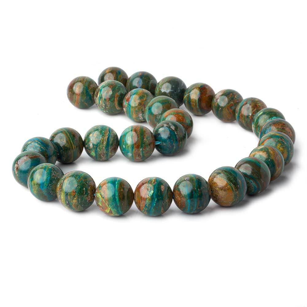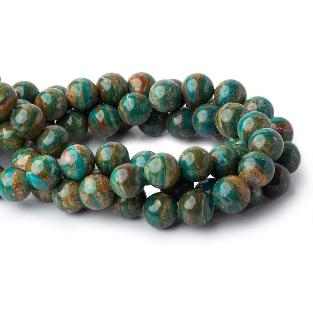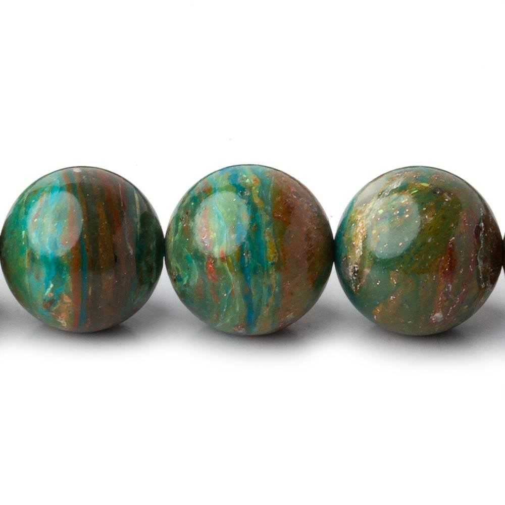 Peruvian Blue Opal plain round beads have a waxy luster, exhibit great polish, show a symmetrical round shape, have excellent depth of color, and are well matched for quality throughout the strand. These Blue Opal plain rounds exhibit moderately dark, beautiful brown and tan matrix hues with bead color ranging from a dark strongly greenish blue hue to a medium olive green hue to a medium light grayish blue hue. These Peruvian Blue Opal rounds are an opaque quality mined from Andes Mountains of Peru. AA grade