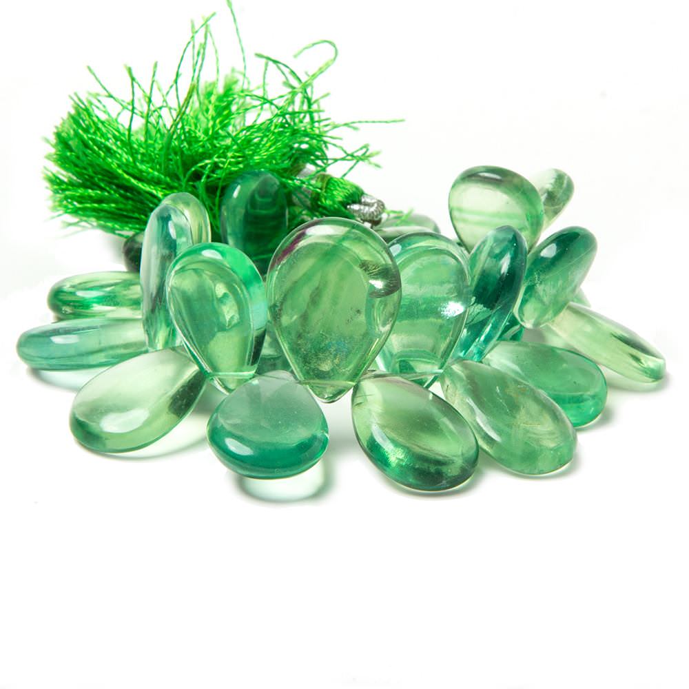 Mint Green Fluorite Plain Pears have a waxy luster, beads are symmetrical in shape, the polish is excellent, are transparent showing internal characteristics, and the body color is a medium mint green hue which are extremely well matched for tone and quality on the strand.