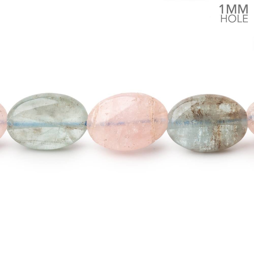 14x10mm Multi Variety Beryl straight drilled unfaceted oval beads are superbly polished showing a vitreous luster on their translucent bodies which are a lovely symmetrical oval shape. This group of Beryl contains Morganite, Aquamarine, and Moss Aquamarine. 1mm drilled diameter hole