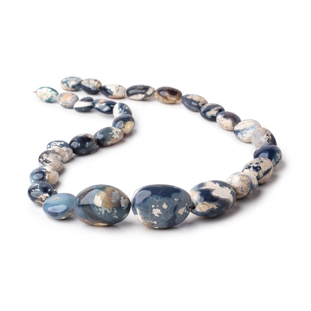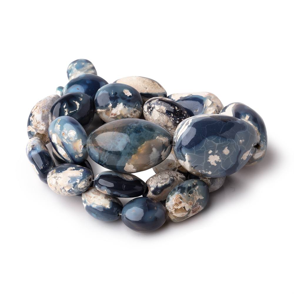 Australian Opal Plain Nugget Beads have an asymmetrical shape showing opaque to translucent areas of blue-grey opals with vibrant Play of Color and an organic appearance due to areas of matrix which add soft creamy beige hues. Larger than average size for a spectacular grouping having a polished body with areas of pitting due to surface irregularities of the natural Opal. AA Quality