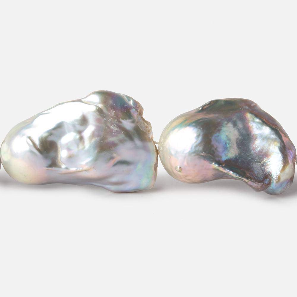 28mm length x 16mm diameter up to 36mm length x 15mm diameter Silver with slight Rose' Overtone Ultra Baroque Freshwater Pearls show an irregular surface on these asymmetrical shapes of excellent nacre & high luster. The color is a natural Silver body showing a lilac purple overtone. These straight drilled pearls exhibit the best of baroque freshwater pearls with their size which is much larger than average and their luster which is near appearance to a 'South Sea' Pearl. The strand is well matched for strong orient, quality, color, and beauty providing for the AAA Quality Grade.