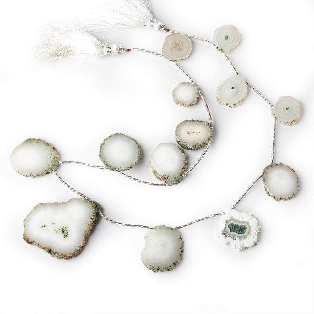 Chlorite included Solar Quartz Top Drilled Slices measure approximately 15x15x3mm to 40x31x5mm in size, measure 4mm in approximate depth, polish is very good, luster is glass like, shapes are cut from the natural quartz crystal horizontally, each of the beads is well matched for body color of a light milky white hue and a mid-area feature of chlorite, some of the beads have pitting due to the internal features reaching the surface, the bead edge may shows chlorite elements and shape irregularities, this strand is a unique top drilled shape with an opaque quality, and the gems are sized and colored to provide a beautiful group of Chlorite included Solar Quartz which are formed from Stalactites.