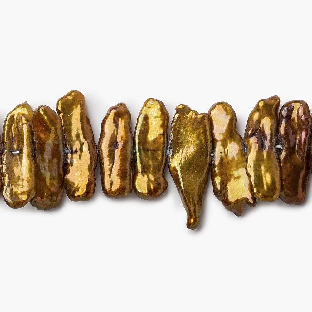 Copper side drilled Biwa freshwater pearl grades as excellent luster, excellent biwa shapes, excellent nacre quality, measures approximately 15mm average length, and excellent strand matching.