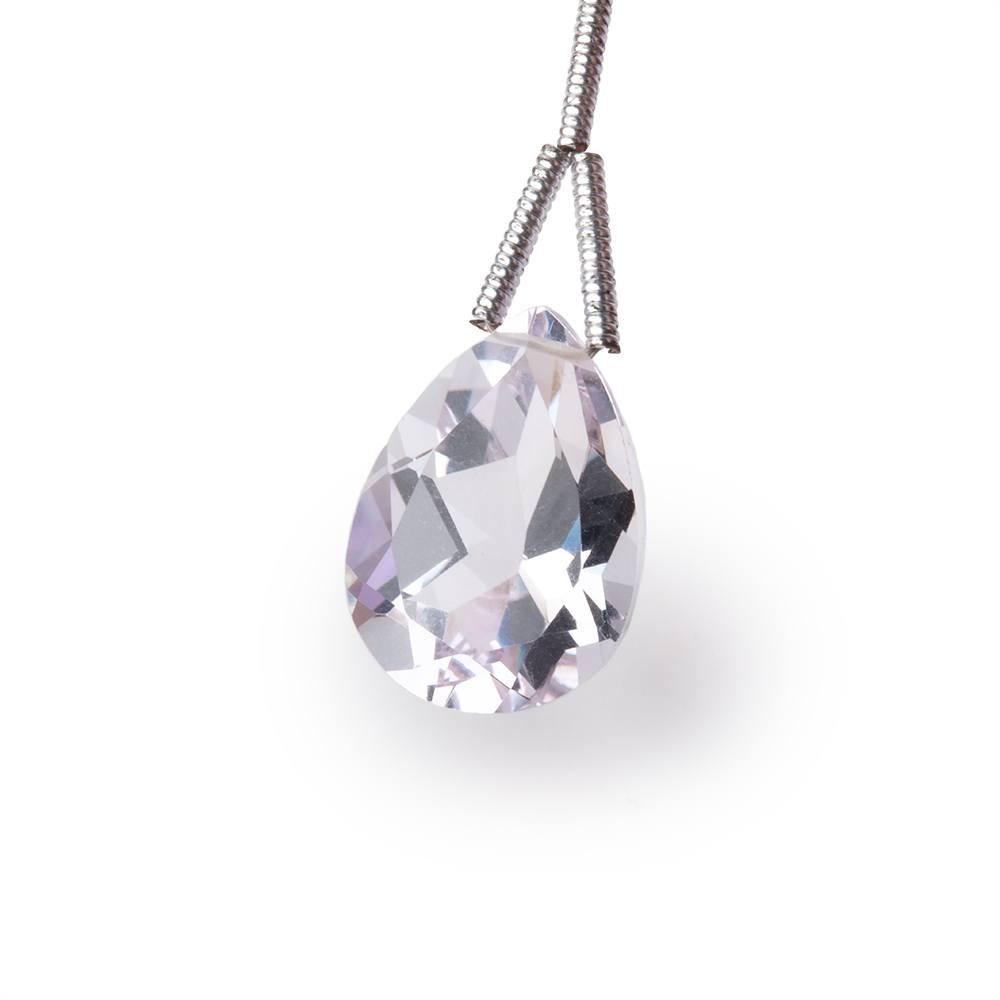 Pink Amethyst pavilion faceted pears have a vitreous luster with excellent polish and faceting creating symmetrical shapes. There is consistent pale purple color with pavilion faceting and a flat table. This Pink Amethyst focal bead is a translucent AAA quality gemstone with a pale purple hue and high brilliance.
