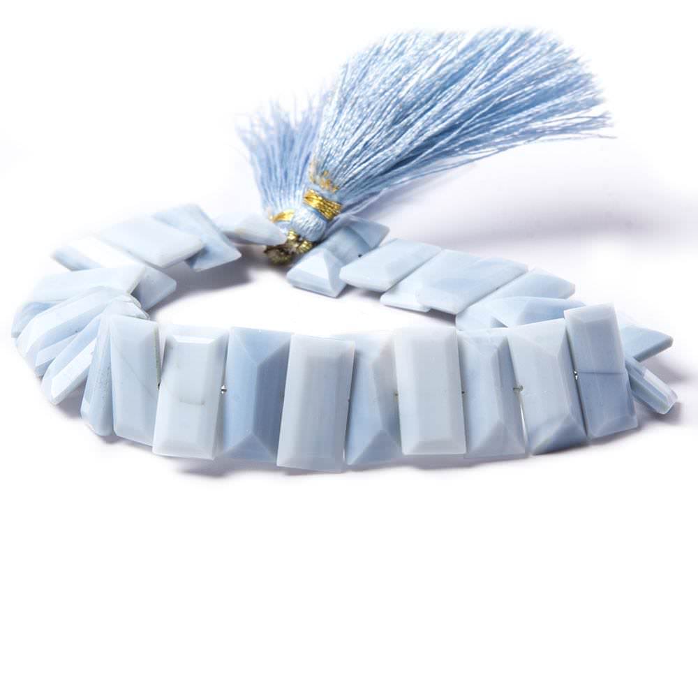 15x7x4.5mm average Owyhee Natural Denim Blue Opal Faceted Cubes have a waxy luster, exhibit excellent faceting and polish on the side drilled emerald cut with pavilion. These emerald cut Blue Opal beads are symmetrical in shape with a consistent tone throughout the strand. The natural color is a medium light slightly greyish denim blue for a very soothing group of Blue Opal beads mined in Oregon, USA.