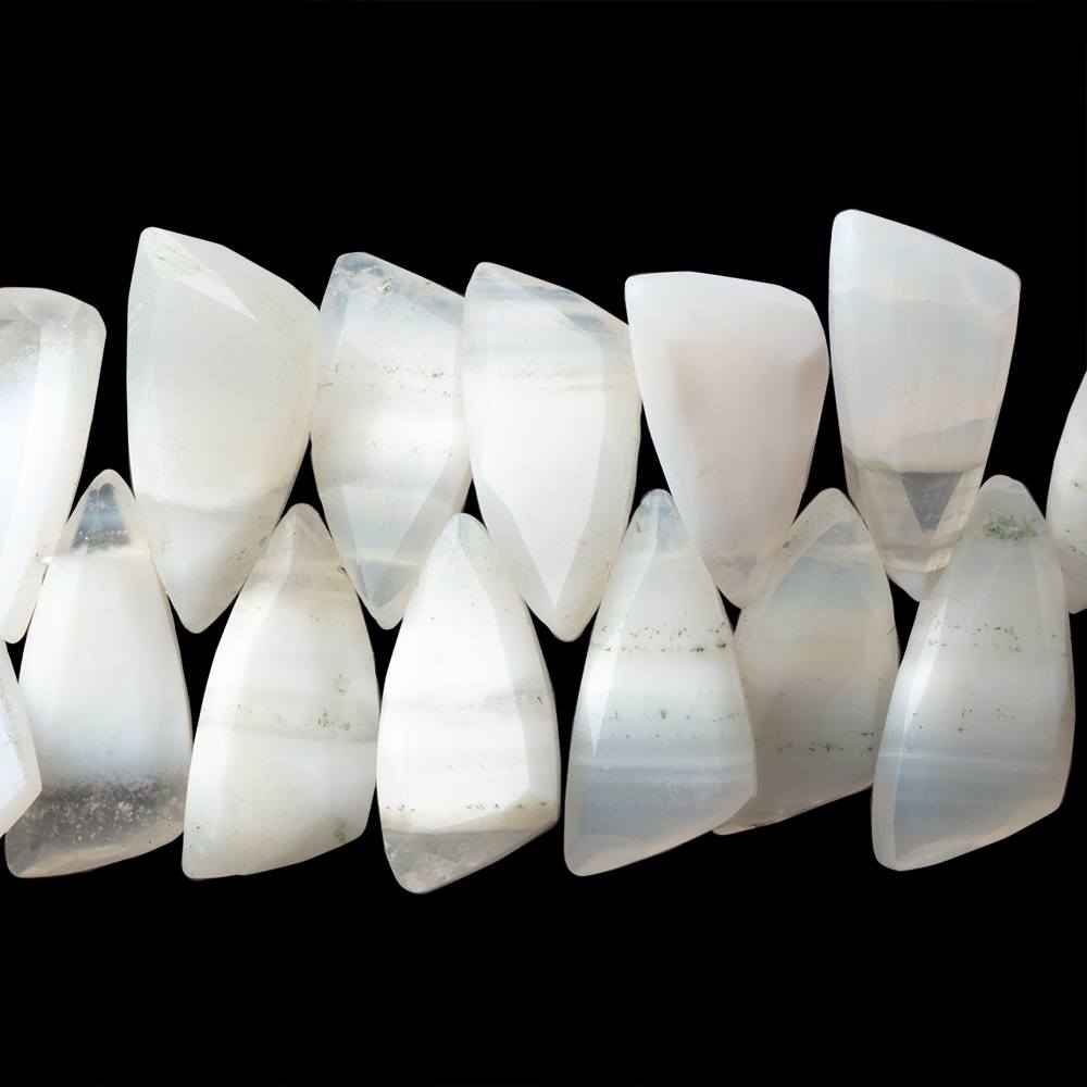Banded Agate faceted Fancy Shape Briolette Beads show great polish, an asymmetrical shape, and exhibiting a multi-toned bead in light to deeply saturated creamy white and gray hues. A well matched group of uniquely shaped and appealing banded Agate faceted briolette beads. AA Quality