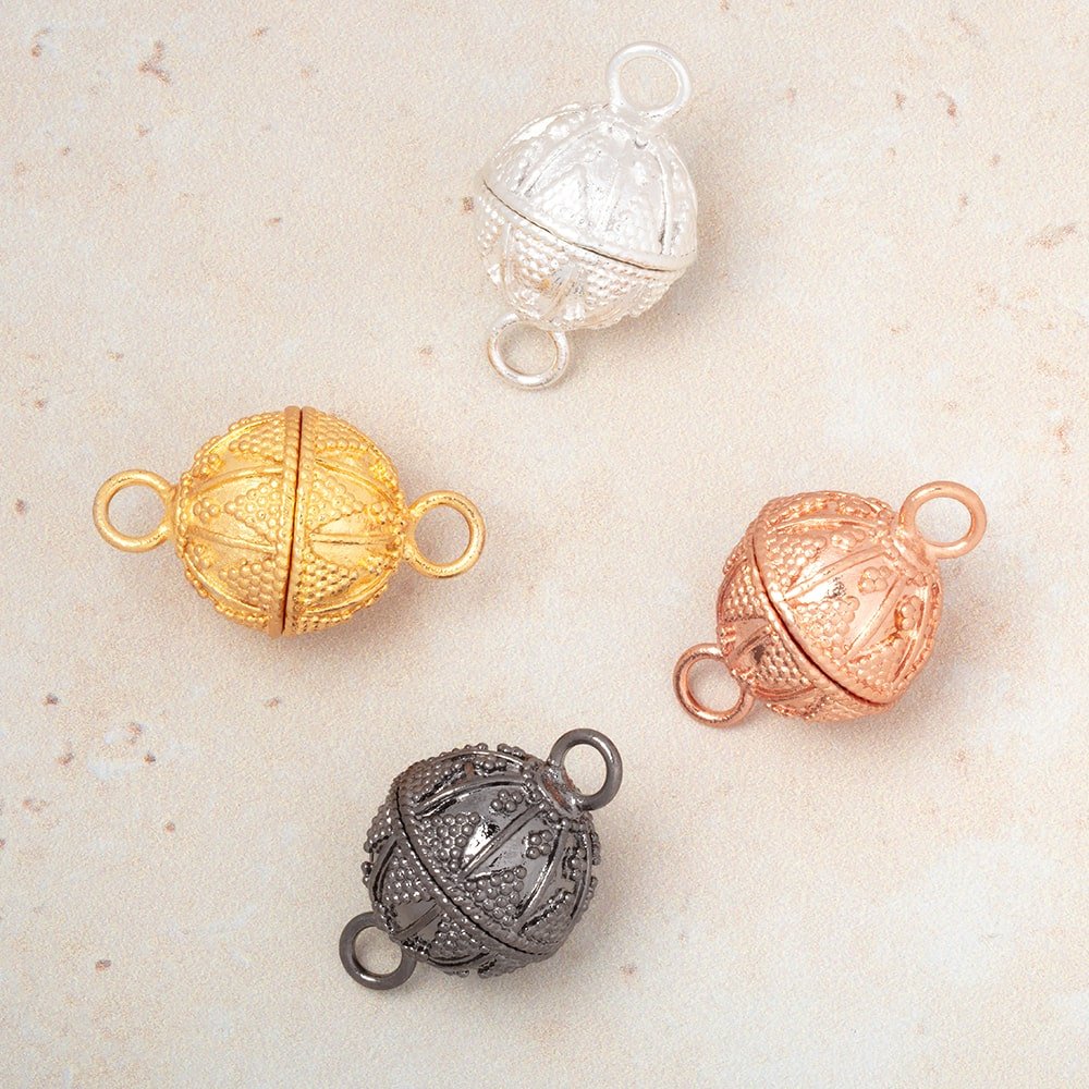 17.5mm Plated Round shaped Magnetic Clasps with a Triangular Miligrain design are sold as 1 finding and have two 6mm rings at each end with approximately 4mm inside diameter holes. The overall length of this clasp is approximately 28mm. This Magnetic Clasp is available in 22kt Gold Plated, Silver Plated, Rose Gold Plated, and Black Gold Plated.