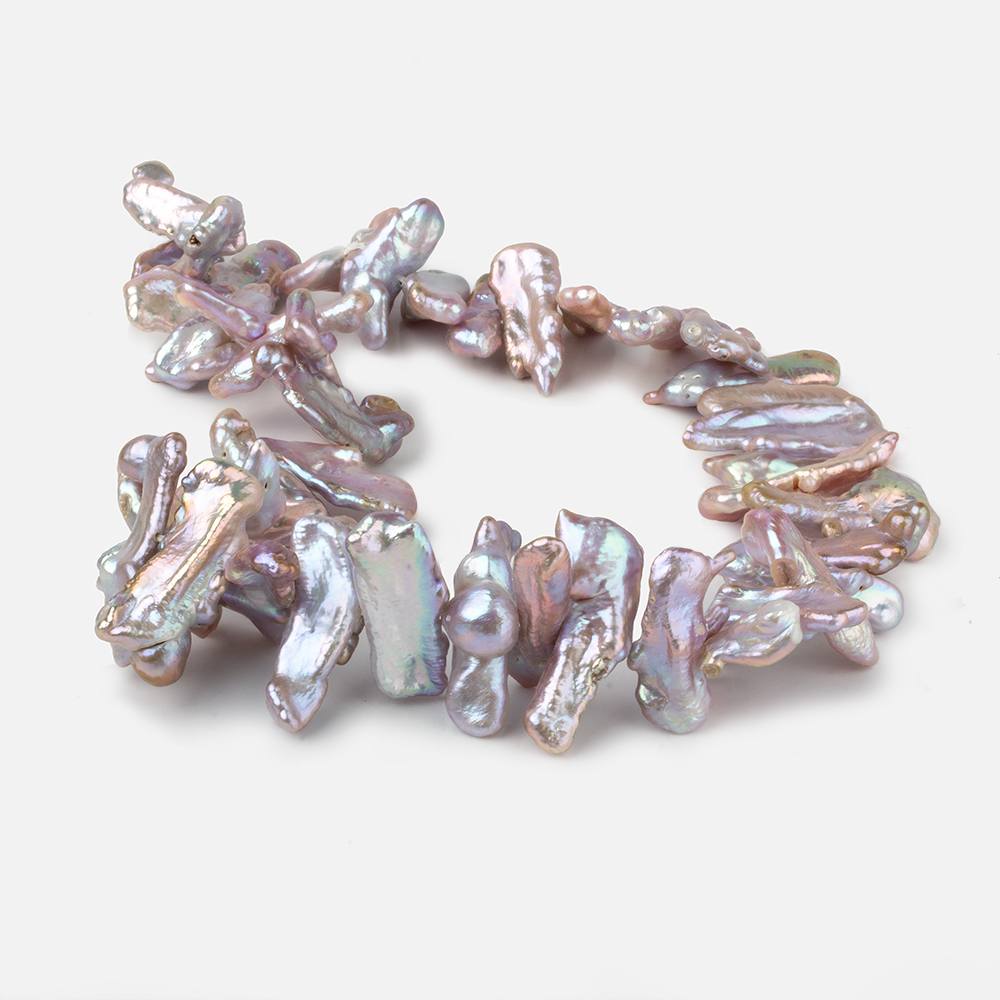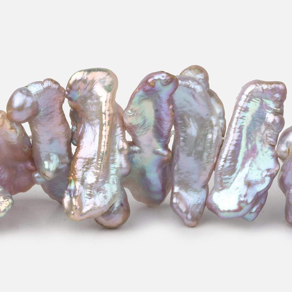 Lilac Peacock Side Drilled Biwa Freshwater Pearls 15 inch strand of approximately 43 pearls of an AA grade measuring approximately 18x10mm to 29x9mm having iridescent orient for these stick or Biwa shape pearls having a wonderful size, a lilas purple hue with iridescent orient, standard drill hole, great shape and good luster.