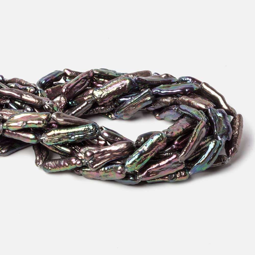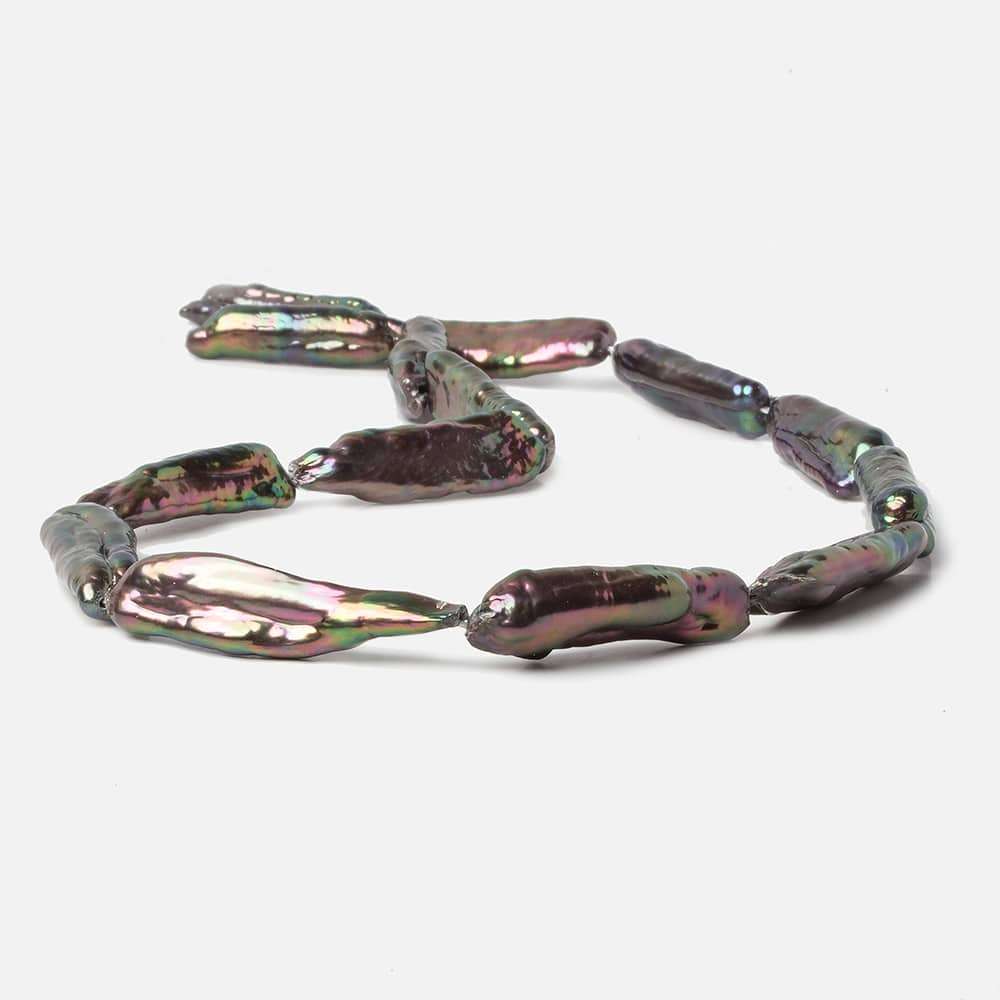 Peacock Straight Drilled Biwa Freshwater Pearls measure approximately 18x9mm to 27x8mm, show good luster, good nacre with minute pitting, good asymmetrical shape of average size, drill holes are from the north to south direction, pearls are well matched on the strand, and pearls show a base color of a dark grey with Iridescent multi-color Peacock overtones.