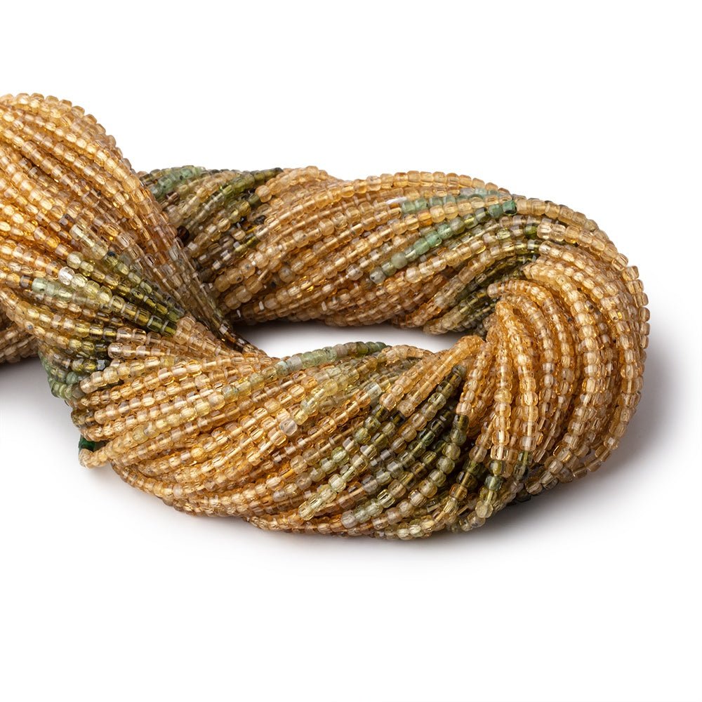 2.2mm average Multi Color Tourmaline micro faceted cube beads have a highly vitreous luster, a symmetrical cube shape with a bevel edge micro fine faceting, a well matched transparent quality, and a well crafted group of Tourmaline in gold, brown, and green shades.