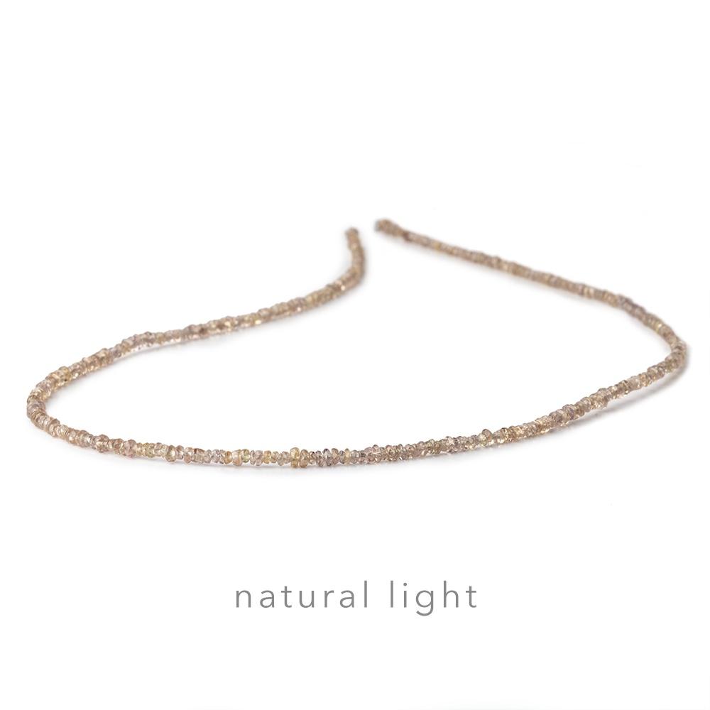 Color Change Garnet Faceted Rondelles measure approximately 2mm to 3mm in diameter, have a vitrous luster, excellent brilliance created by good faceting, the polish is excellent in this transparent gem, the rondelle shape is symmetrical, the beads are well matched for tone, and the bodycolor changes from a light very slightly greenish brown hue to a light brown hue in differing light sources.