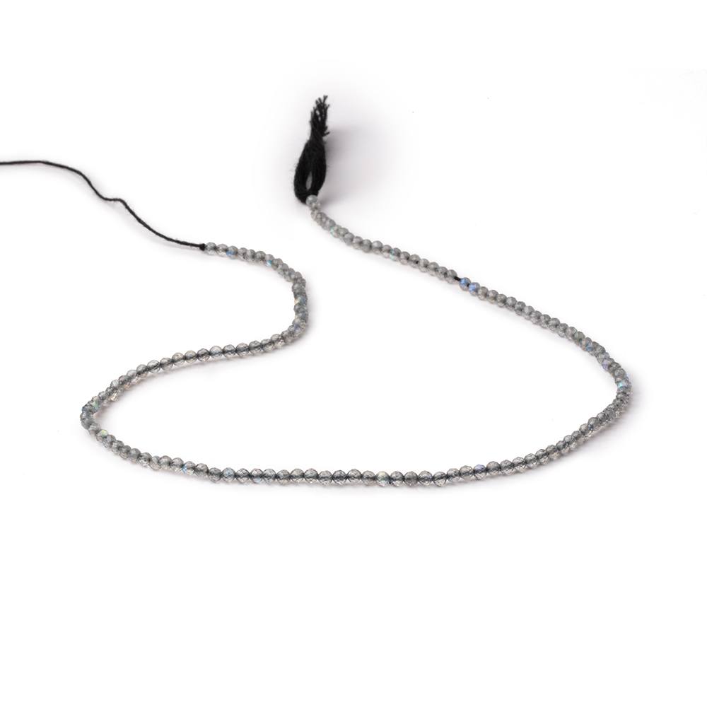 2.3mm Labradorite micro faceted round beads have a brilliant light grey body showing light blue flash and a vitreous luster on these expertly crafted beads showing excellent symmetry and a micro-fine faceting style.