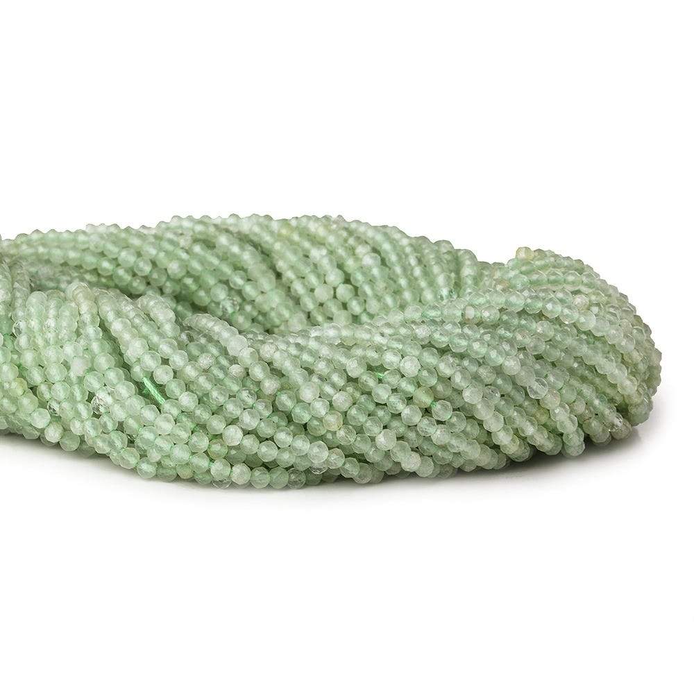 2.5mm Green Aventurine microfaceted round beads showing great brilliance, a symmetrical round shape, a well matched translucent quality, and a well crafted group of micro-fine faceted color treated beads.
