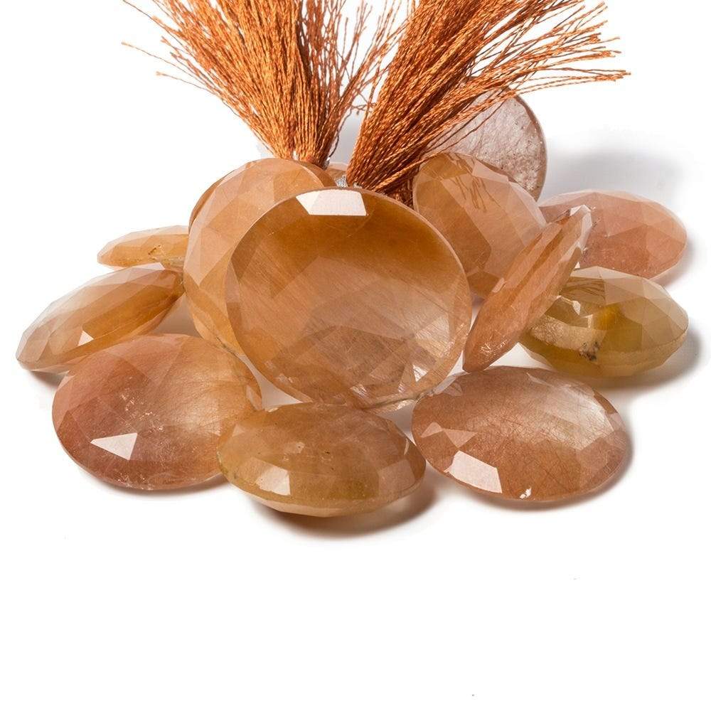 Butterscotch Rutilated Quartz Top Drilled Faceted Coins measure approximately 20-29mm in size, have a vitreous luster, a crystal quartz body with a butterscotch hue showing butterscotch colored metallic rutile, gems have a symmetrical shape with good faceting and good polish, a few stones have minor nicks, scratches or chips, the gems have internal characteristics, and the gems have an ample size throughout the approximate 15 piece strand.