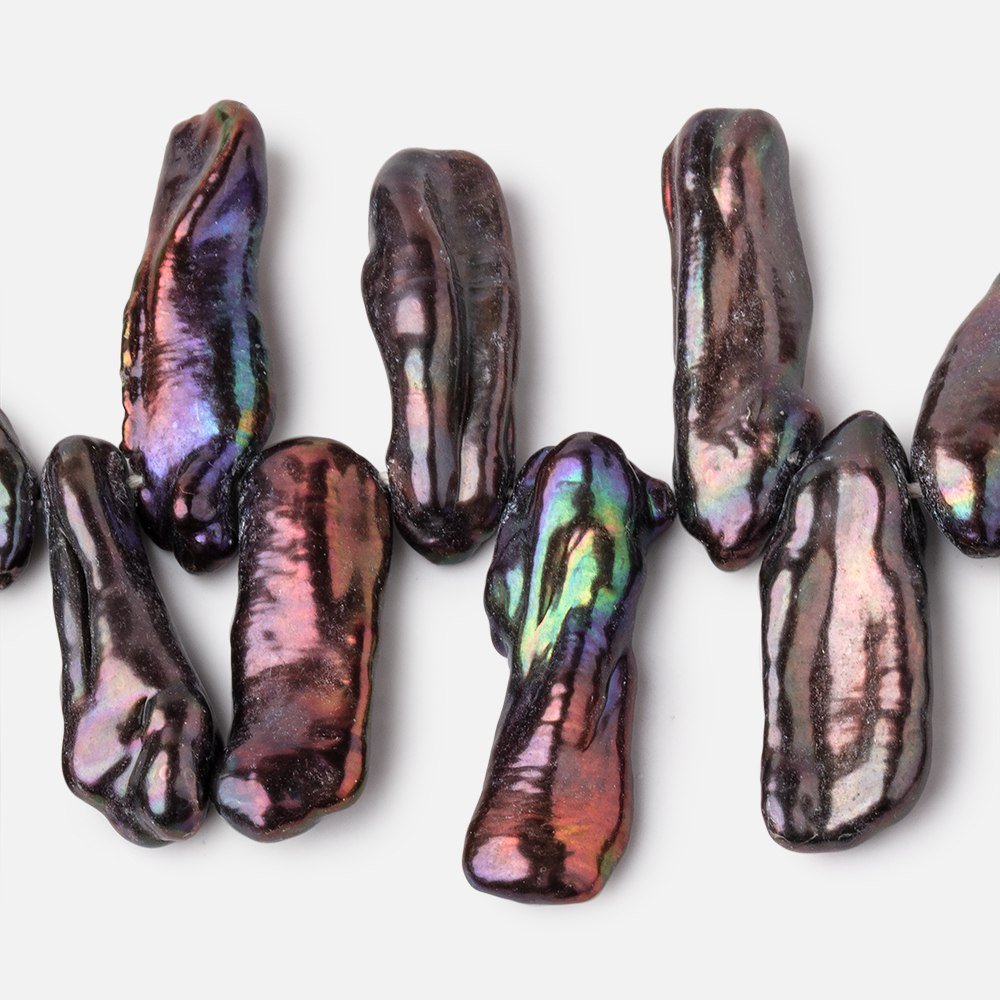 Peacock Top Drilled Biwa Freshwater Pearls measure approximately 21x8mm to 25x9mm, show good luster, good nacre with minute pitting, good asymmetrical shape of larger than average size, pearls are well matched on the strand, and pearls show a dark plum base color with strong Peacock overtone.